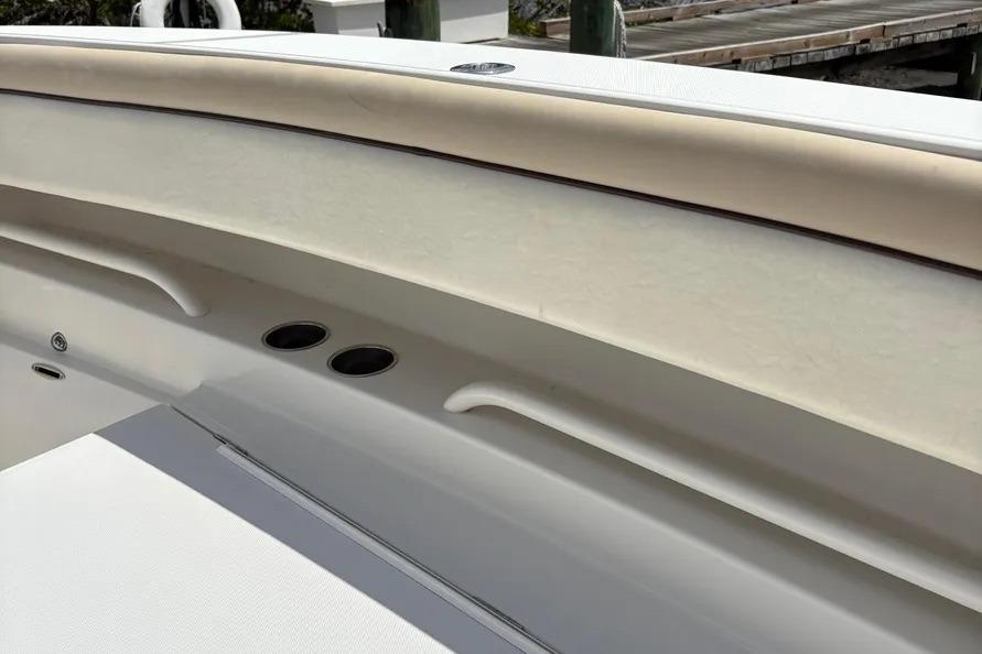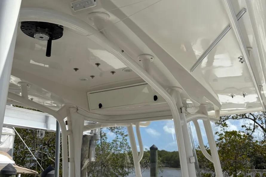 At the helm, twin Garmin displays (16″ below/7″ above) drive the autopilot and night-vision for confident navigation day or night. A new bow thruster (2023) pairs with precise throttles for easy docking, and the 2,000-watt Fusion/JL system keeps the crew energized between stops. With triple Yamaha 300s, a 485-gal fuel capacity and Jupiter’s proven deep-V, you’ll cruise efficiently in the low-30-knot range and still have punch to chase the bite.