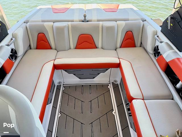The fiberglass GRP hull under that gel has the Diamond shaped hull for quicker time to plane. It is powered by an Indmar 6.2L Monsoon 410 Engine that produces 398 horsepower and can reach speeds of 40 MPH as well as produce wakes for the most ardent of wakeboarders.