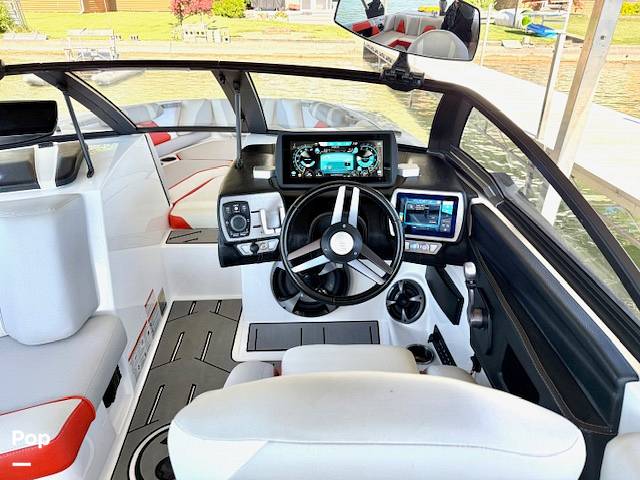 The helm command center is an electronic marvel keeping up with the rest of the technology of the Malibu. Starting to the captain's left you have the sport dash Rotary dial tactile buttons that control the surf gate and powered wedge and your cell phone holder. The handcrafted bolster dashboard 12-inch HD wide screen for the Viper 2 system which replaces all of the gauges and meters boaters are used to. It is by far and away the most user intuitive and easiest system to use of any boat in this class. The owner loves it! The Malibu touch command system to your right houses all of your auxiliary functions.