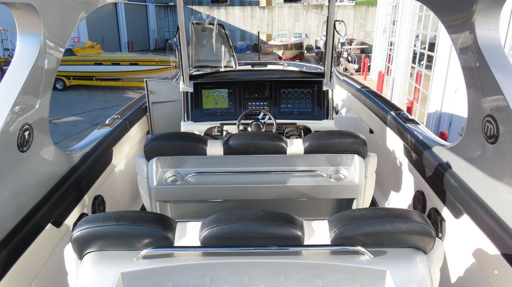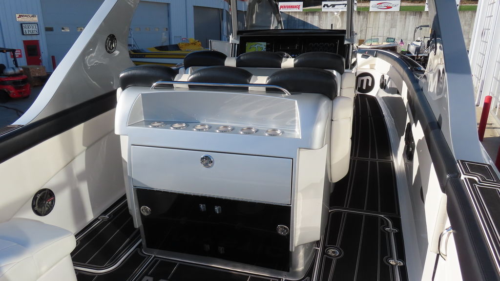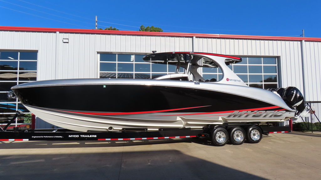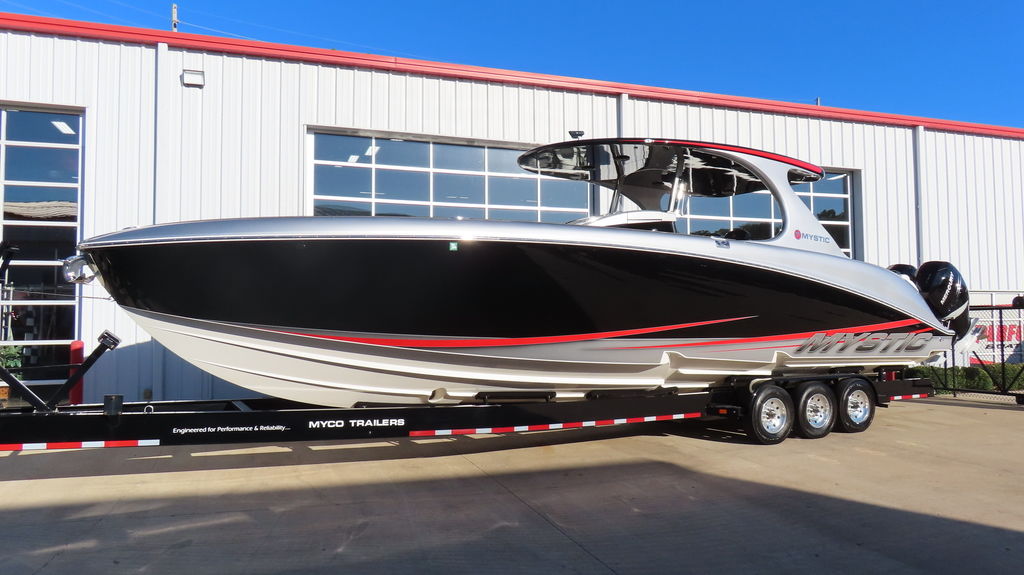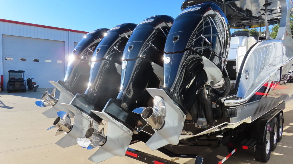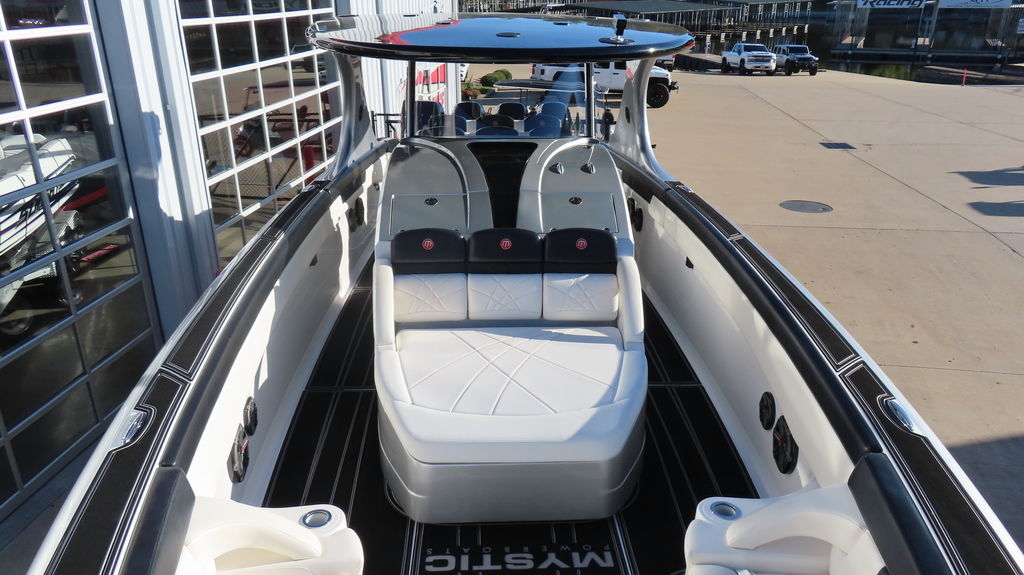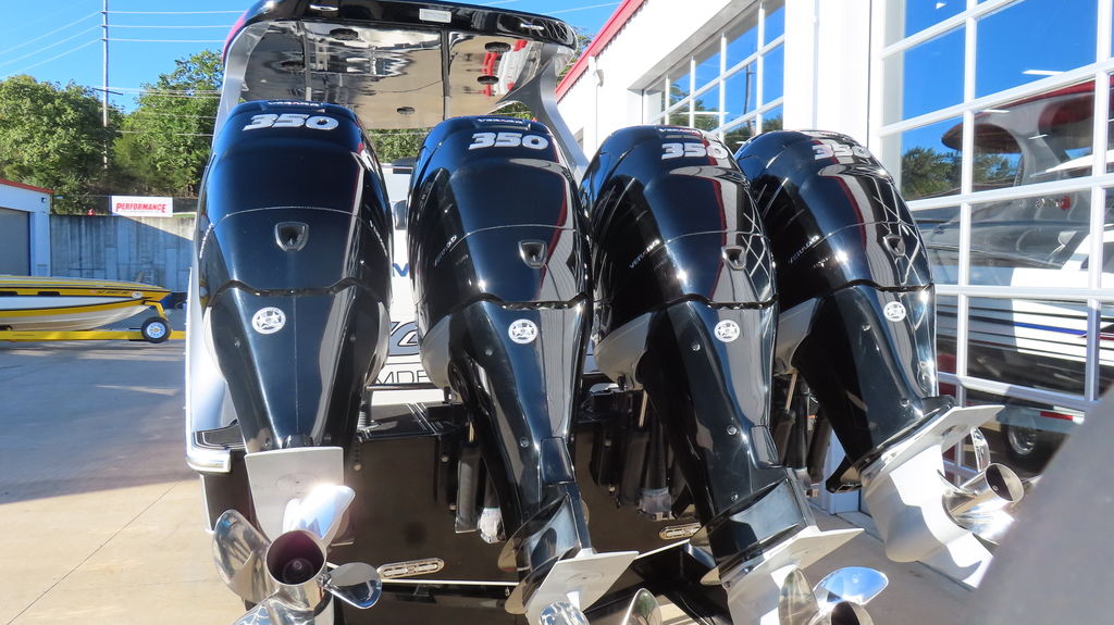 2017 Mystic M4200 powered by Quad Mercury Verado 350, Mercury DTS controls, Mercury vesselview, Trim tabs, (2) Garmin GPS, Bow Thruster, Isotta steering wheel, Sea Deck flooring, Two rows of bolsters, Center Lounge chair, Bow seating, Fusion stereo with helm remote, JL Audio component speakers throughout, Garmin VHF, Gunnel wing doors, Large cabin with flush head, Sink, Refrigerator, seating area, Flat screen TV, Microwave, Billet push button controls, Wash down, Windless anchor, Wireless phone charging, No trailer.