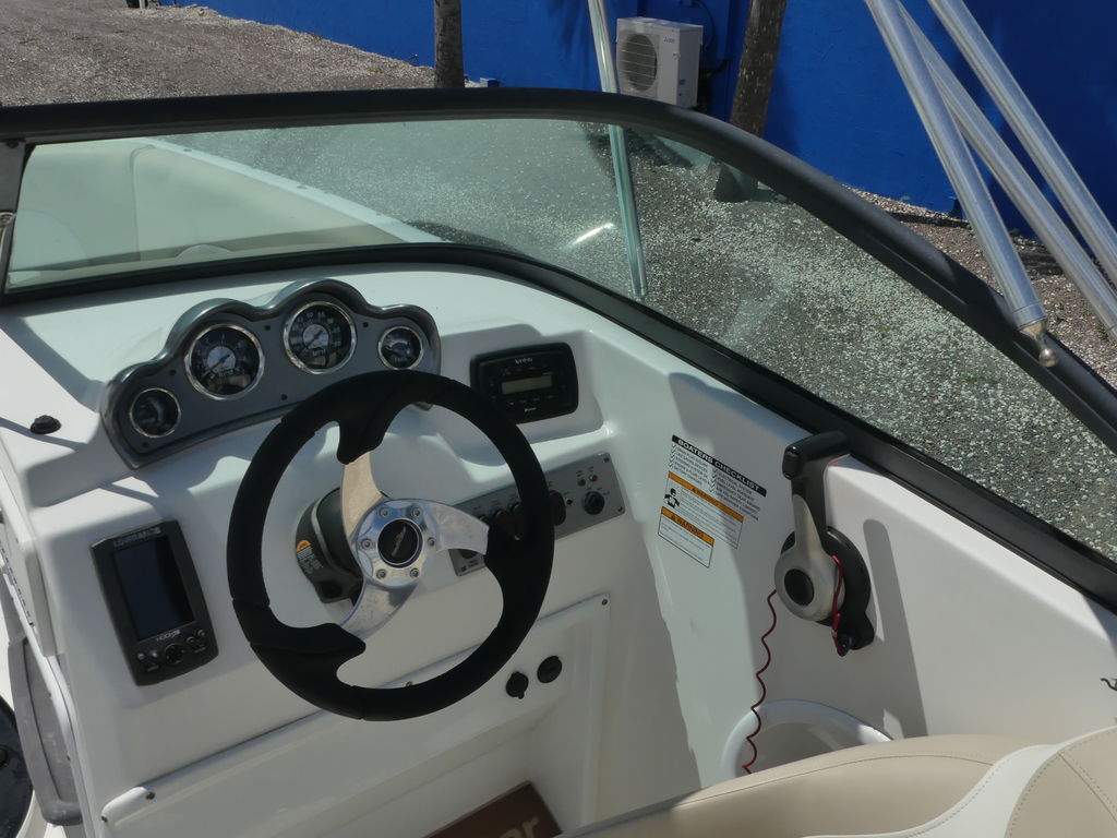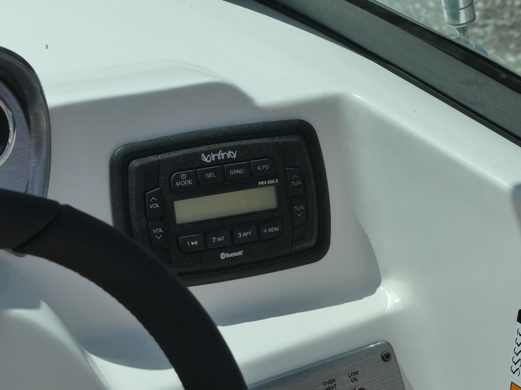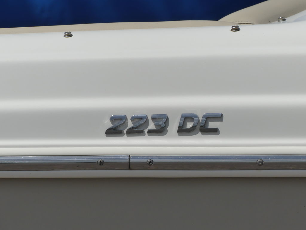 Enjoy the drive and ride of a V-Hull and beach party capacity of a deck style boat with the new generation design of the 223 DC. Runabout styling-deck boat efficient, the 223 DC has it all. Convenience and comfort features include a panoramic wraparound walk-thru windshield, portside mid-ship enclosed dressing room, and “leather touch upholstery”. Some of the construction and design features include 11 drink holders, 7 storage compartments and 100% wood free construction. Top that off with the Infinity® stereo system with 4-waterproof speakers and you will show up to the beach party in comfort and style in the 223 DC.