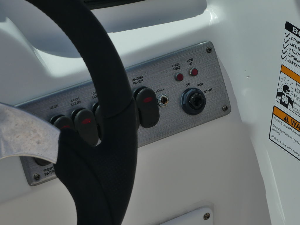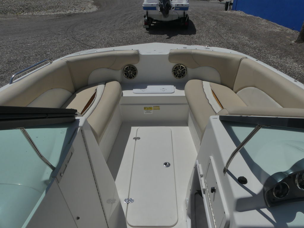 Enjoy the drive and ride of a V-Hull and beach party capacity of a deck style boat with the new generation design of the 223 DC. Runabout styling-deck boat efficient, the 223 DC has it all. Convenience and comfort features include a panoramic wraparound walk-thru windshield, portside mid-ship enclosed dressing room, and “leather touch upholstery”. Some of the construction and design features include 11 drink holders, 7 storage compartments and 100% wood free construction. Top that off with the Infinity® stereo system with 4-waterproof speakers and you will show up to the beach party in comfort and style in the 223 DC.
