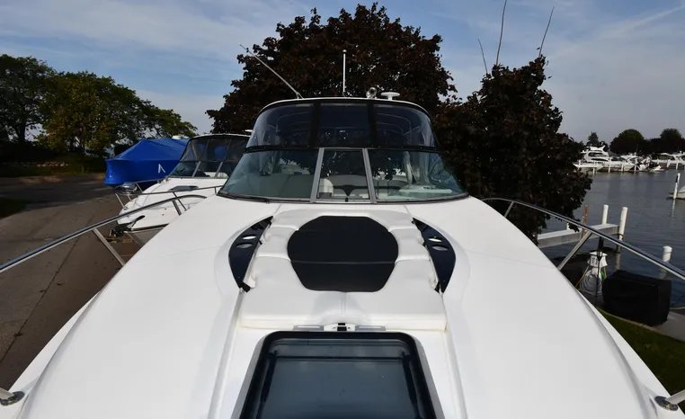 Freshwater / Great Lakes boat since new this vessel features Twin MerCruiser 350-Mag 300-hp Gas Engine's with Bravo III Sterndrives and only 214 original hours. Notable features include but are not limited to the following: Air-Conditioning & Heat (1-Unit), Head (Techna) w/Vanity/Sink/Shower, Built-In Screen Door, Walk Through Windshield, Windlass Anchor, Sun-Pad, Canvas Enclosure w/Forward Poly-Carbonite Windows, Cockpit Wet Bar w/Sink/Refrigerator, Blender, Power Engine Hatch, Raymarine Color NAV-System, Premium Sound System w/Bluetooth, Snap-in Snap-out Cockpit Carpeting (2 Sets), Bow and Stern Thrusters with Remote and MUCH more!