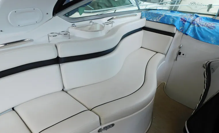 Freshwater / Great Lakes boat since new this vessel features Twin MerCruiser 350-Mag 300-hp Gas Engine's with Bravo III Sterndrives and only 214 original hours. Notable features include but are not limited to the following: Air-Conditioning & Heat (1-Unit), Head (Techna) w/Vanity/Sink/Shower, Built-In Screen Door, Walk Through Windshield, Windlass Anchor, Sun-Pad, Canvas Enclosure w/Forward Poly-Carbonite Windows, Cockpit Wet Bar w/Sink/Refrigerator, Blender, Power Engine Hatch, Raymarine Color NAV-System, Premium Sound System w/Bluetooth, Snap-in Snap-out Cockpit Carpeting (2 Sets), Bow and Stern Thrusters with Remote and MUCH more!