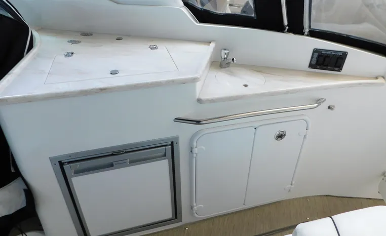 Freshwater / Great Lakes boat since new this vessel features Twin MerCruiser 350-Mag 300-hp Gas Engine's with Bravo III Sterndrives and only 214 original hours. Notable features include but are not limited to the following: Air-Conditioning & Heat (1-Unit), Head (Techna) w/Vanity/Sink/Shower, Built-In Screen Door, Walk Through Windshield, Windlass Anchor, Sun-Pad, Canvas Enclosure w/Forward Poly-Carbonite Windows, Cockpit Wet Bar w/Sink/Refrigerator, Blender, Power Engine Hatch, Raymarine Color NAV-System, Premium Sound System w/Bluetooth, Snap-in Snap-out Cockpit Carpeting (2 Sets), Bow and Stern Thrusters with Remote and MUCH more!