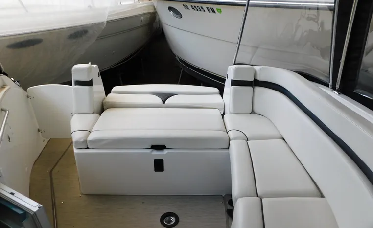 Freshwater / Great Lakes boat since new this vessel features Twin MerCruiser 350-Mag 300-hp Gas Engine's with Bravo III Sterndrives and only 214 original hours. Notable features include but are not limited to the following: Air-Conditioning & Heat (1-Unit), Head (Techna) w/Vanity/Sink/Shower, Built-In Screen Door, Walk Through Windshield, Windlass Anchor, Sun-Pad, Canvas Enclosure w/Forward Poly-Carbonite Windows, Cockpit Wet Bar w/Sink/Refrigerator, Blender, Power Engine Hatch, Raymarine Color NAV-System, Premium Sound System w/Bluetooth, Snap-in Snap-out Cockpit Carpeting (2 Sets), Bow and Stern Thrusters with Remote and MUCH more!
