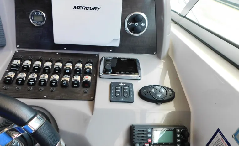Freshwater / Great Lakes boat since new this vessel features Twin MerCruiser 350-Mag 300-hp Gas Engine's with Bravo III Sterndrives and only 214 original hours. Notable features include but are not limited to the following: Air-Conditioning & Heat (1-Unit), Head (Techna) w/Vanity/Sink/Shower, Built-In Screen Door, Walk Through Windshield, Windlass Anchor, Sun-Pad, Canvas Enclosure w/Forward Poly-Carbonite Windows, Cockpit Wet Bar w/Sink/Refrigerator, Blender, Power Engine Hatch, Raymarine Color NAV-System, Premium Sound System w/Bluetooth, Snap-in Snap-out Cockpit Carpeting (2 Sets), Bow and Stern Thrusters with Remote and MUCH more!