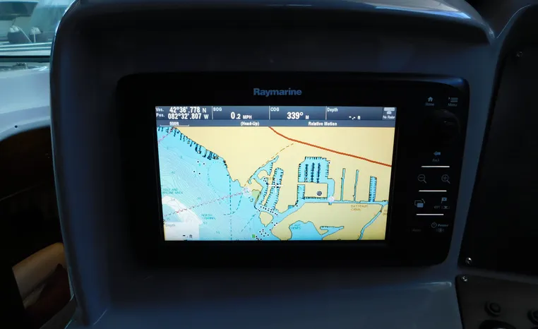 Freshwater / Great Lakes boat since new this vessel features Twin MerCruiser 350-Mag 300-hp Gas Engine's with Bravo III Sterndrives and only 214 original hours. Notable features include but are not limited to the following: Air-Conditioning & Heat (1-Unit), Head (Techna) w/Vanity/Sink/Shower, Built-In Screen Door, Walk Through Windshield, Windlass Anchor, Sun-Pad, Canvas Enclosure w/Forward Poly-Carbonite Windows, Cockpit Wet Bar w/Sink/Refrigerator, Blender, Power Engine Hatch, Raymarine Color NAV-System, Premium Sound System w/Bluetooth, Snap-in Snap-out Cockpit Carpeting (2 Sets), Bow and Stern Thrusters with Remote and MUCH more!