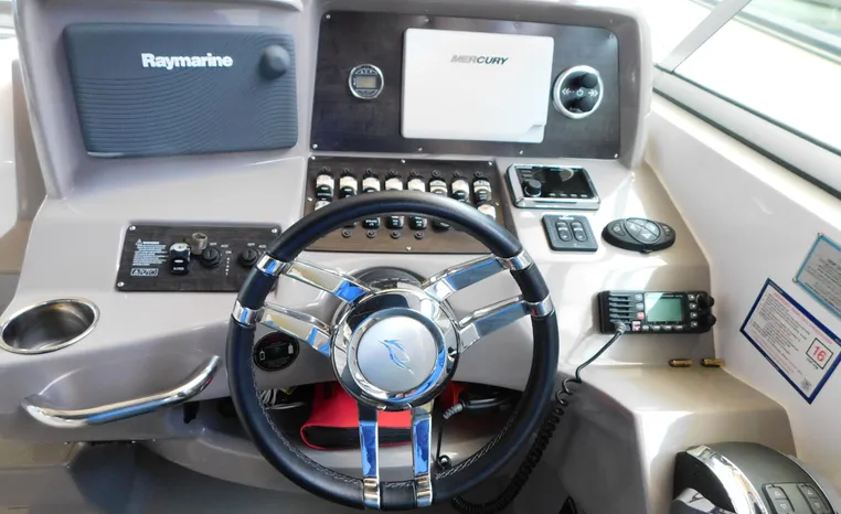 Freshwater / Great Lakes boat since new this vessel features Twin MerCruiser 350-Mag 300-hp Gas Engine's with Bravo III Sterndrives and only 214 original hours. Notable features include but are not limited to the following: Air-Conditioning & Heat (1-Unit), Head (Techna) w/Vanity/Sink/Shower, Built-In Screen Door, Walk Through Windshield, Windlass Anchor, Sun-Pad, Canvas Enclosure w/Forward Poly-Carbonite Windows, Cockpit Wet Bar w/Sink/Refrigerator, Blender, Power Engine Hatch, Raymarine Color NAV-System, Premium Sound System w/Bluetooth, Snap-in Snap-out Cockpit Carpeting (2 Sets), Bow and Stern Thrusters with Remote and MUCH more!
