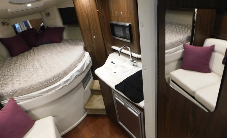 Freshwater / Great Lakes boat since new this vessel features Twin MerCruiser 350-Mag 300-hp Gas Engine's with Bravo III Sterndrives and only 214 original hours. Notable features include but are not limited to the following: Air-Conditioning & Heat (1-Unit), Head (Techna) w/Vanity/Sink/Shower, Built-In Screen Door, Walk Through Windshield, Windlass Anchor, Sun-Pad, Canvas Enclosure w/Forward Poly-Carbonite Windows, Cockpit Wet Bar w/Sink/Refrigerator, Blender, Power Engine Hatch, Raymarine Color NAV-System, Premium Sound System w/Bluetooth, Snap-in Snap-out Cockpit Carpeting (2 Sets), Bow and Stern Thrusters with Remote and MUCH more!