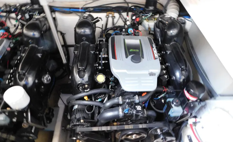 Freshwater / Great Lakes boat since new this vessel features Twin MerCruiser 350-Mag 300-hp Gas Engine's with Bravo III Sterndrives and only 214 original hours. Notable features include but are not limited to the following: Air-Conditioning & Heat (1-Unit), Head (Techna) w/Vanity/Sink/Shower, Built-In Screen Door, Walk Through Windshield, Windlass Anchor, Sun-Pad, Canvas Enclosure w/Forward Poly-Carbonite Windows, Cockpit Wet Bar w/Sink/Refrigerator, Blender, Power Engine Hatch, Raymarine Color NAV-System, Premium Sound System w/Bluetooth, Snap-in Snap-out Cockpit Carpeting (2 Sets), Bow and Stern Thrusters with Remote and MUCH more!