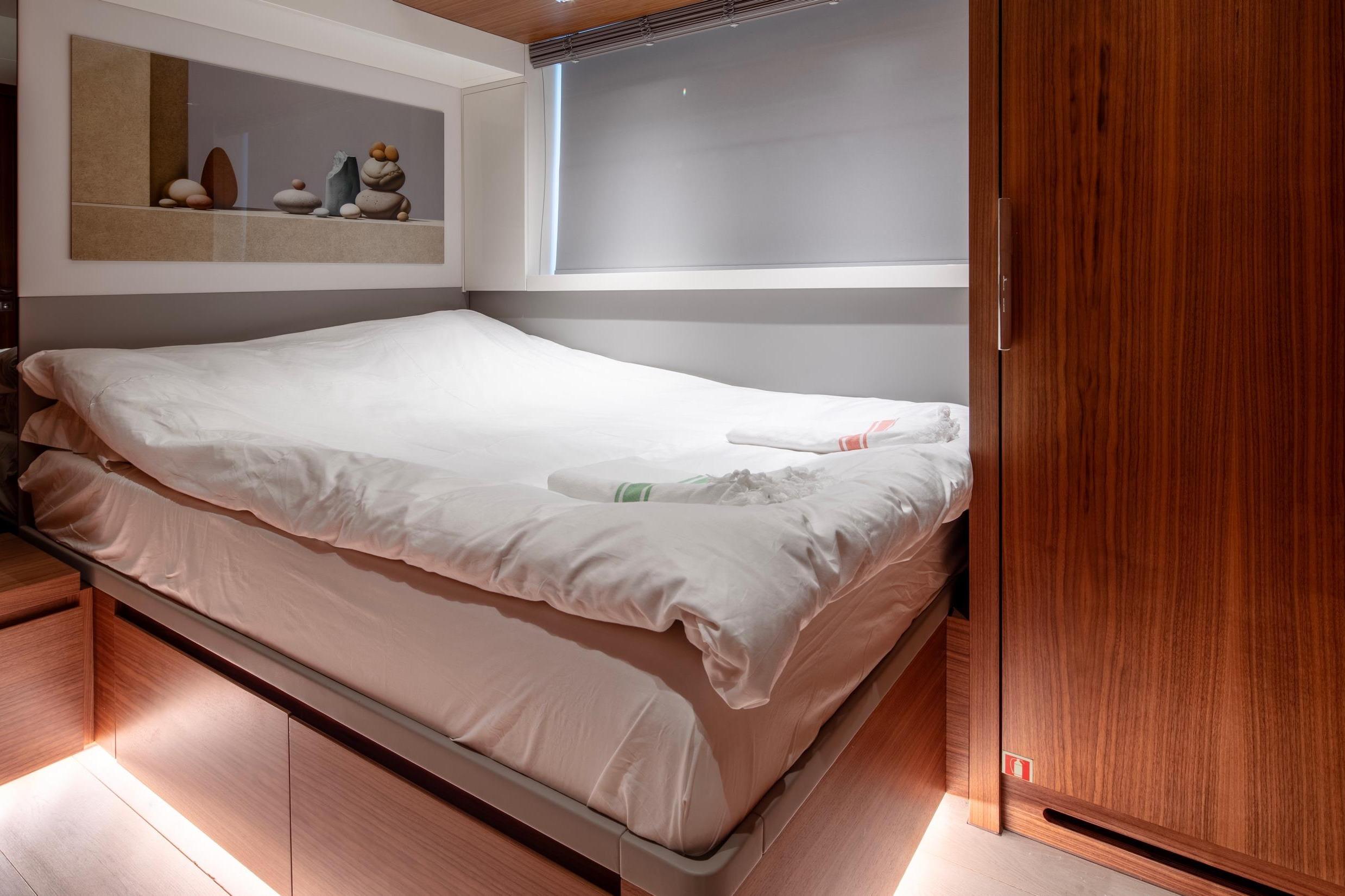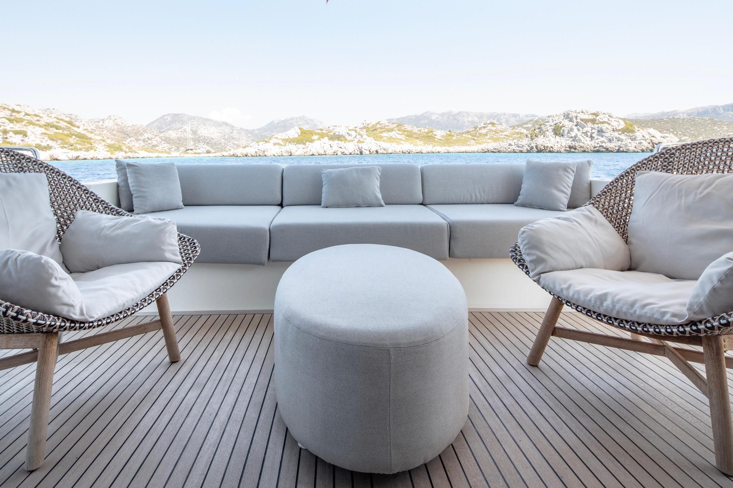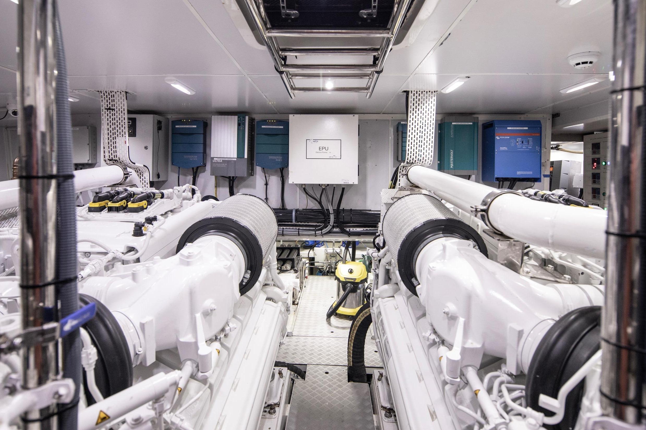 Sanlorenzo’s SL86 pairs unmistakable Italian lines with a fast, confident ride. Twin MTU shaft drives push her to 32 knots (27-knot cruise), while CMC fin stabilization and bow/stern thrusters keep motion composed and maneuvers precise. Power management and hotel loads are supported by twin 27 kW Onans, dual 600 L/h watermakers, and a Mastervolt battery suite, cruising infrastructure that’s built for extended time aboard.