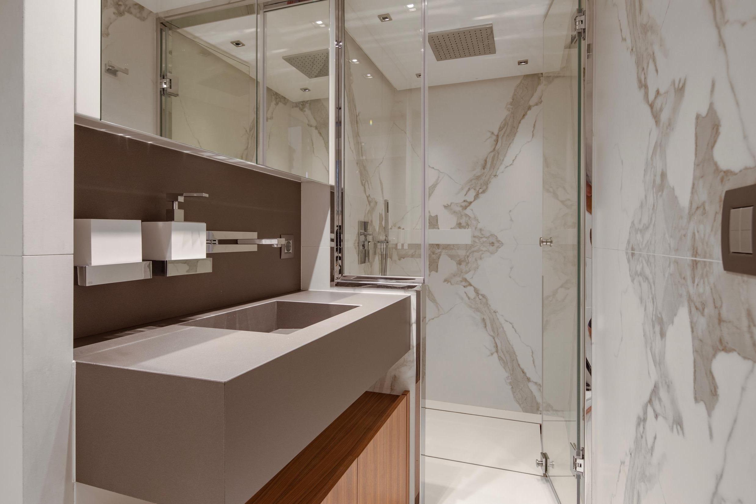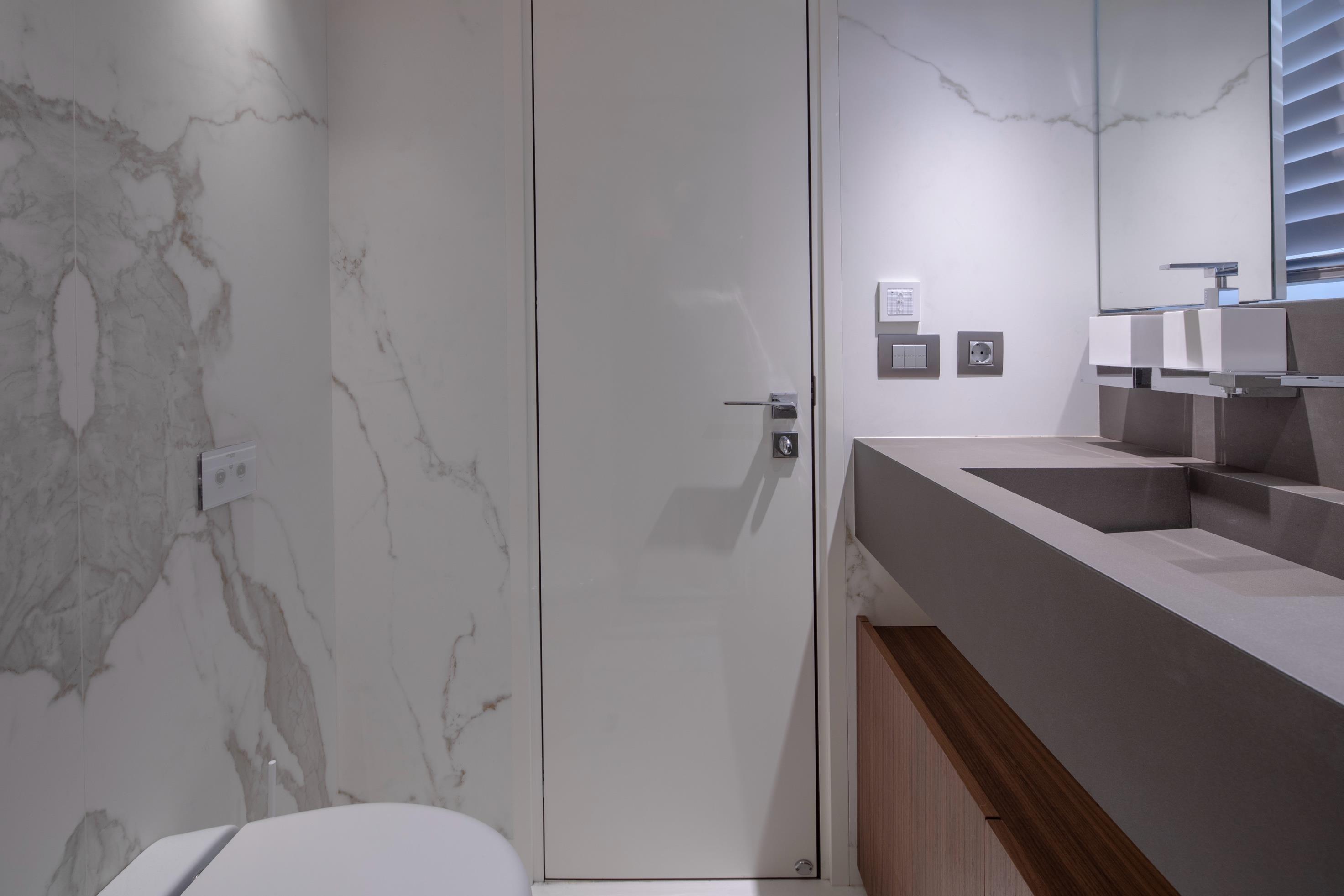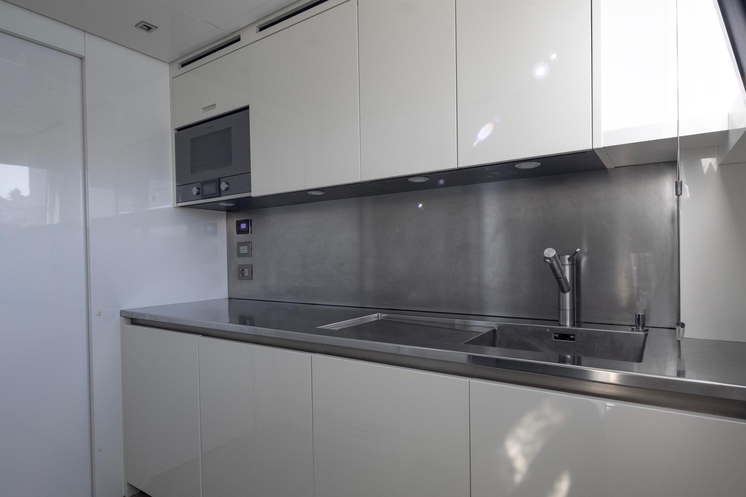 Inside, the SL86’s four-cabin, three-head layout welcomes eight guests, with crew accommodations for four to preserve privacy and service. The galley and service areas are spec’d with premium appliances—Gaggenau cooking suite, V-ZUG refrigeration, Avintage wine cooler, while Schneider automation, Raymarine Axiom navigation and a four-camera package elevate situational awareness. From the salon’s refined finishes to the tech-forward bridge, this 86 delivers the craftsmanship and performance that define Sanlorenzo.