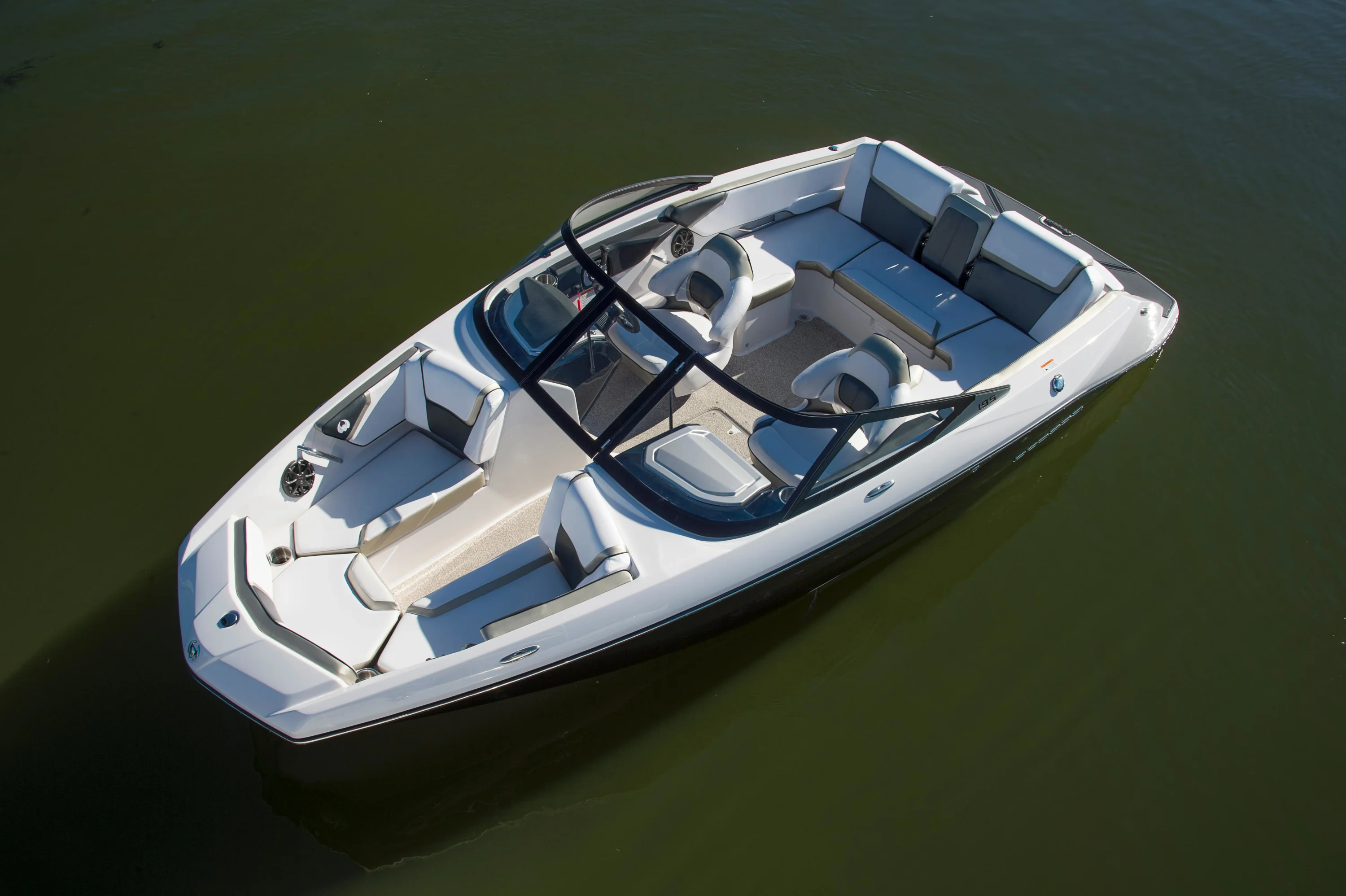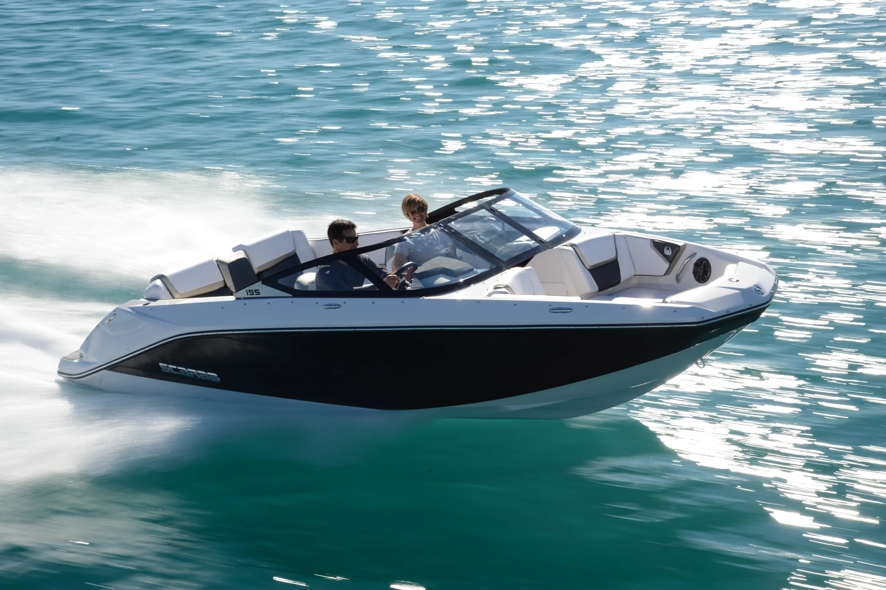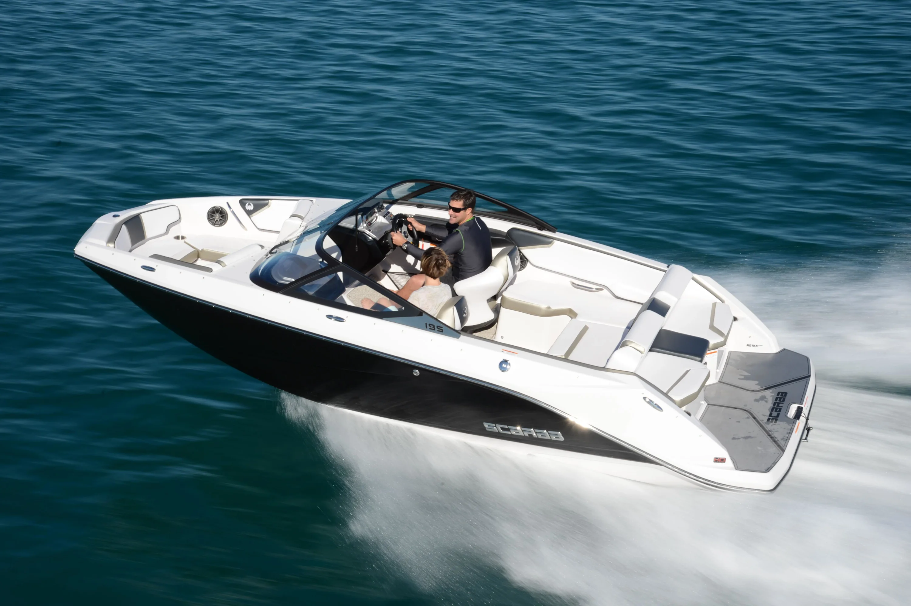 Includes features from 195 plus additional functionality with flip-up bolster seats, snap-in carpet, bimini top and stainless-steel cup holders and grab rails. Turn up the tunes with the stereo remote located on helm, and let the good times roll with an upgraded 250 HP Rotax engine! Explore new places with increased maneuverability and shallow water access. So whether you are new to boating or ready to kick your experience up a notch, the Scarab 195 HO is for you.