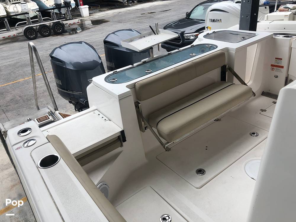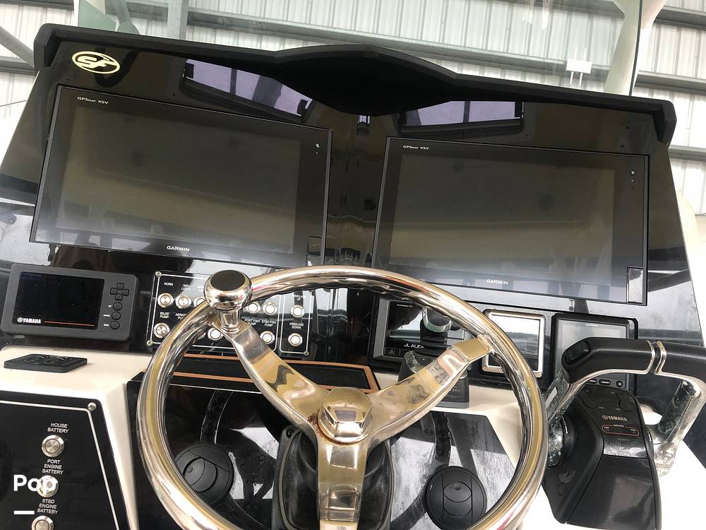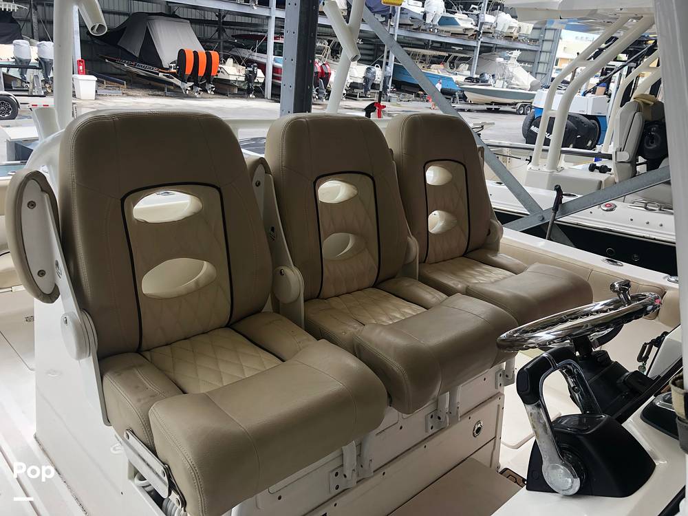Rack-stored, Custom 2017 Sea Fox 328 Commander. The owner indicates this boat is the only factory-built yellow Commander. Powered by twin Yamaha 300 HP engines.