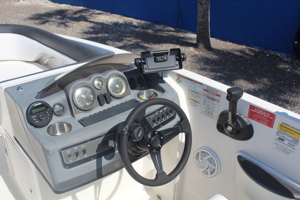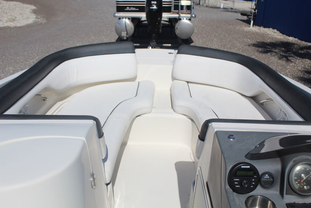 High style, meets high capacity. The brand-new outboard-powered 210 Deck Boat seats up to 12 thanks to L-shaped "pontoon-style" cockpit seating and a spacious bow. A roomy in-floor locker accommodates skis and water toys, while innovative under-seat storage (which can be partitioned based on your needs) stows the rest of your crew's gear. The sporty dash includes an easy-to-read gauge array. And what could be better than that?
