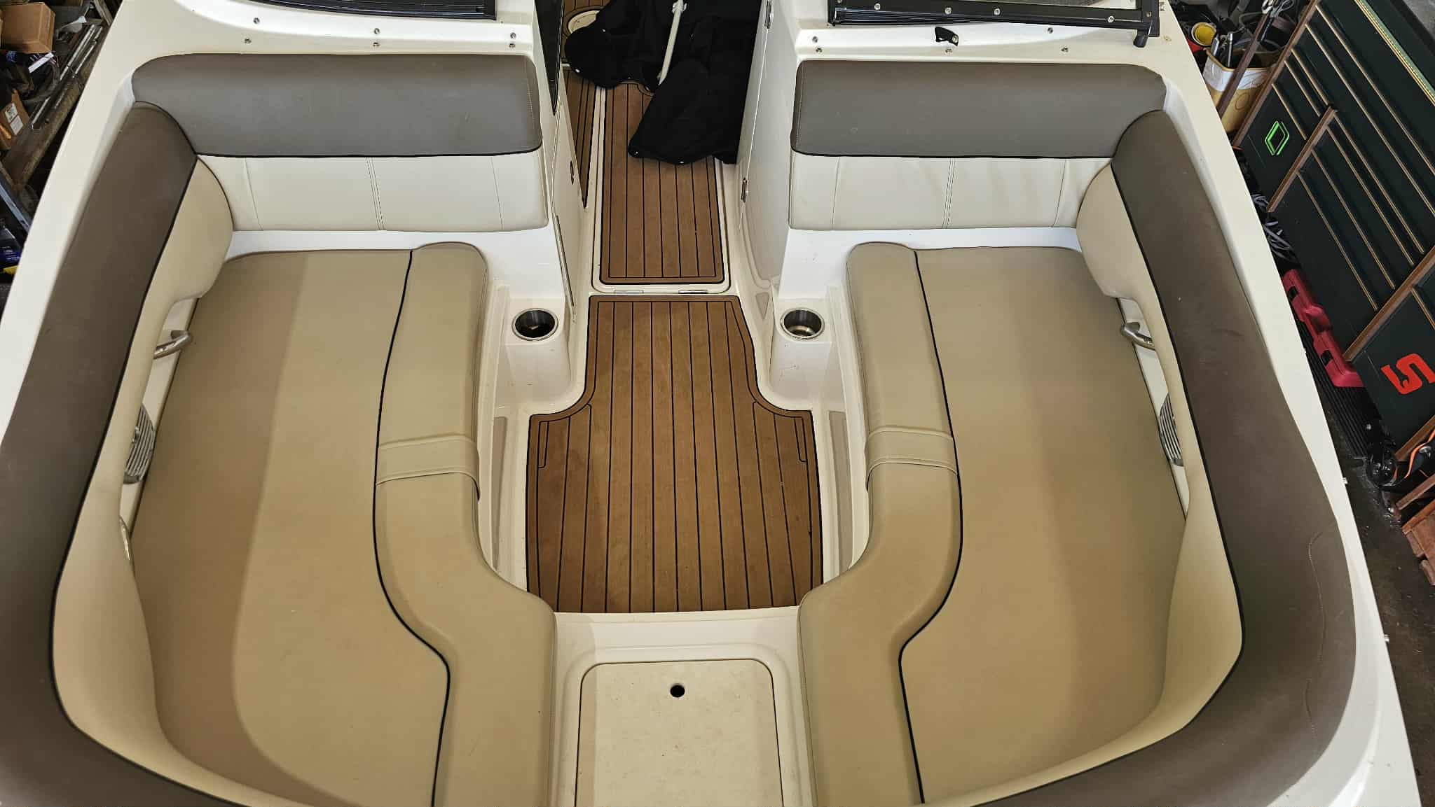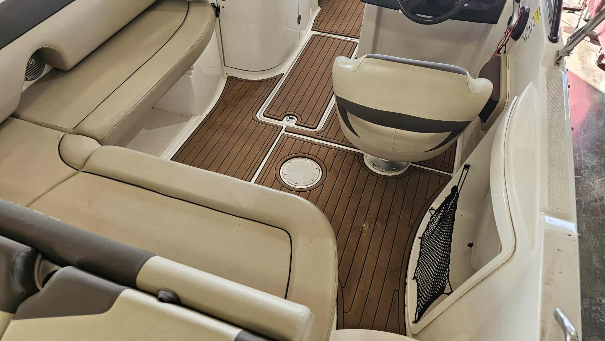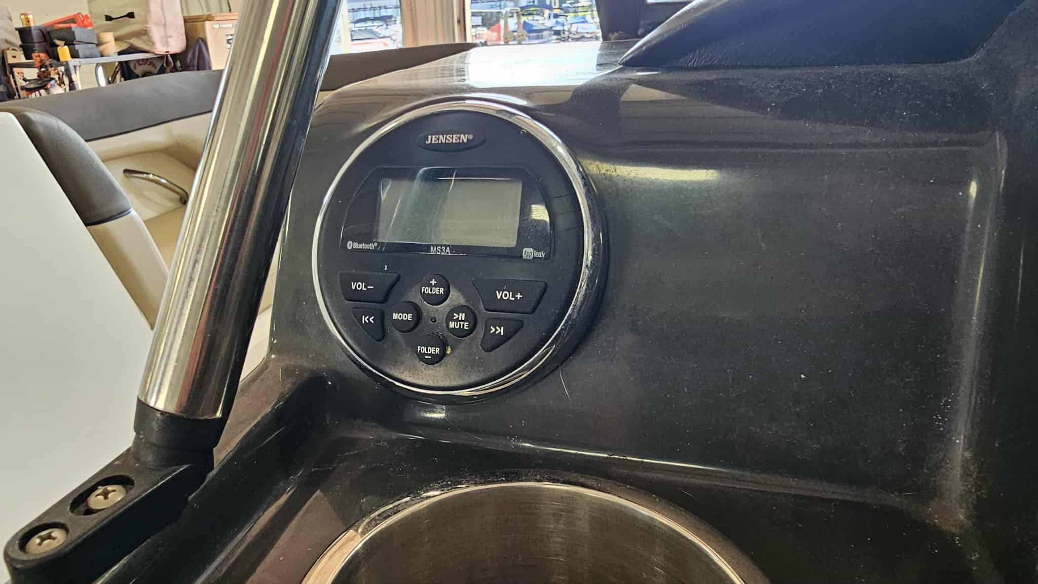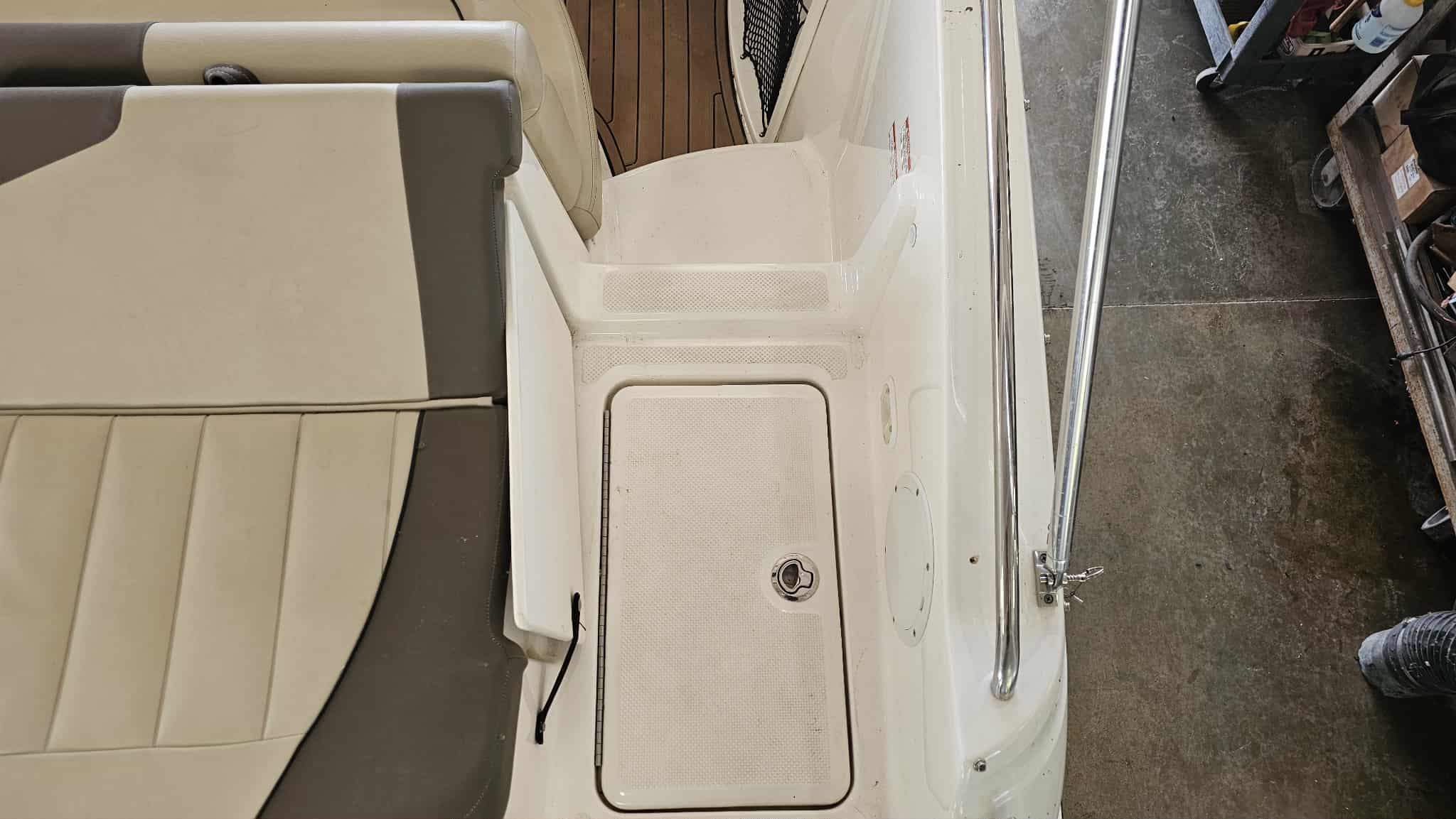 Boat comes with full windshield, marine-mat cockpit flooring, built-in extended swim platform with matching marine mat flooring and swim ladder, bimini top, Jensen bluetooth stereo with speakers, depth gauge, front swim deck with ladder, head compartment with space for porta potti (not included), swing tongue tandem axle trailer and more!