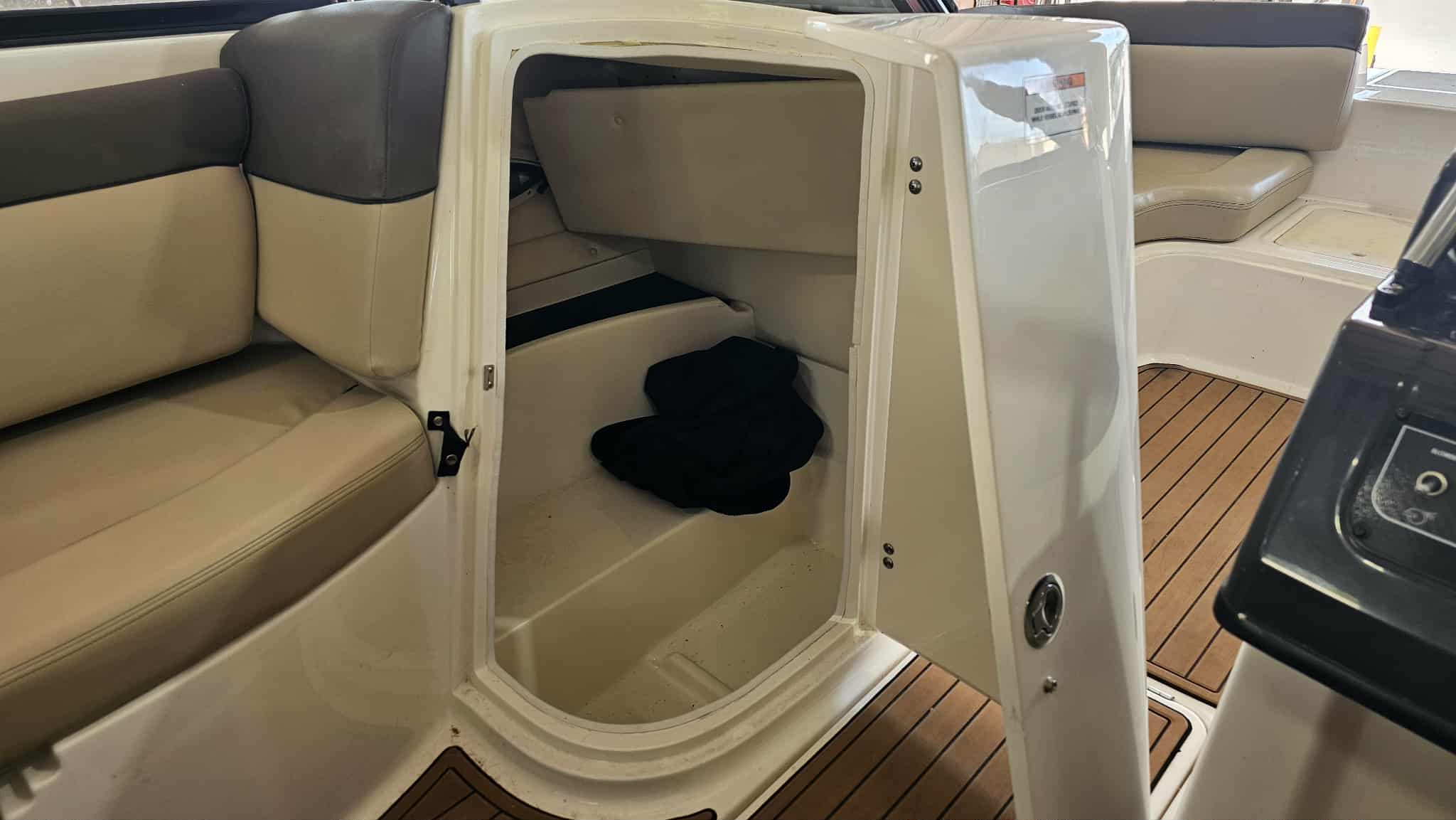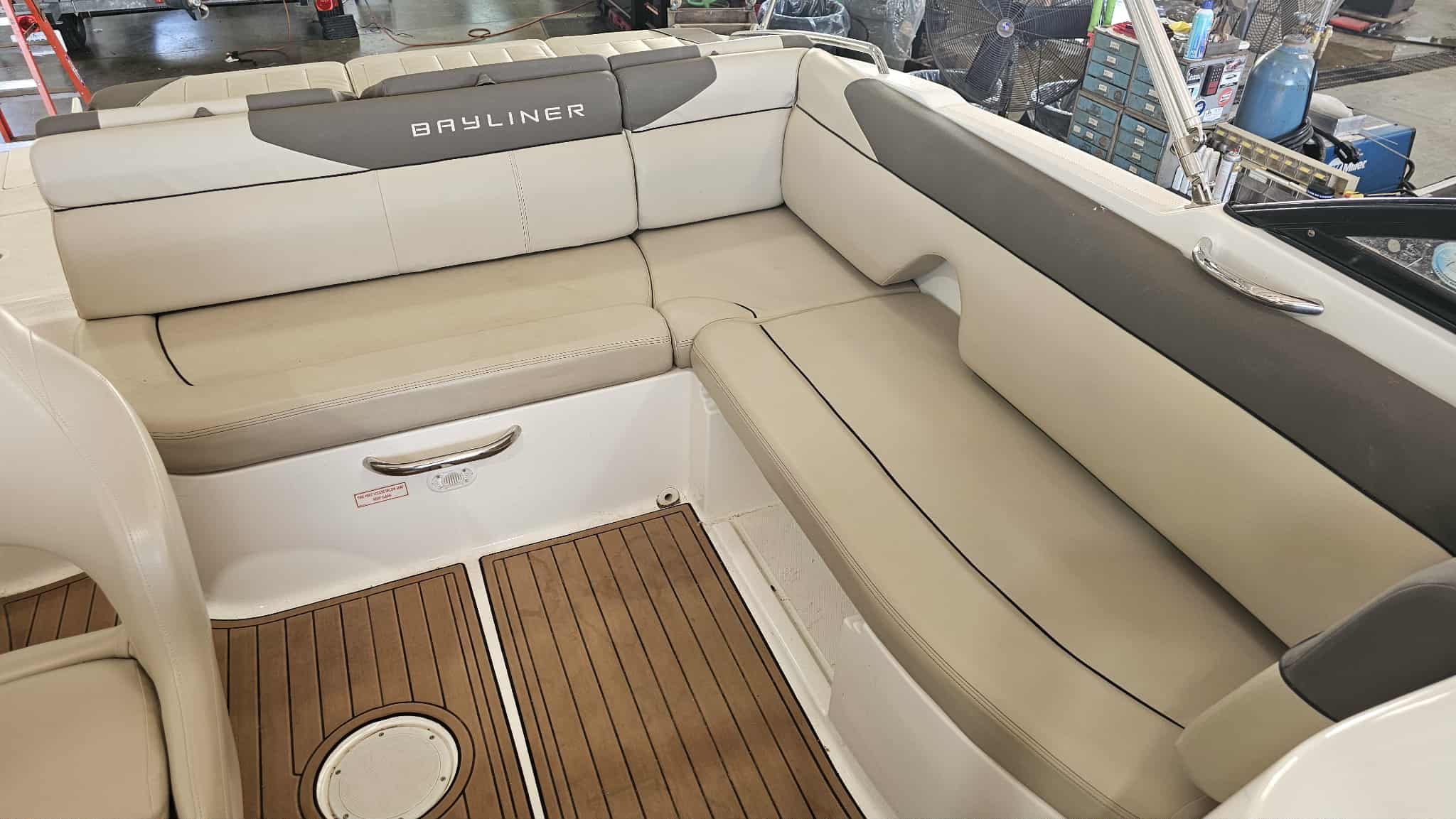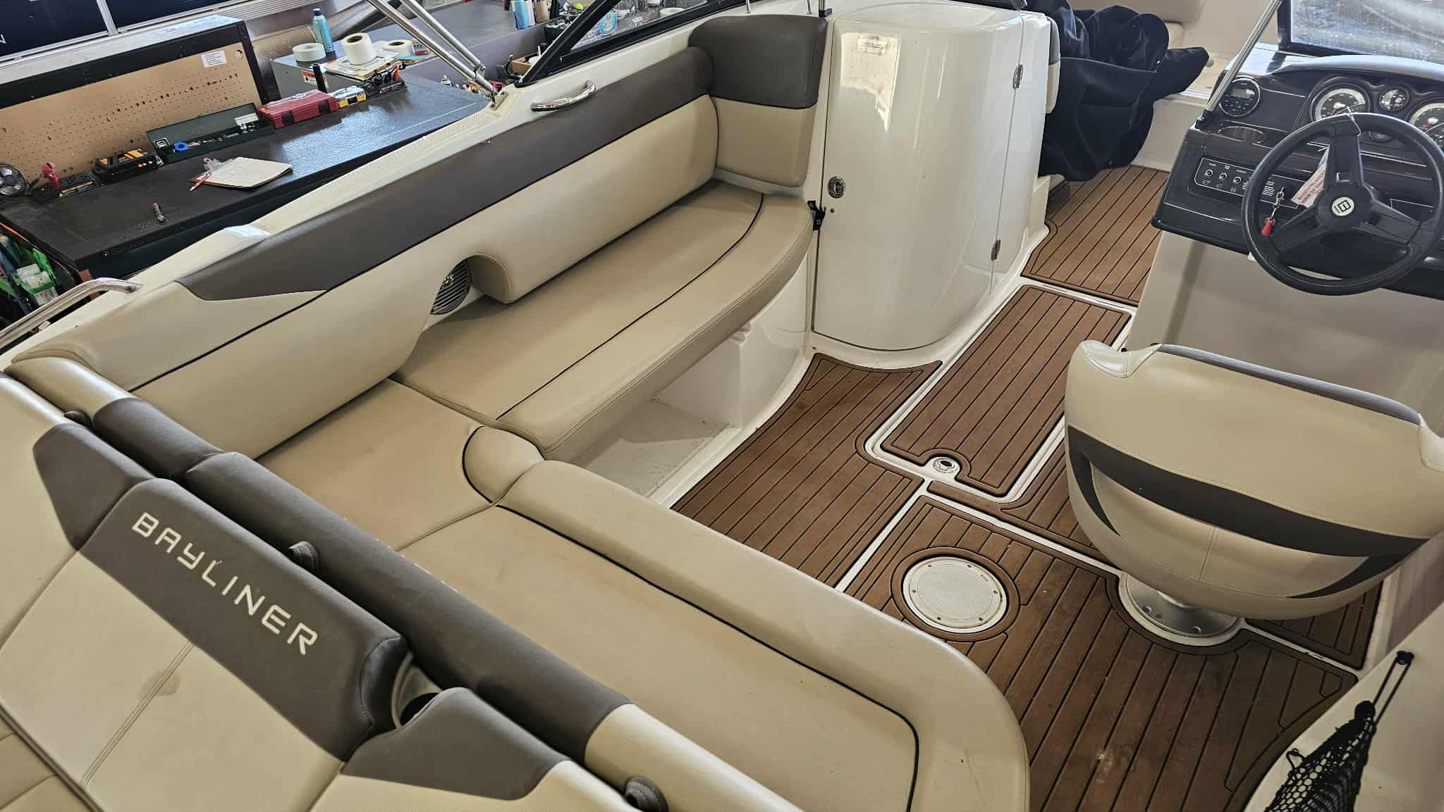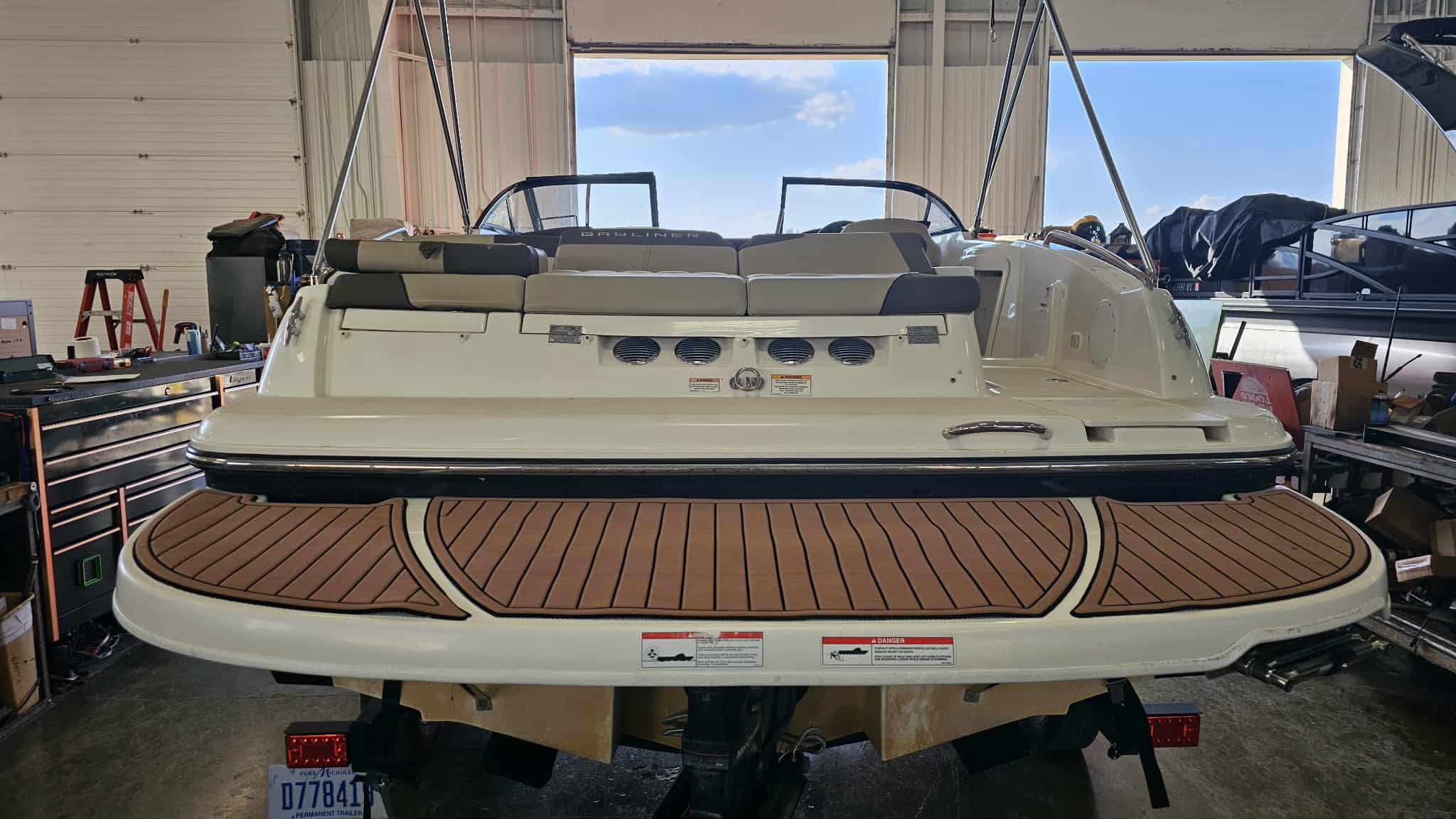 Boat comes with full windshield, marine-mat cockpit flooring, built-in extended swim platform with matching marine mat flooring and swim ladder, bimini top, Jensen bluetooth stereo with speakers, depth gauge, front swim deck with ladder, head compartment with space for porta potti (not included), swing tongue tandem axle trailer and more!
