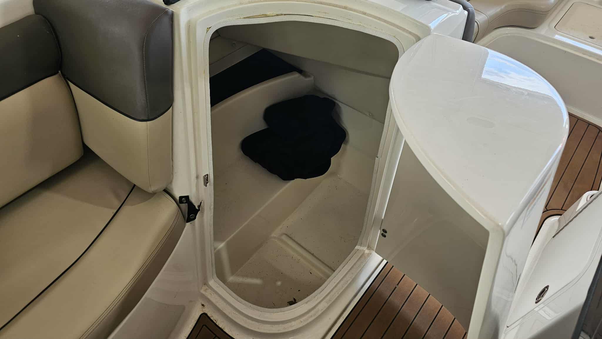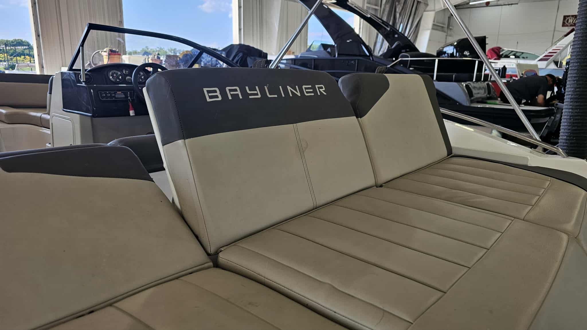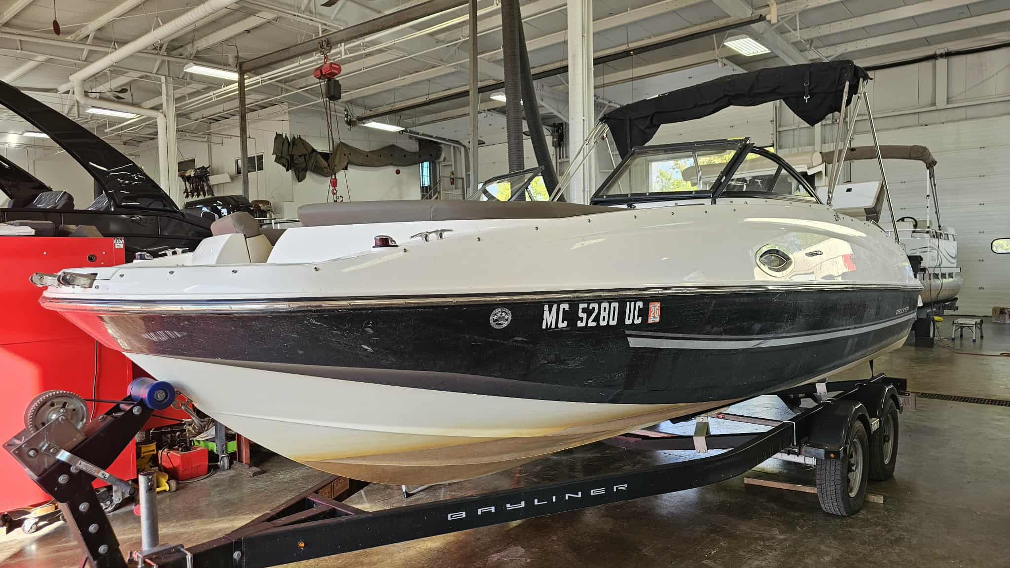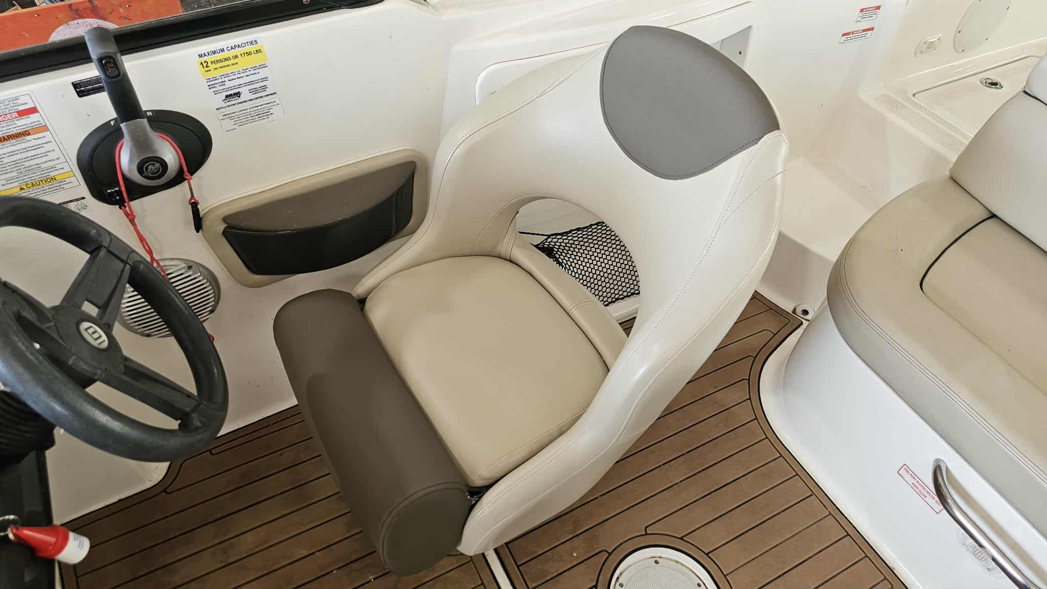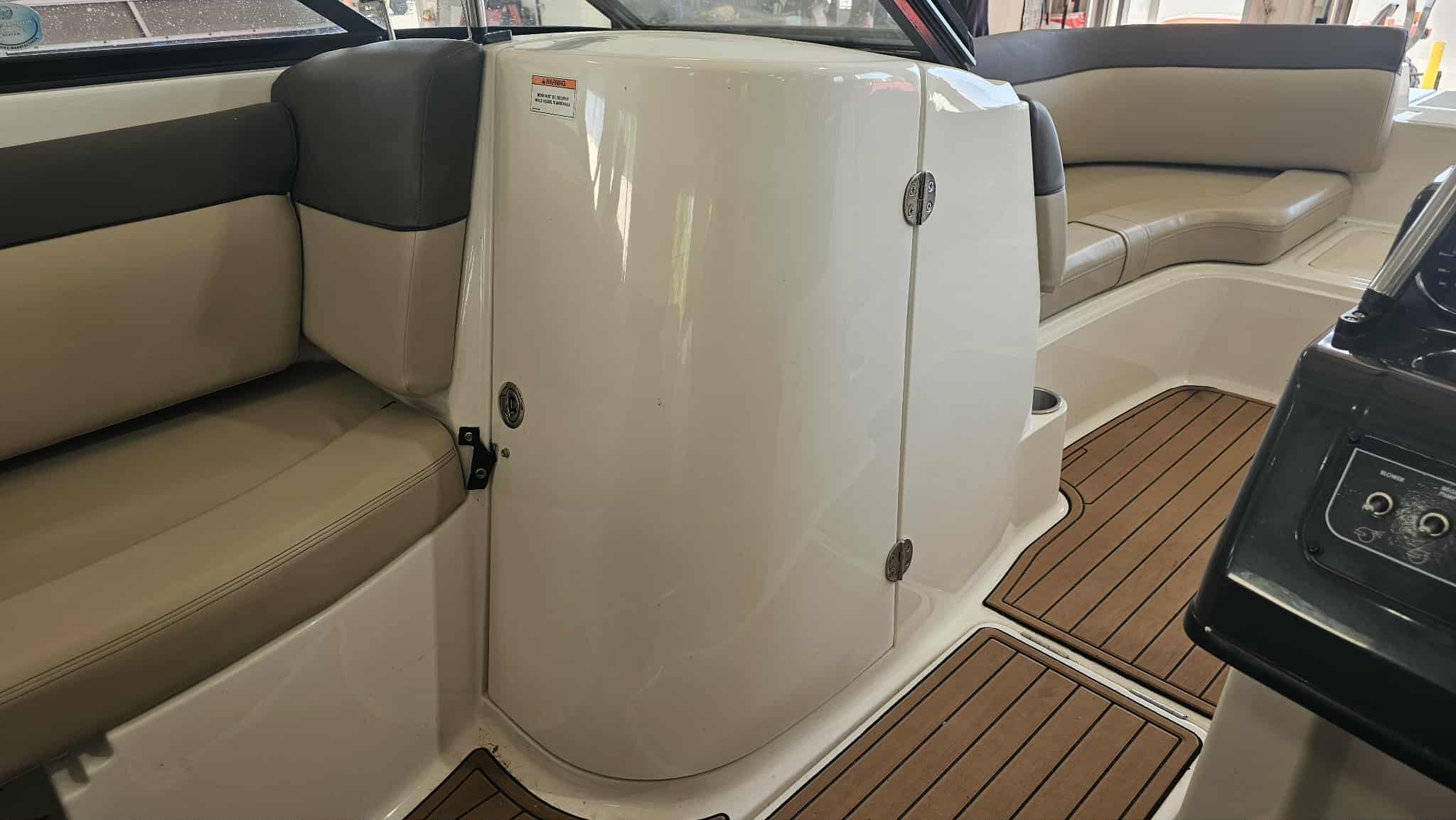 Boat comes with full windshield, marine-mat cockpit flooring, built-in extended swim platform with matching marine mat flooring and swim ladder, bimini top, Jensen bluetooth stereo with speakers, depth gauge, front swim deck with ladder, head compartment with space for porta potti (not included), swing tongue tandem axle trailer and more!