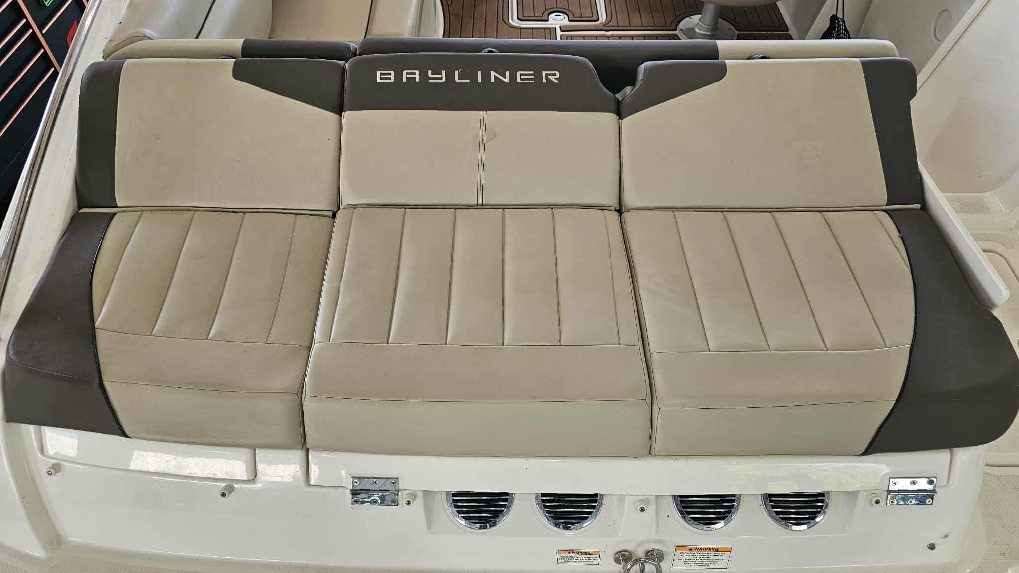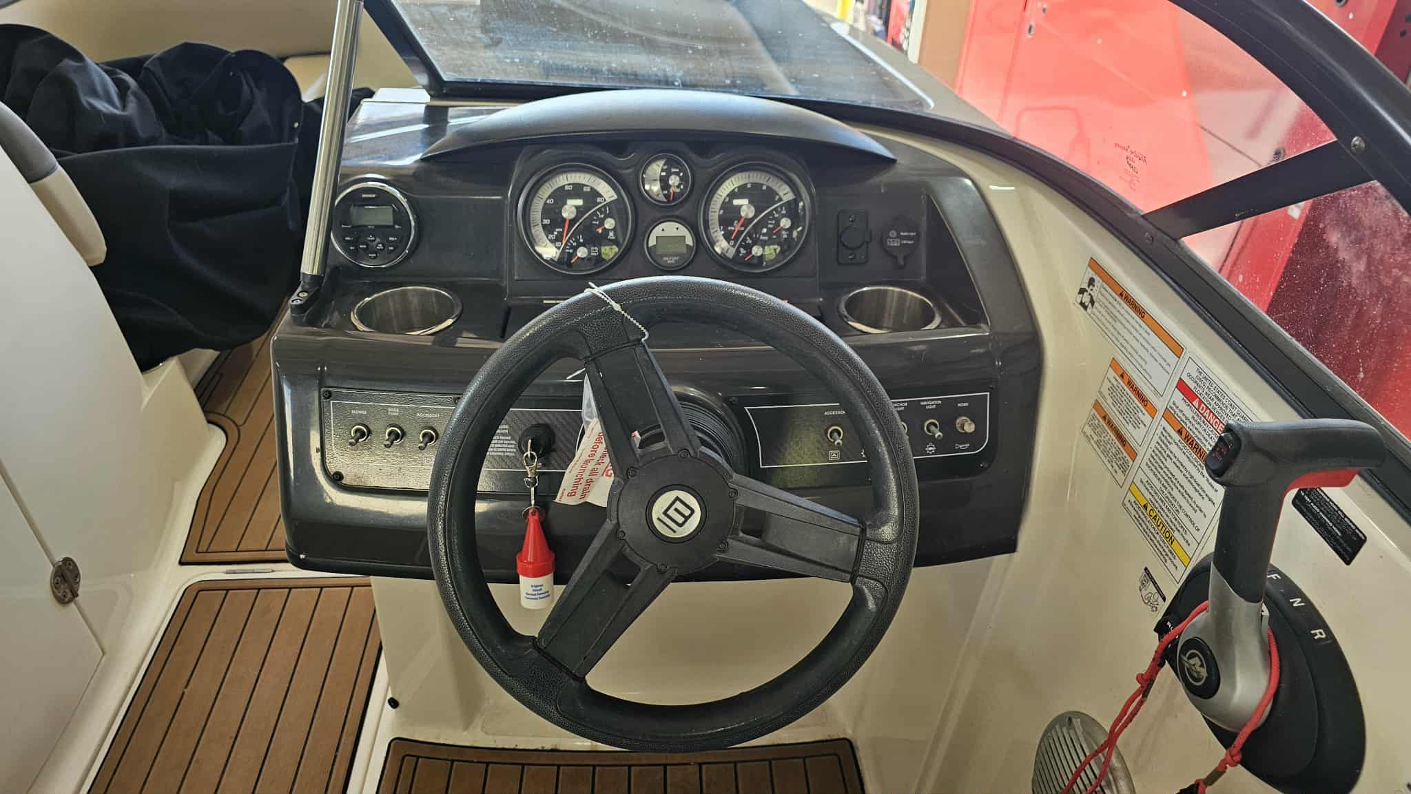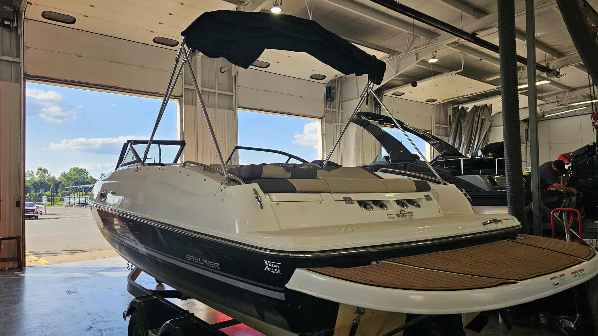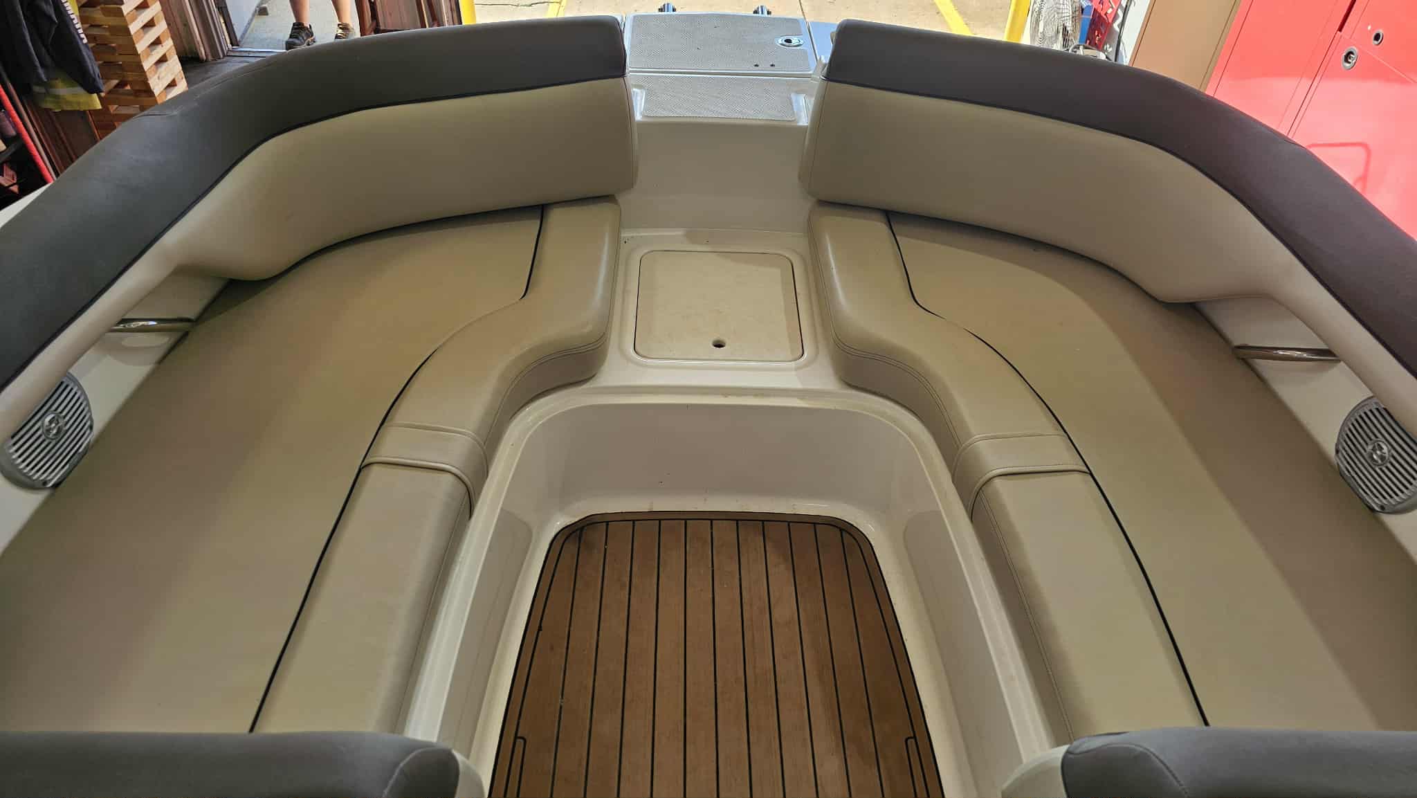 Boat comes with full windshield, marine-mat cockpit flooring, built-in extended swim platform with matching marine mat flooring and swim ladder, bimini top, Jensen bluetooth stereo with speakers, depth gauge, front swim deck with ladder, head compartment with space for porta potti (not included), swing tongue tandem axle trailer and more!