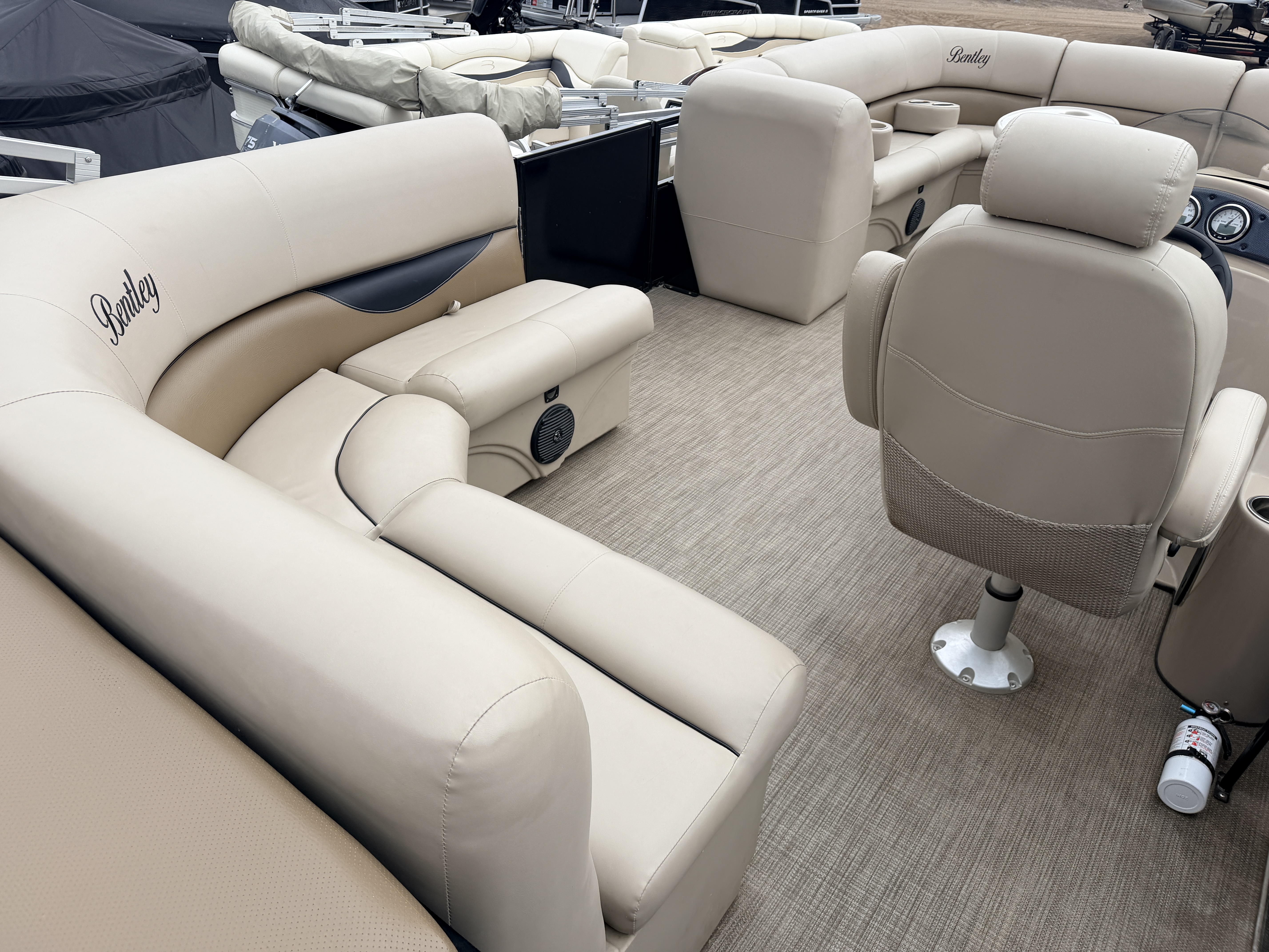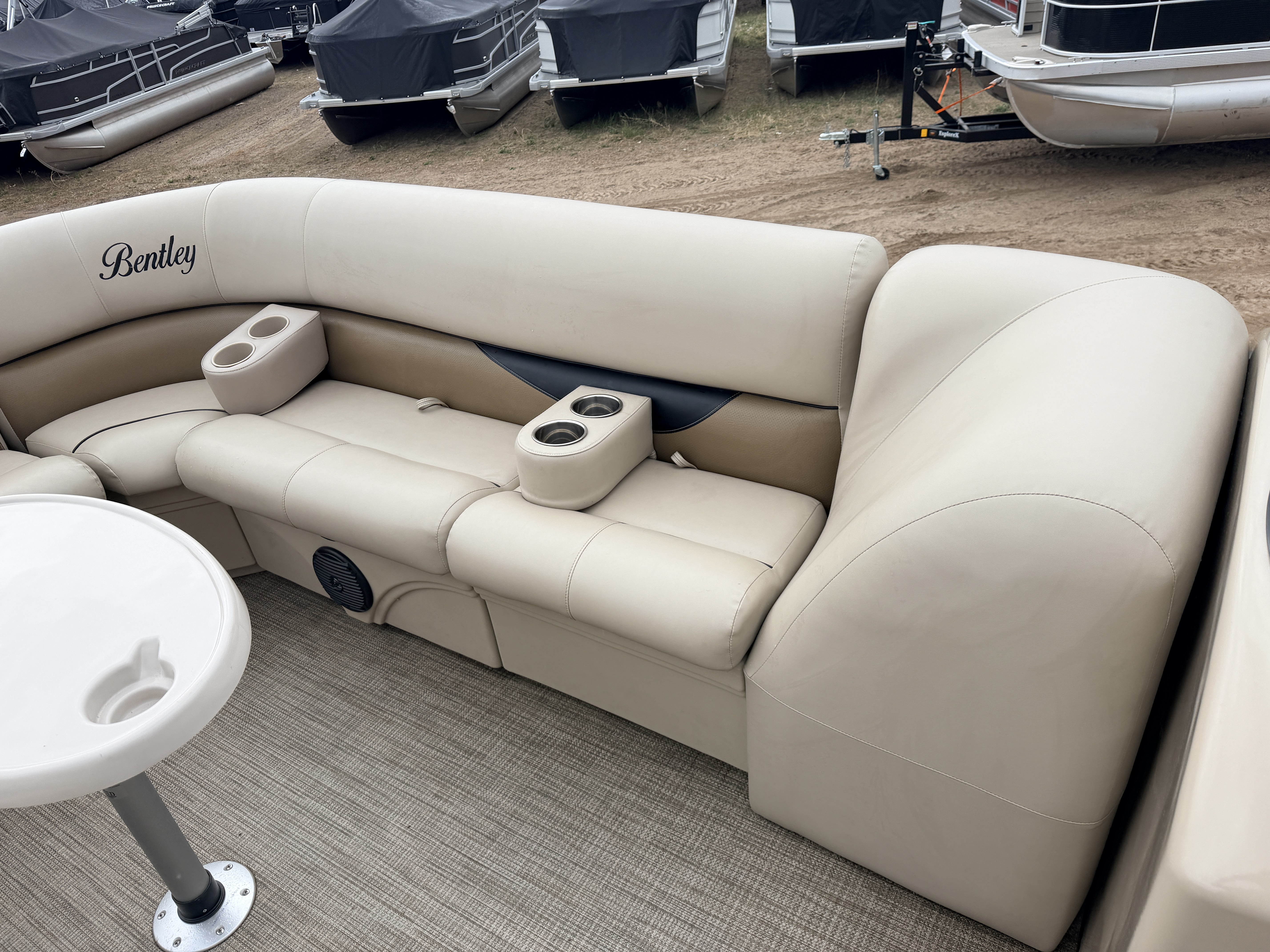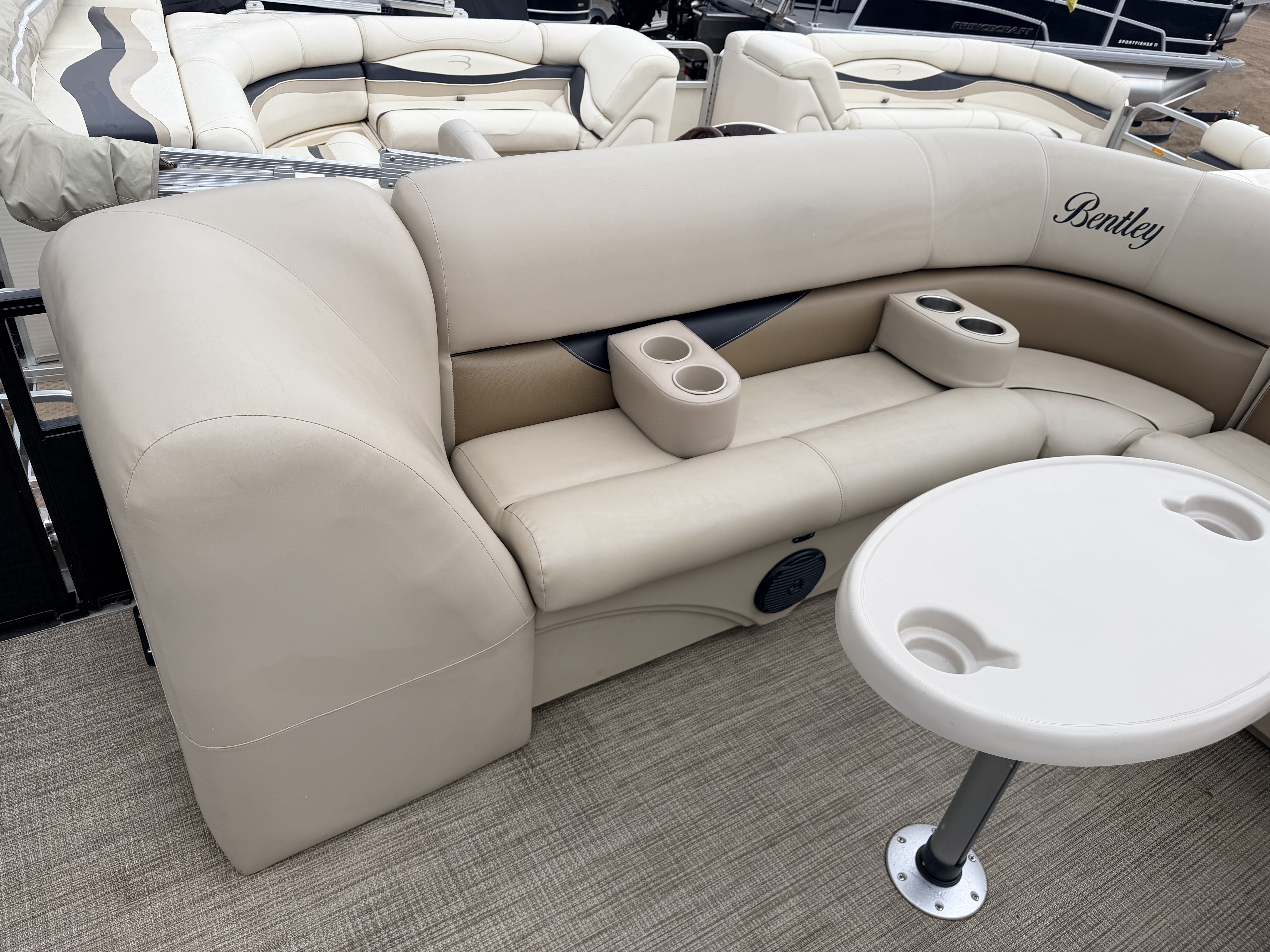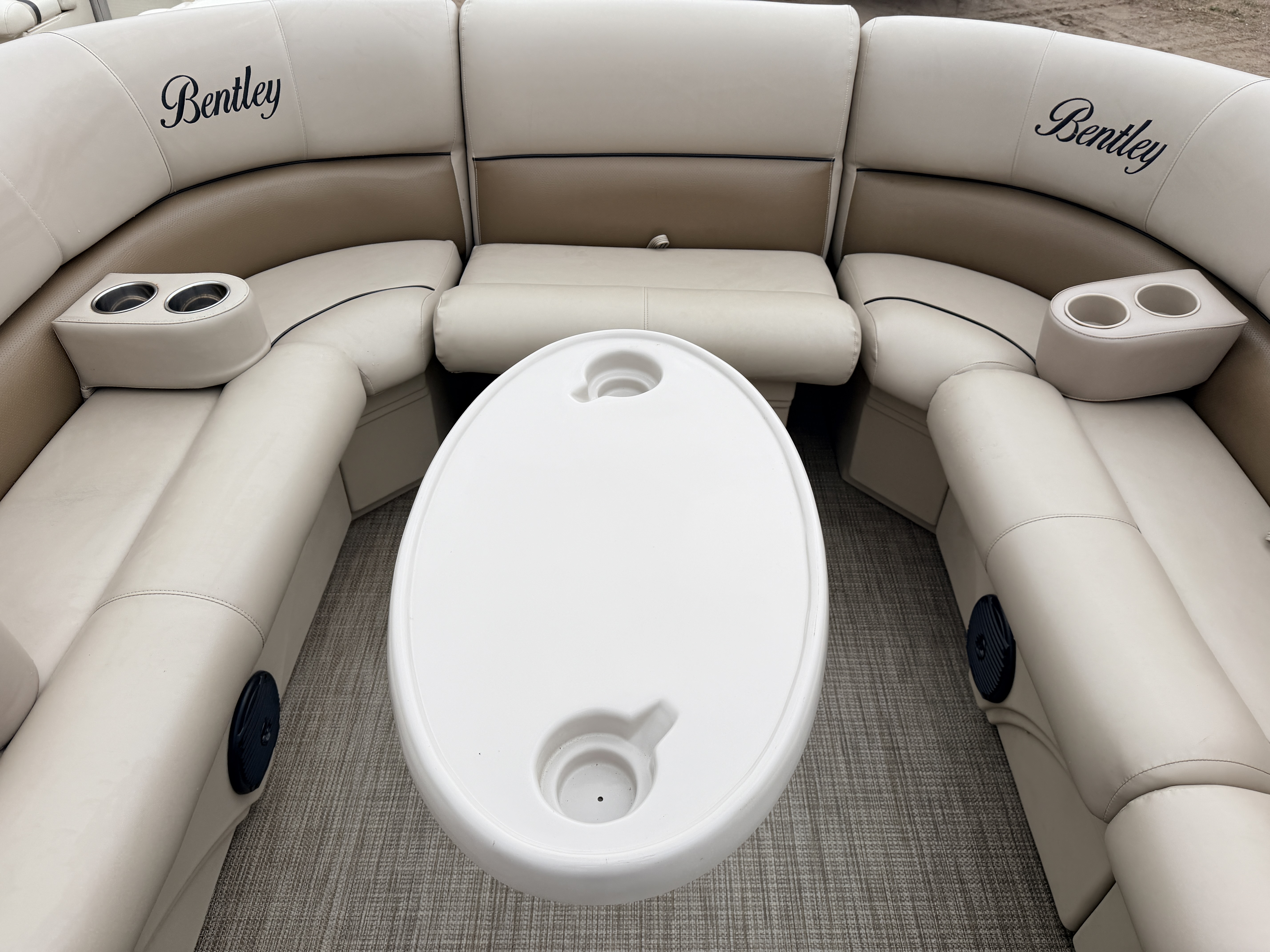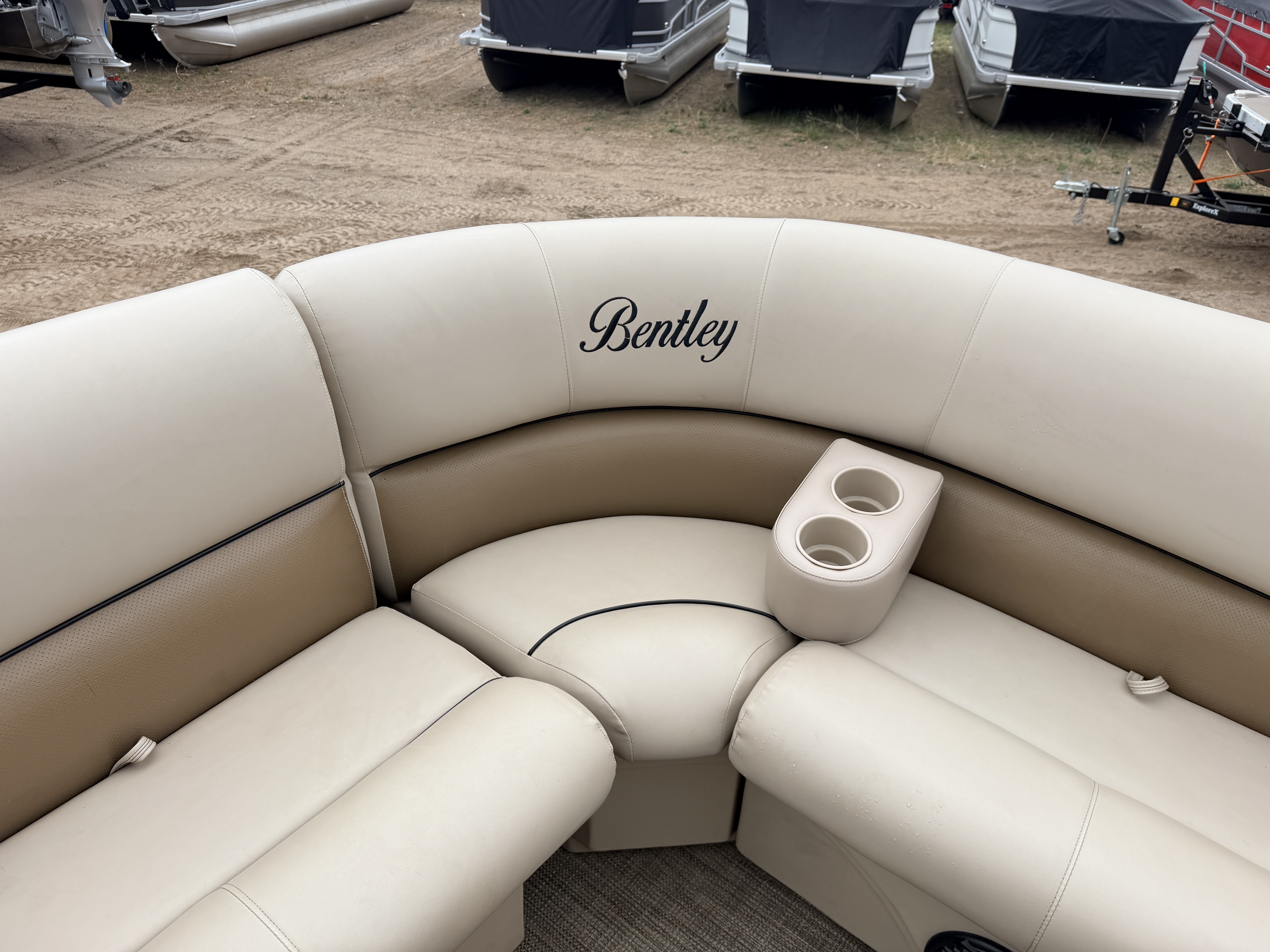 2018 Bentley Encore 240 Cruise SE Pontoon & 150HP Mercury Fourstroke. Seating includes Dual Lounge Couches with movable Bow Filler, L-shaped Couch, Captain's Chair and Sun Deck. Features include Bimini Top, Table, In-Seat Storage, Speedometer, Tachometer and Fuel Gauges, Jensen MS2A Bluetooth Stereo, Courtesy Lights, and LED Navigation & Docking Lights. Additional features include Built-In Ski/Tow Bar, 4 Movable Cup Holders, Built-In Cooler, Livewell, Humminbird Helix 5 Depth/Fish Finder, and Privacy/Changing Station.