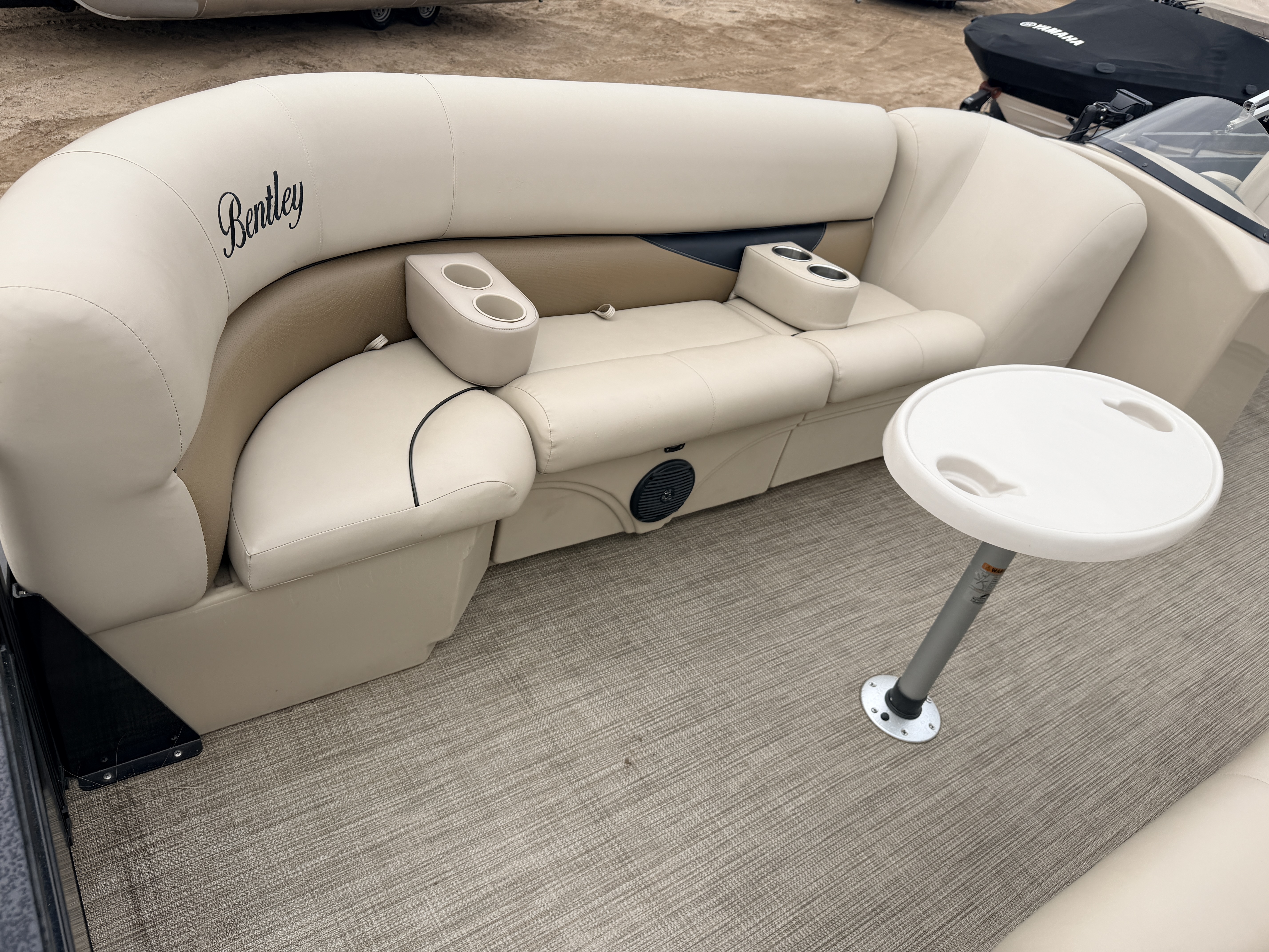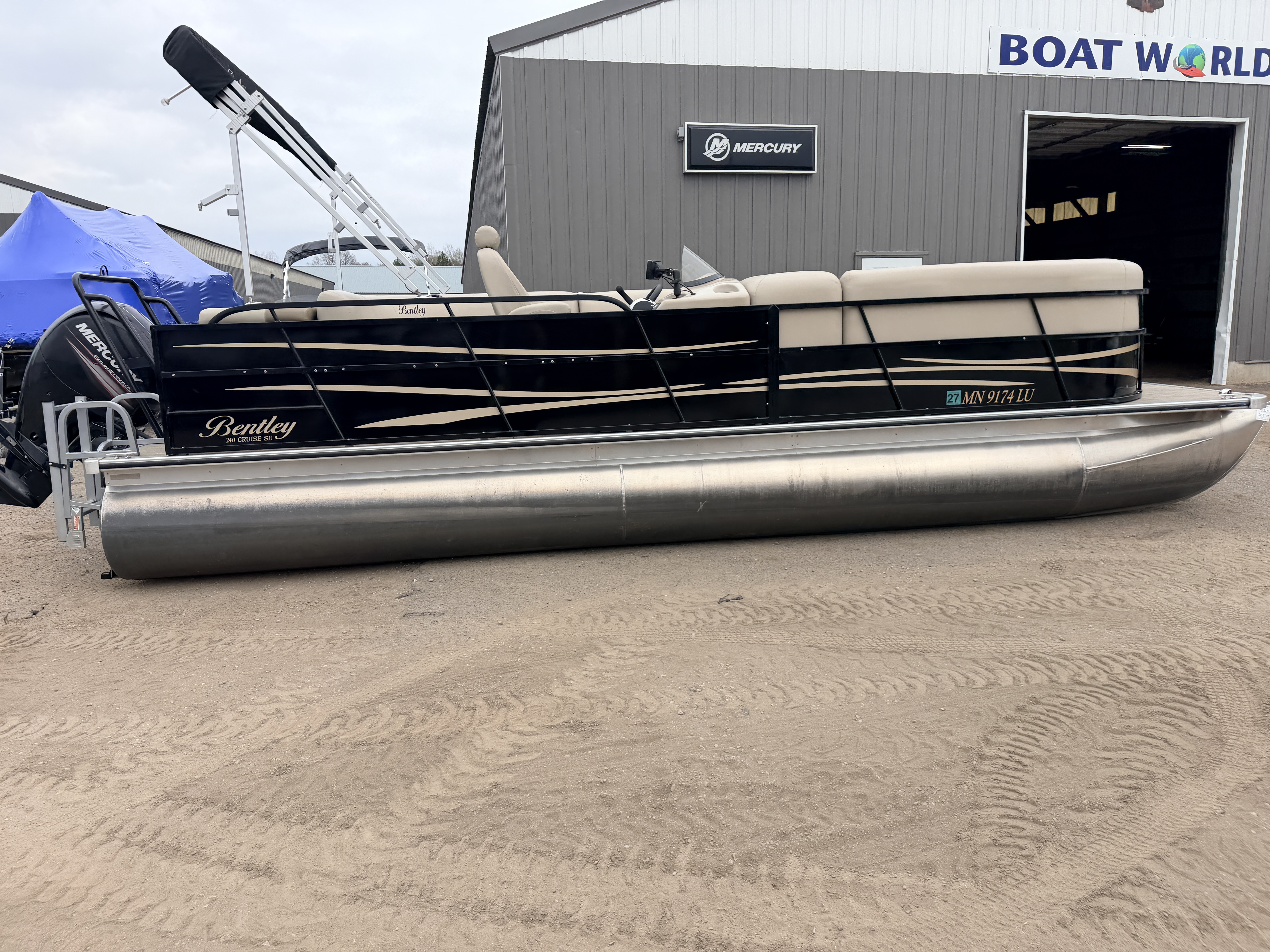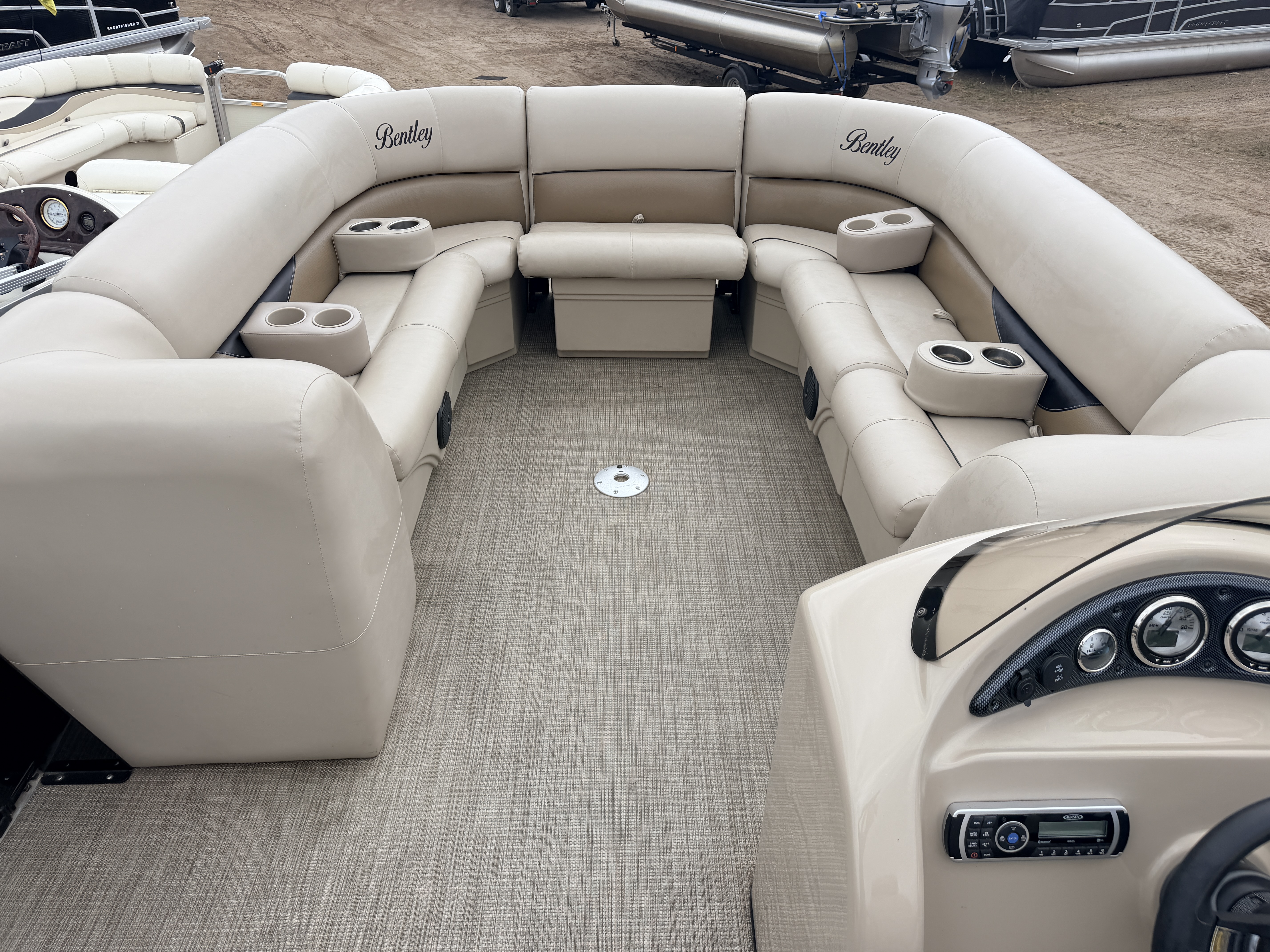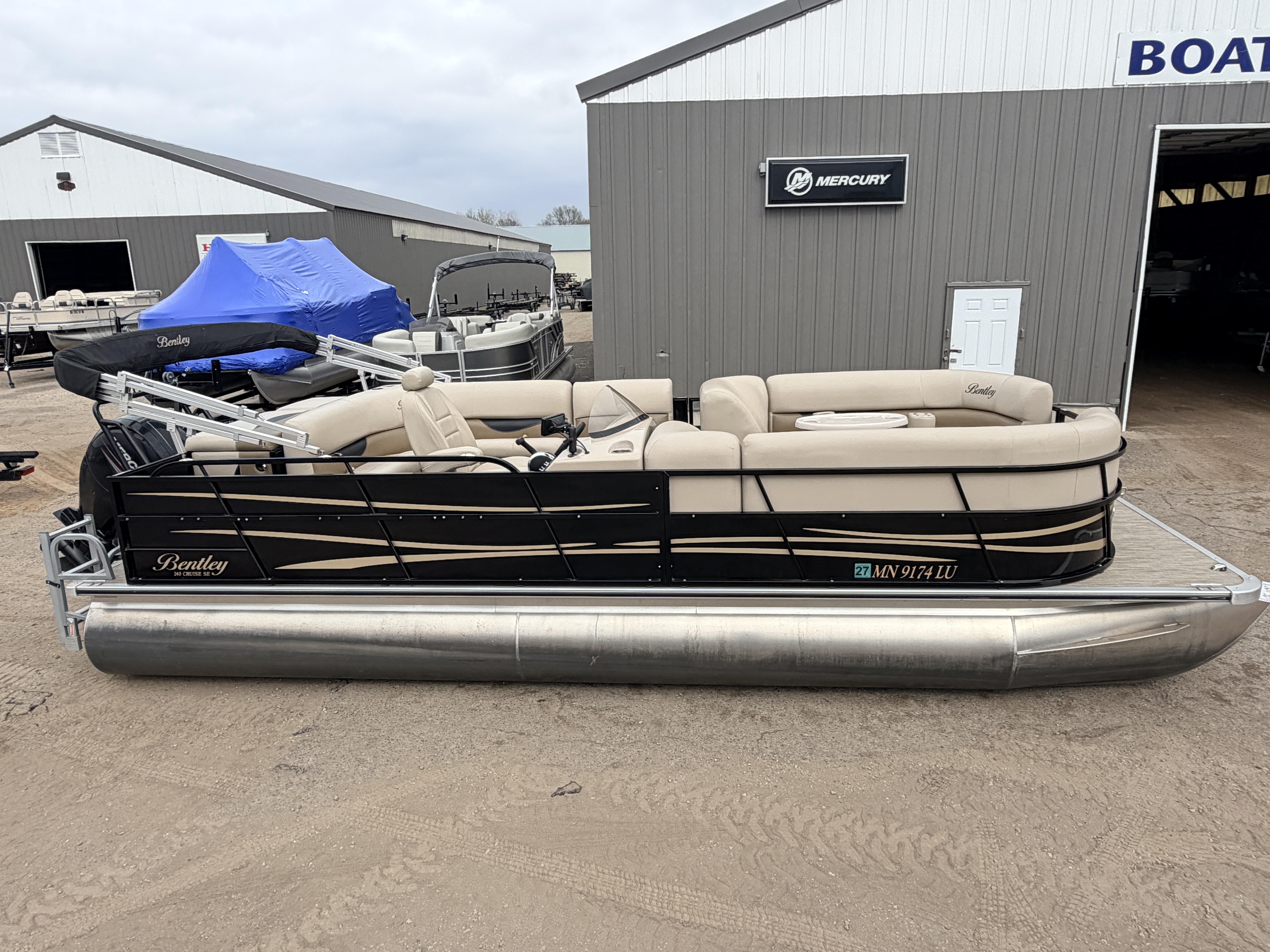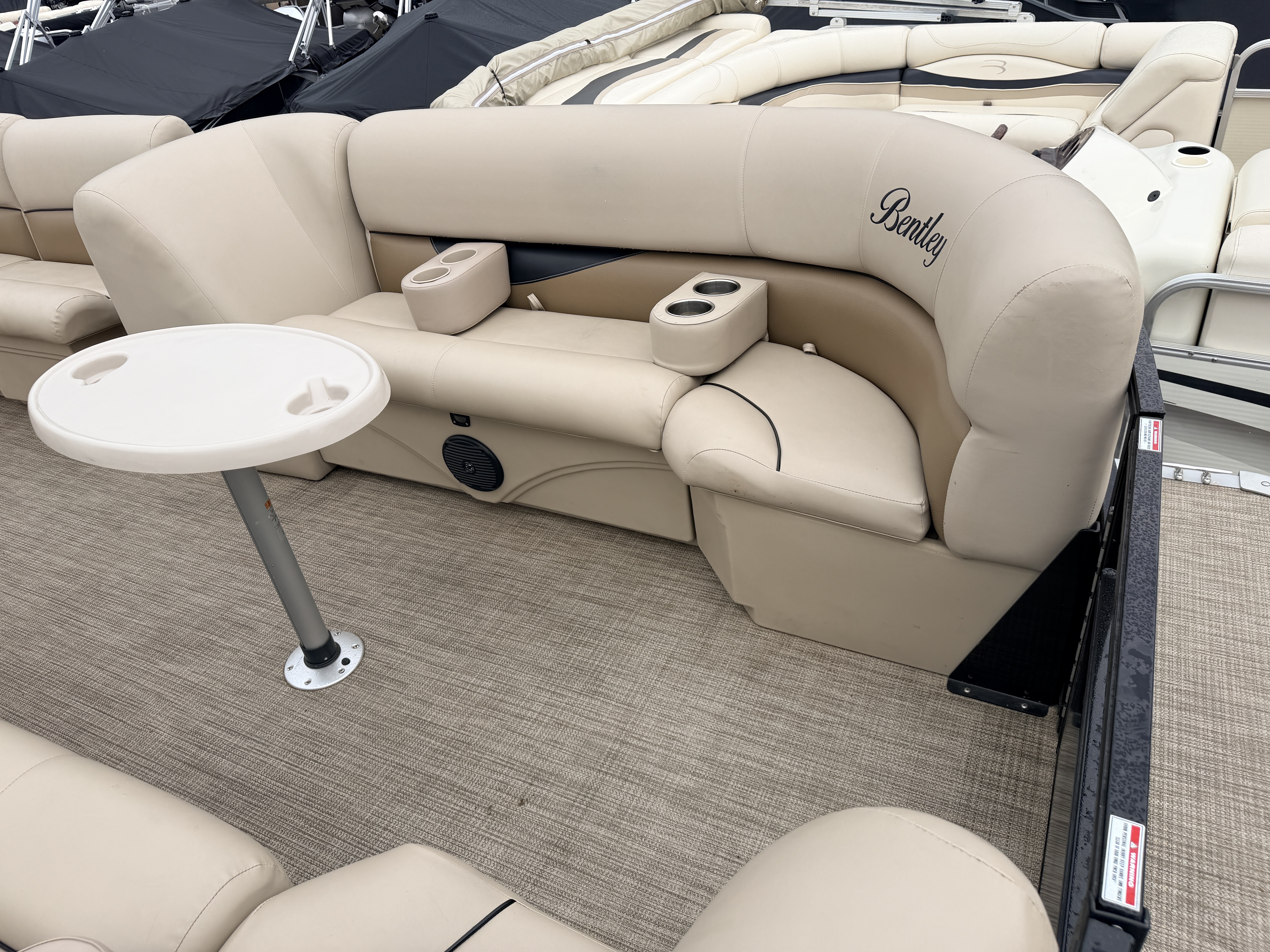 2018 Bentley Encore 240 Cruise SE Pontoon & 150HP Mercury Fourstroke. Seating includes Dual Lounge Couches with movable Bow Filler, L-shaped Couch, Captain's Chair and Sun Deck. Features include Bimini Top, Table, In-Seat Storage, Speedometer, Tachometer and Fuel Gauges, Jensen MS2A Bluetooth Stereo, Courtesy Lights, and LED Navigation & Docking Lights. Additional features include Built-In Ski/Tow Bar, 4 Movable Cup Holders, Built-In Cooler, Livewell, Humminbird Helix 5 Depth/Fish Finder, and Privacy/Changing Station.