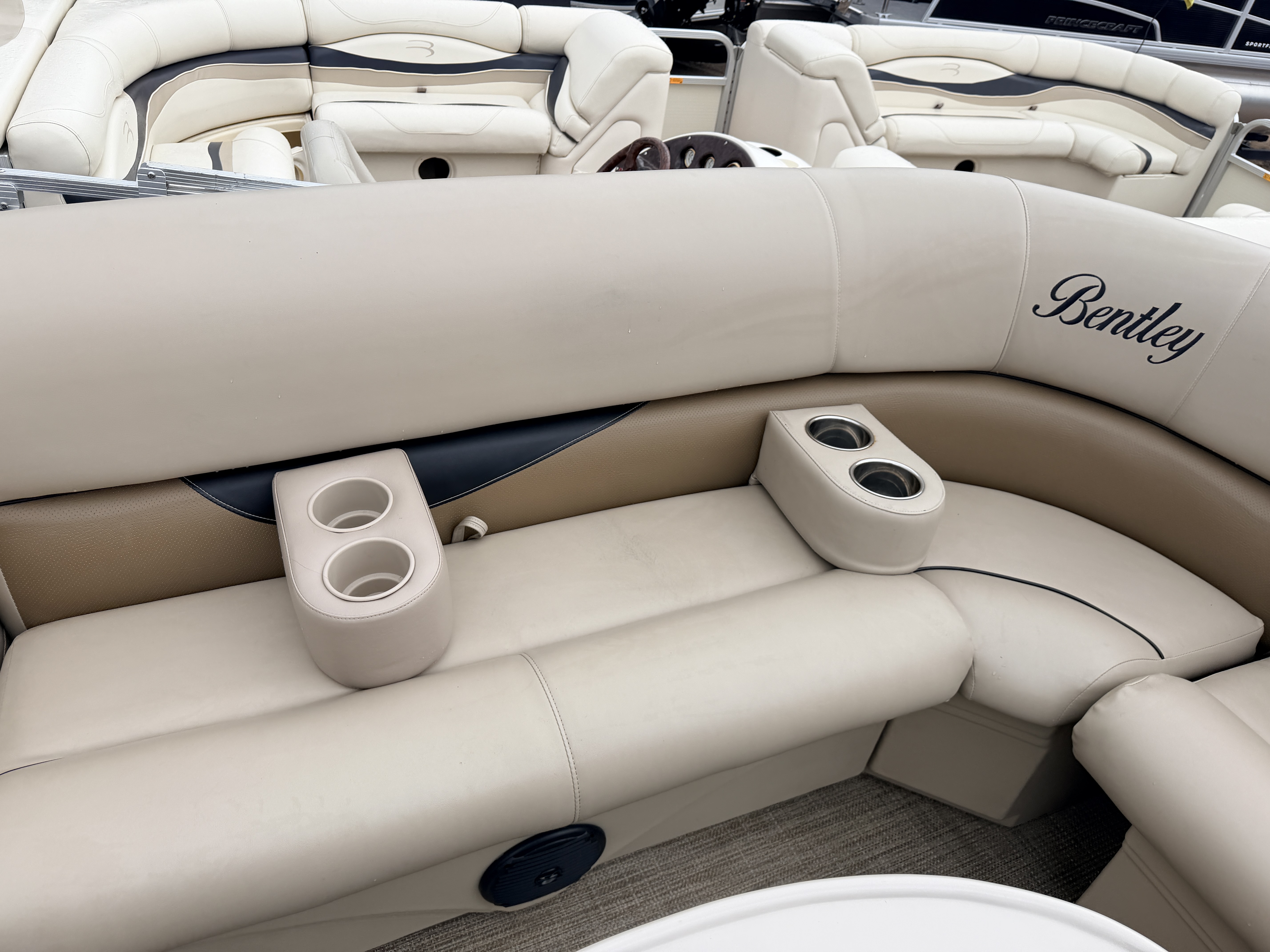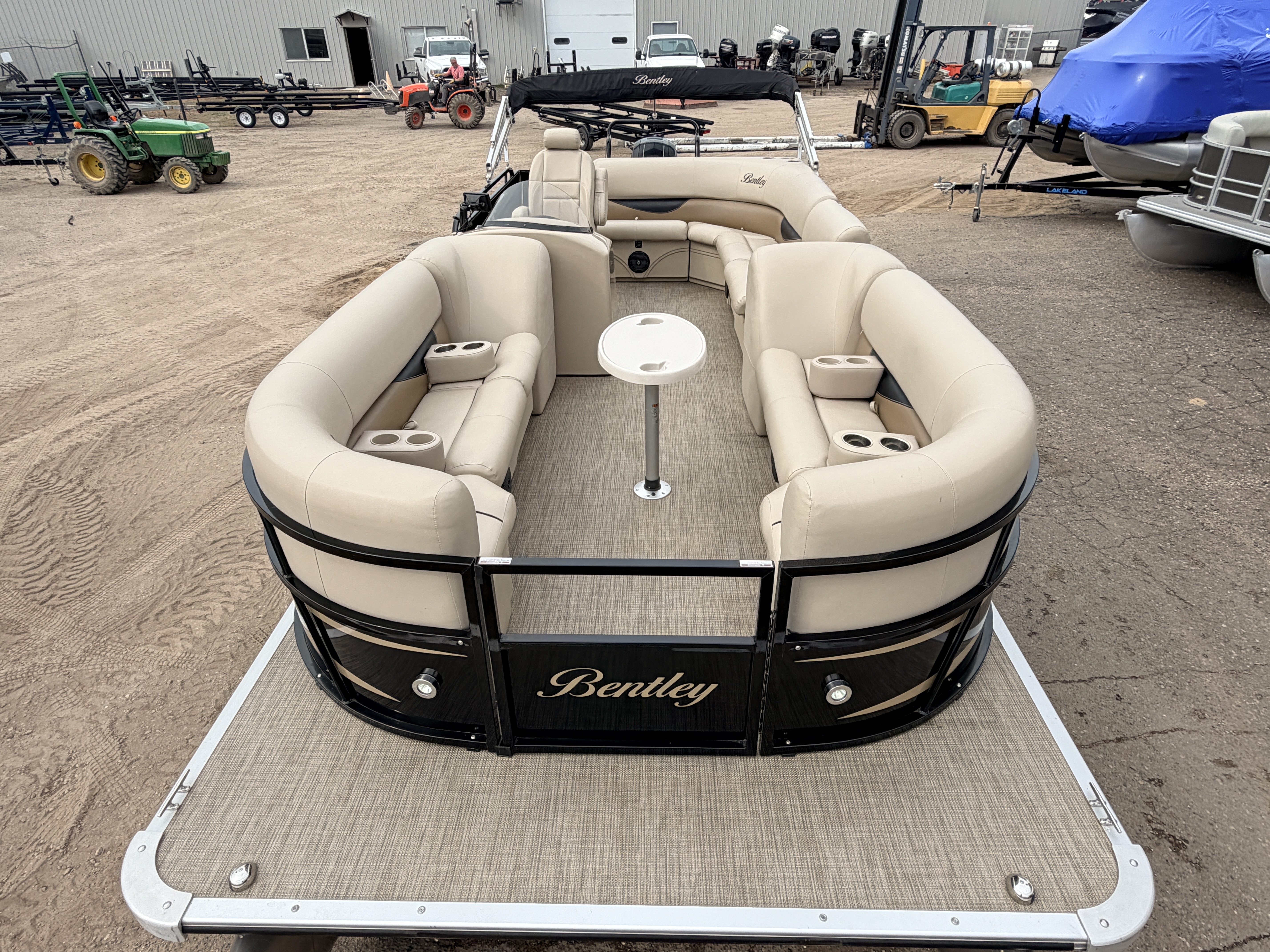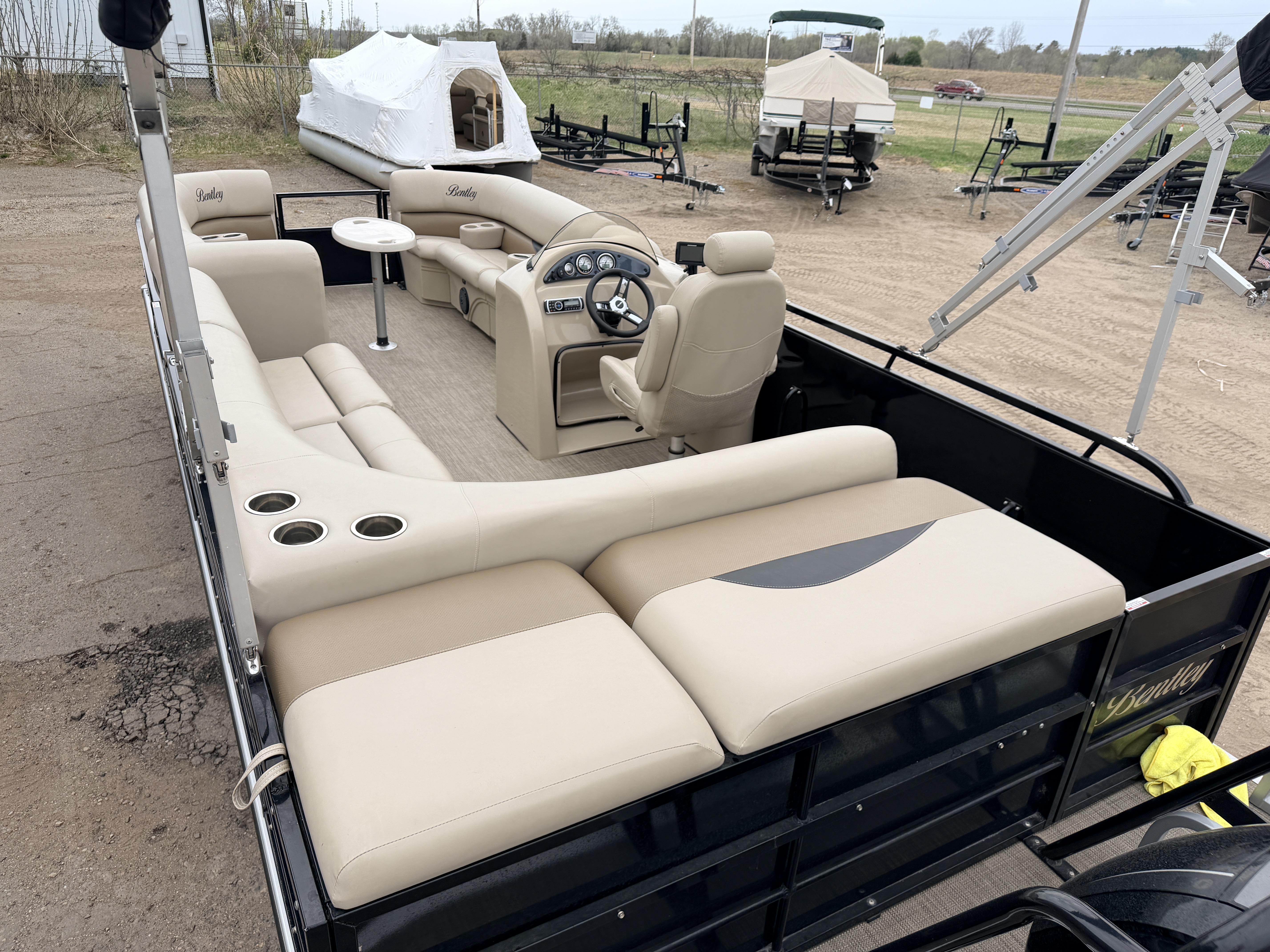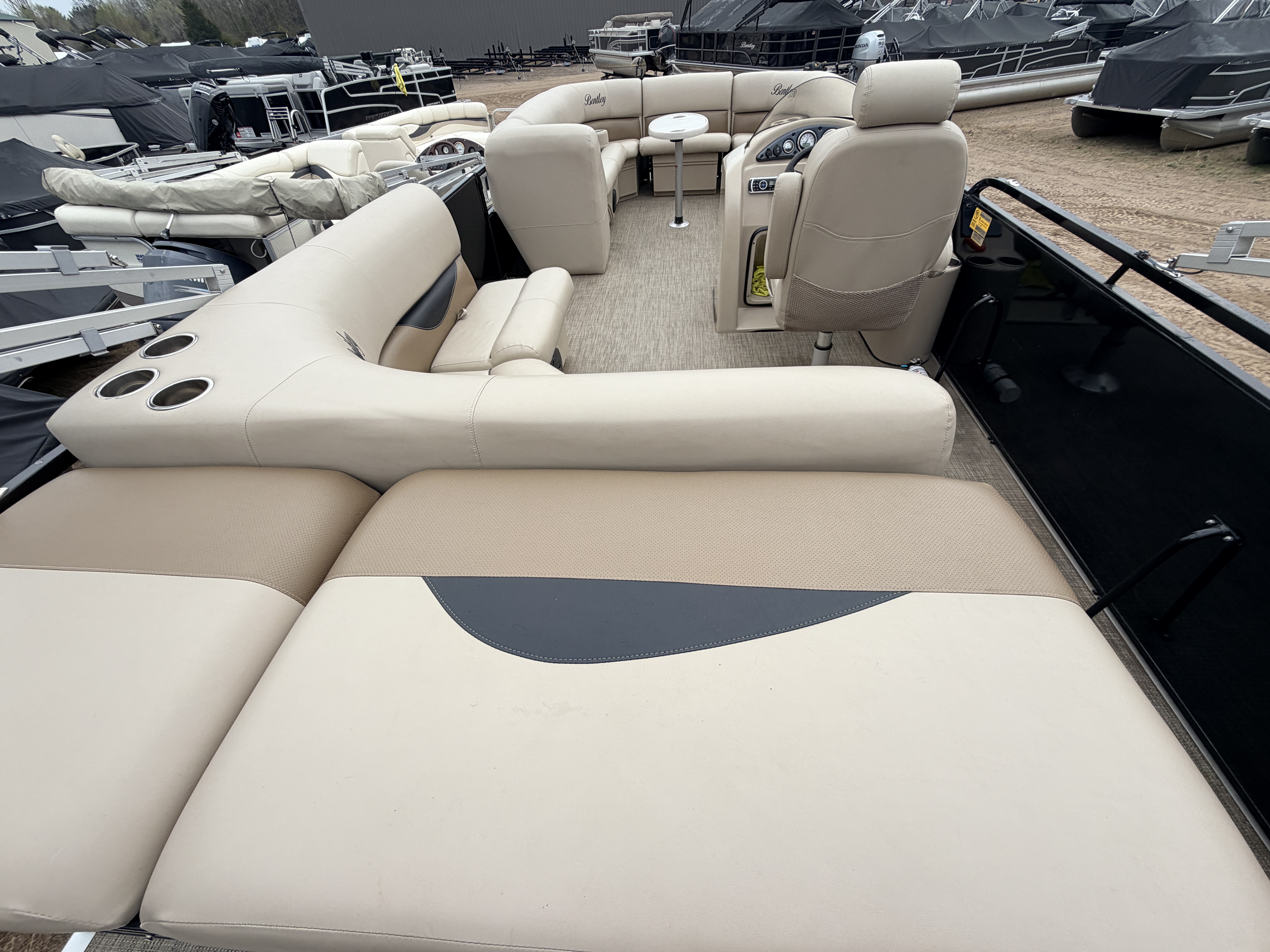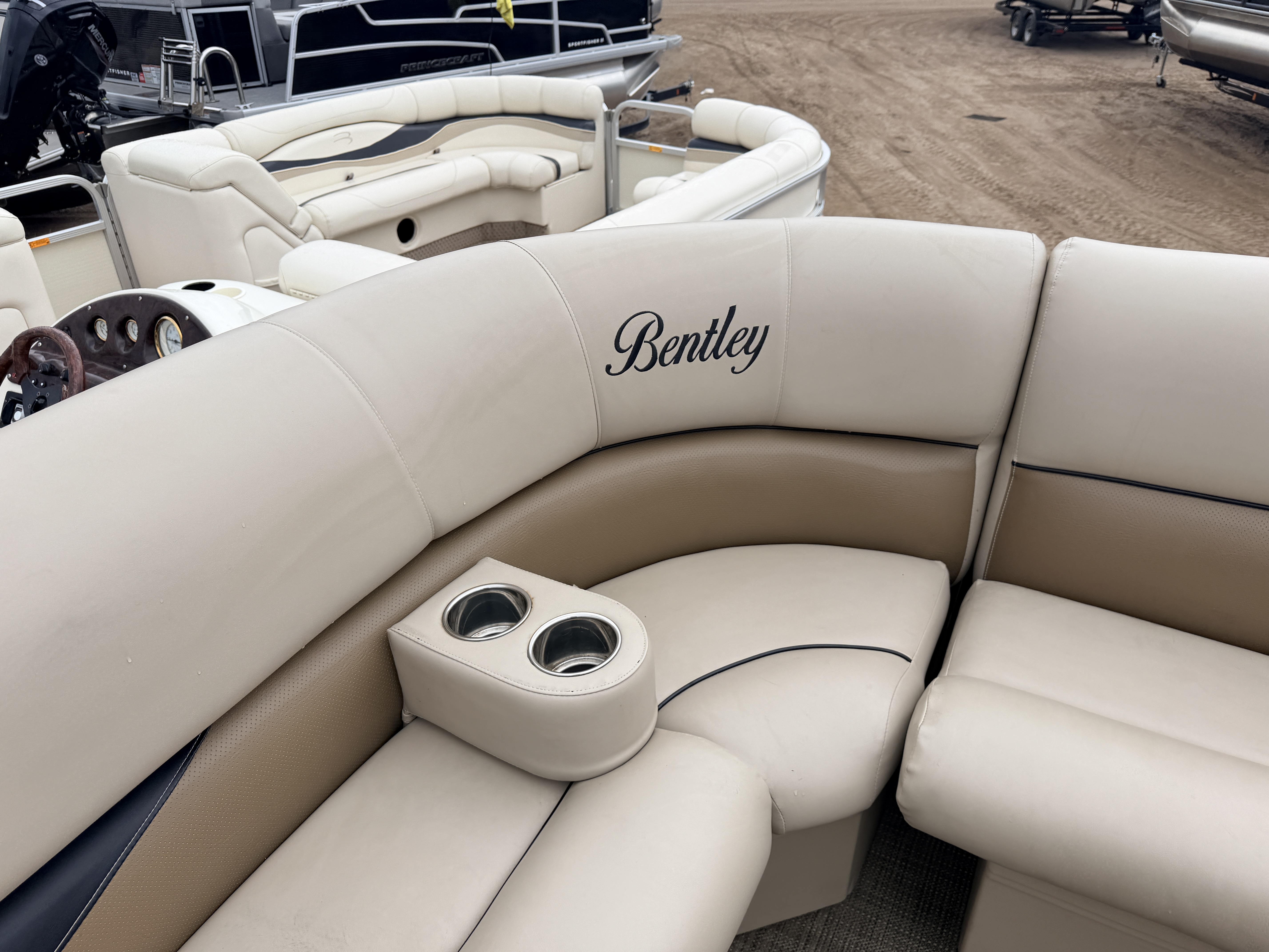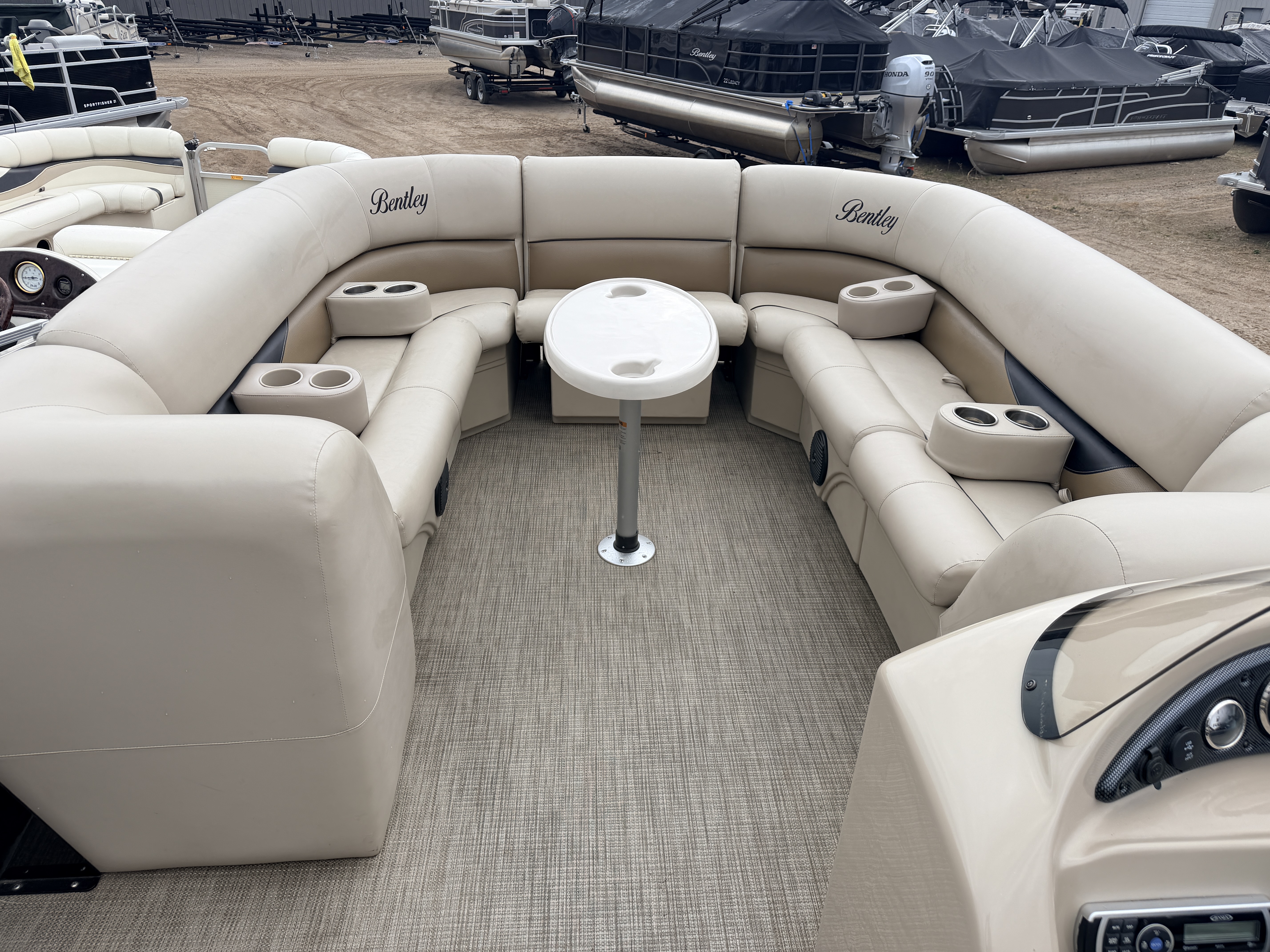2018 Bentley Encore 240 Cruise SE Pontoon & 150HP Mercury Fourstroke. Seating includes Dual Lounge Couches with movable Bow Filler, L-shaped Couch, Captain's Chair and Sun Deck. Features include Bimini Top, Table, In-Seat Storage, Speedometer, Tachometer and Fuel Gauges, Jensen MS2A Bluetooth Stereo, Courtesy Lights, and LED Navigation & Docking Lights. Additional features include Built-In Ski/Tow Bar, 4 Movable Cup Holders, Built-In Cooler, Livewell, Humminbird Helix 5 Depth/Fish Finder, and Privacy/Changing Station.