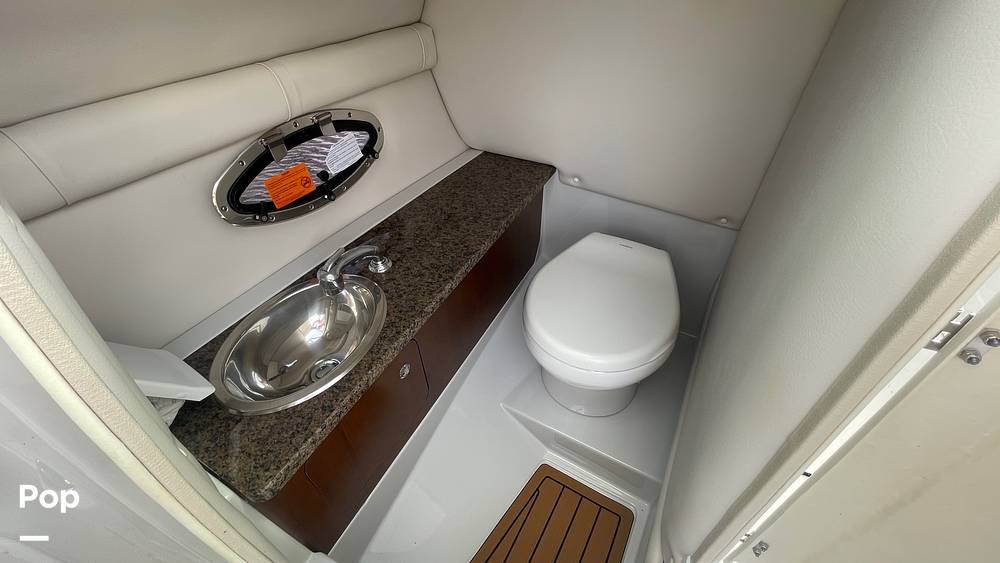Enjoy a premium Kicker stereo with waterproof speakers, a granite-top wet bar with sink and storage, an enclosed head compartment with porta-potty and portlight, a soft-touch swim platform mat, and a transom handheld shower.