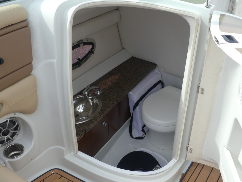 The spacious head compartment is enclosed with a handheld shower, beautiful cabinetry with granite countertop and sink, electric flush head and opening portlight. The storage netting designed into the head door keeps your toiletries secure.