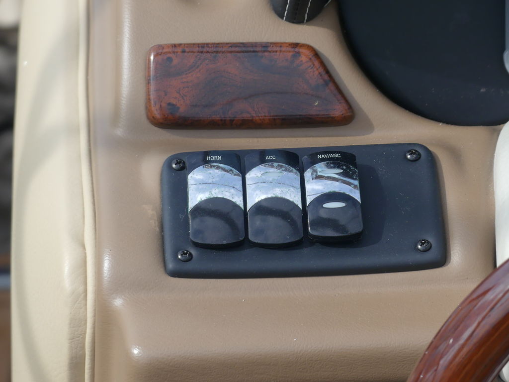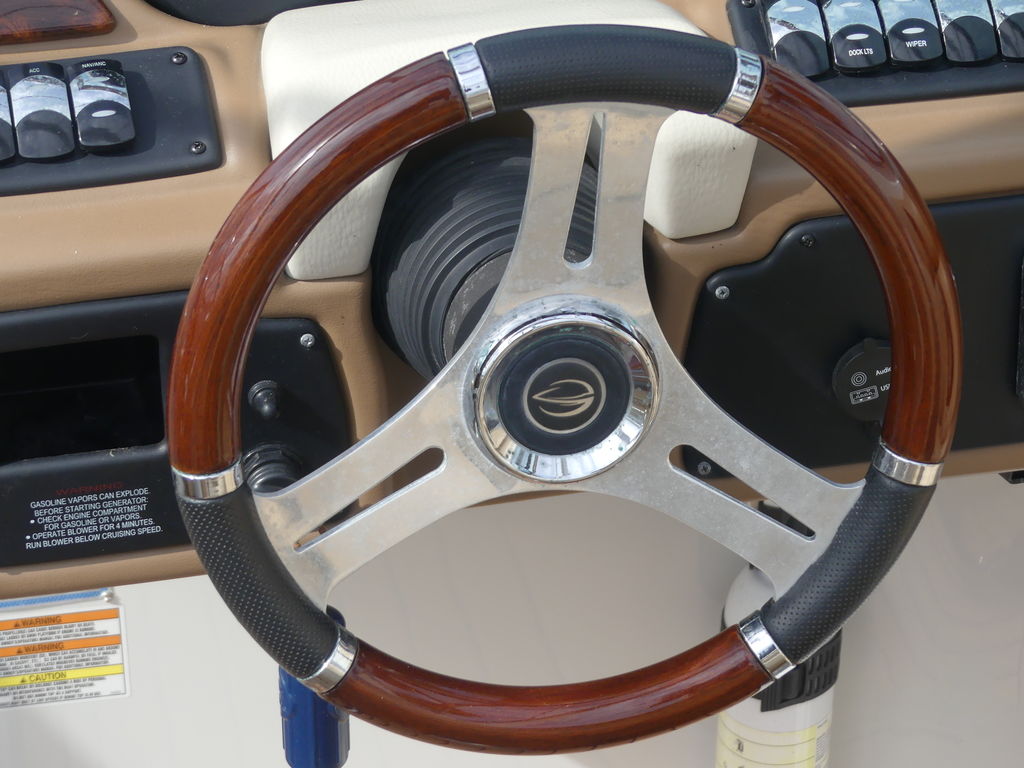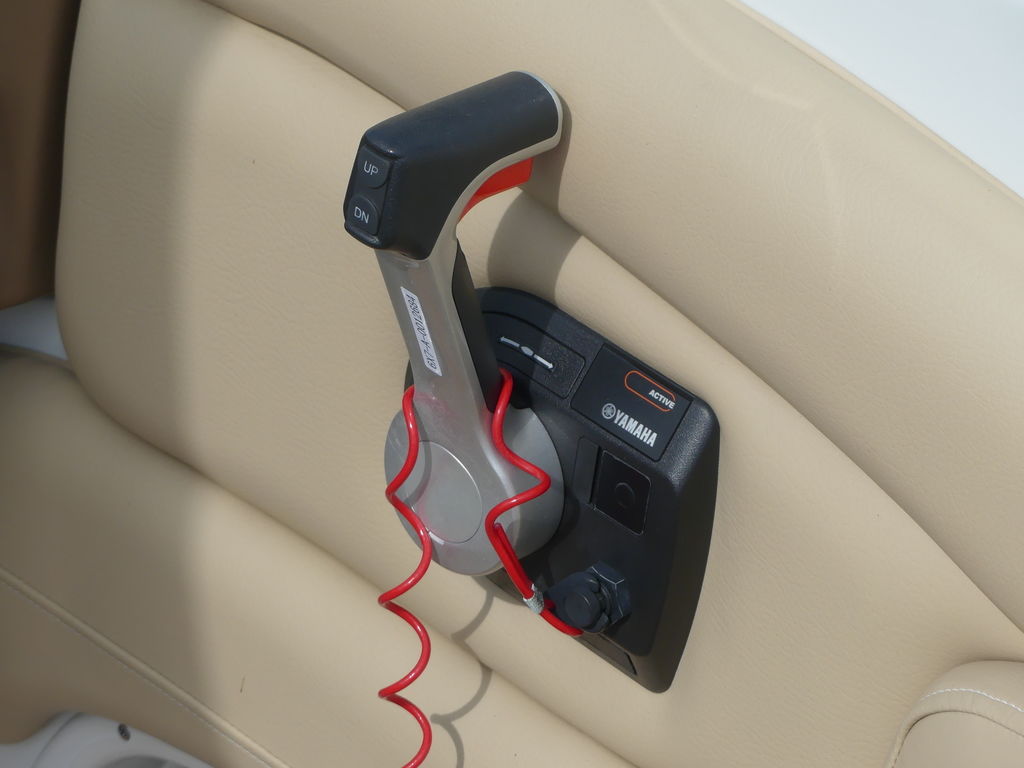 The E26 XS is well thought out and loaded with customer-driven standard features: bimini top, bow and cockpit canvas, six stainless steel pull up cleats, depth sounder, docking lights, dual battery switch, handheld transom shower, LED cockpit lighting, Raymarine A67 touchscreen MFD with sonar and engine information, Sea-Star hydraulic steering, Kicker marine stereo with six Wetsounds speakers, side mount portable table and much more!