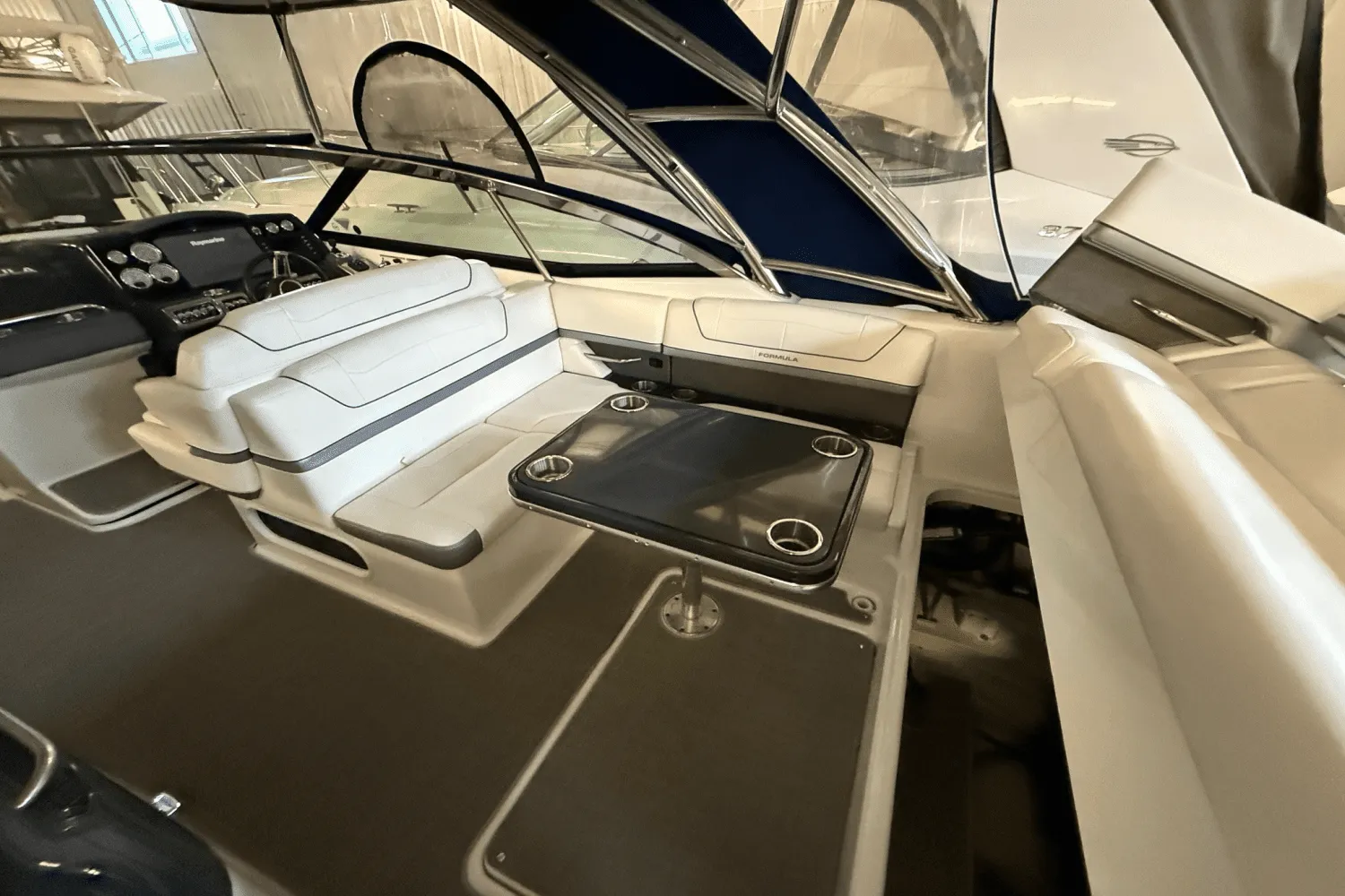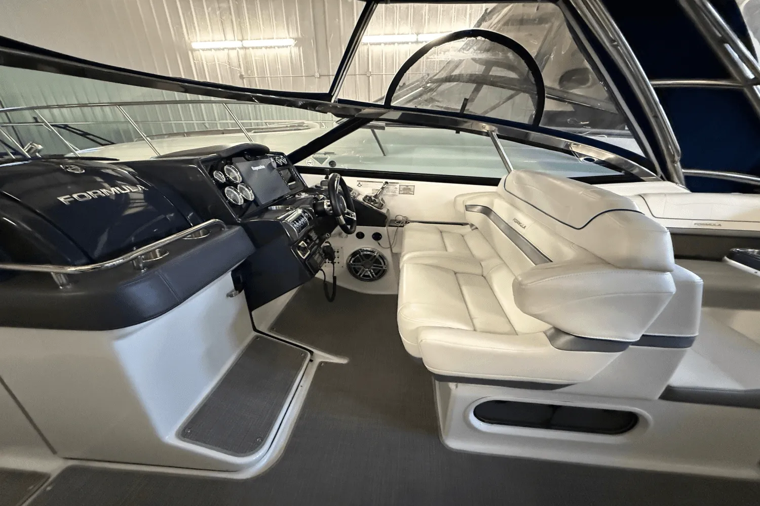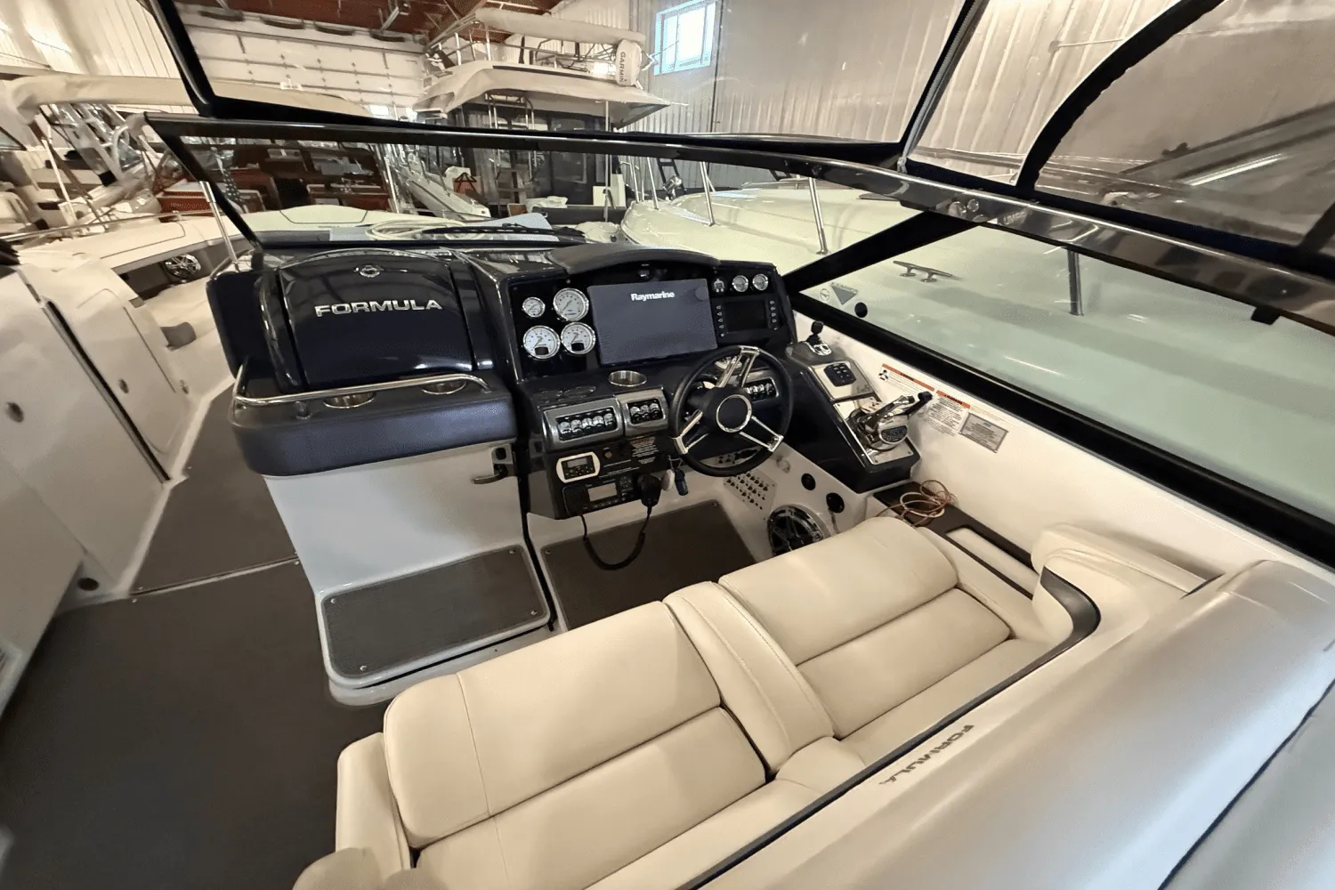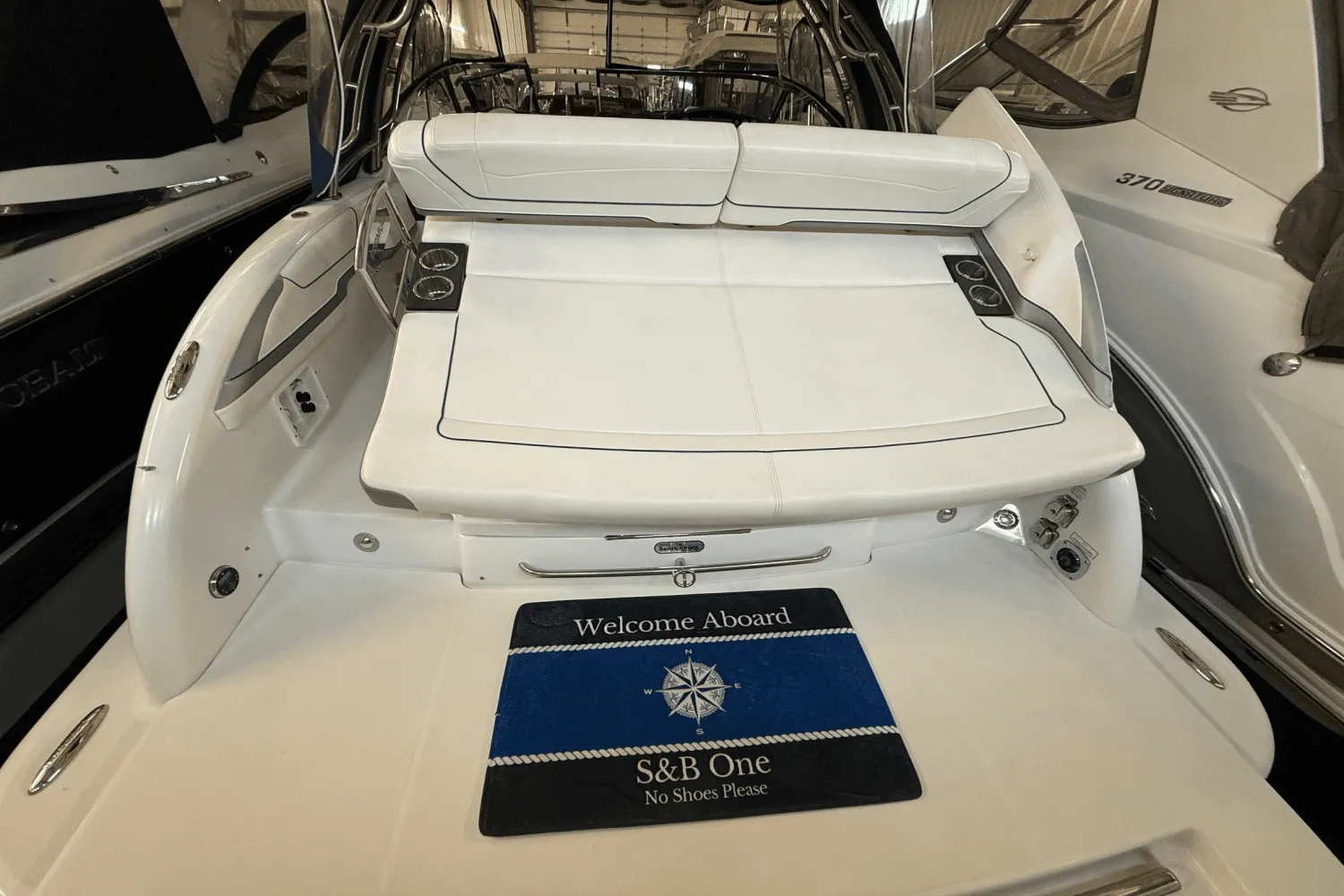 A quality boat with plenty of eye appeal, the formula 350 Crossover bowrider (CBR) bridges the gap between a high-performance sportboat and luxury express cruiser. The 350 is an impressive product, she combines the overnight accommodations of a cruiser, the huge seating area forward of a deckboat, and the cabin accommodations of an express boat. it's a clever combination and the sheer size of this giant bowrider makes her the ultimate day boat. With the bow walk-thru offset to port, the cabin is entered from the helm area. Stepping below, immediately to starboard is a posh double-wide lounge with storage above. An enclosed head with Corian counter and VacuFlush head is forward of the lounge, and a centerline galley with microwave, concealed sink, and pullout refrigerator is all the way forward. The double-size aft berth has sitting headroom. In the cockpit, the U-shaped lounge seats six and its aft section converts to a recliner for two. The aft-facing transom lounge converts to a full-length sun pad. Call today to schedule a showing.