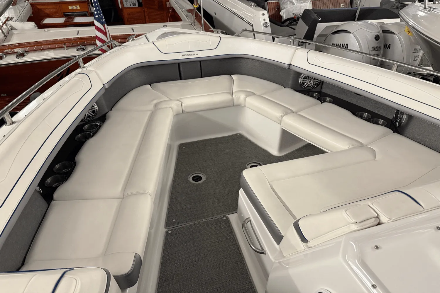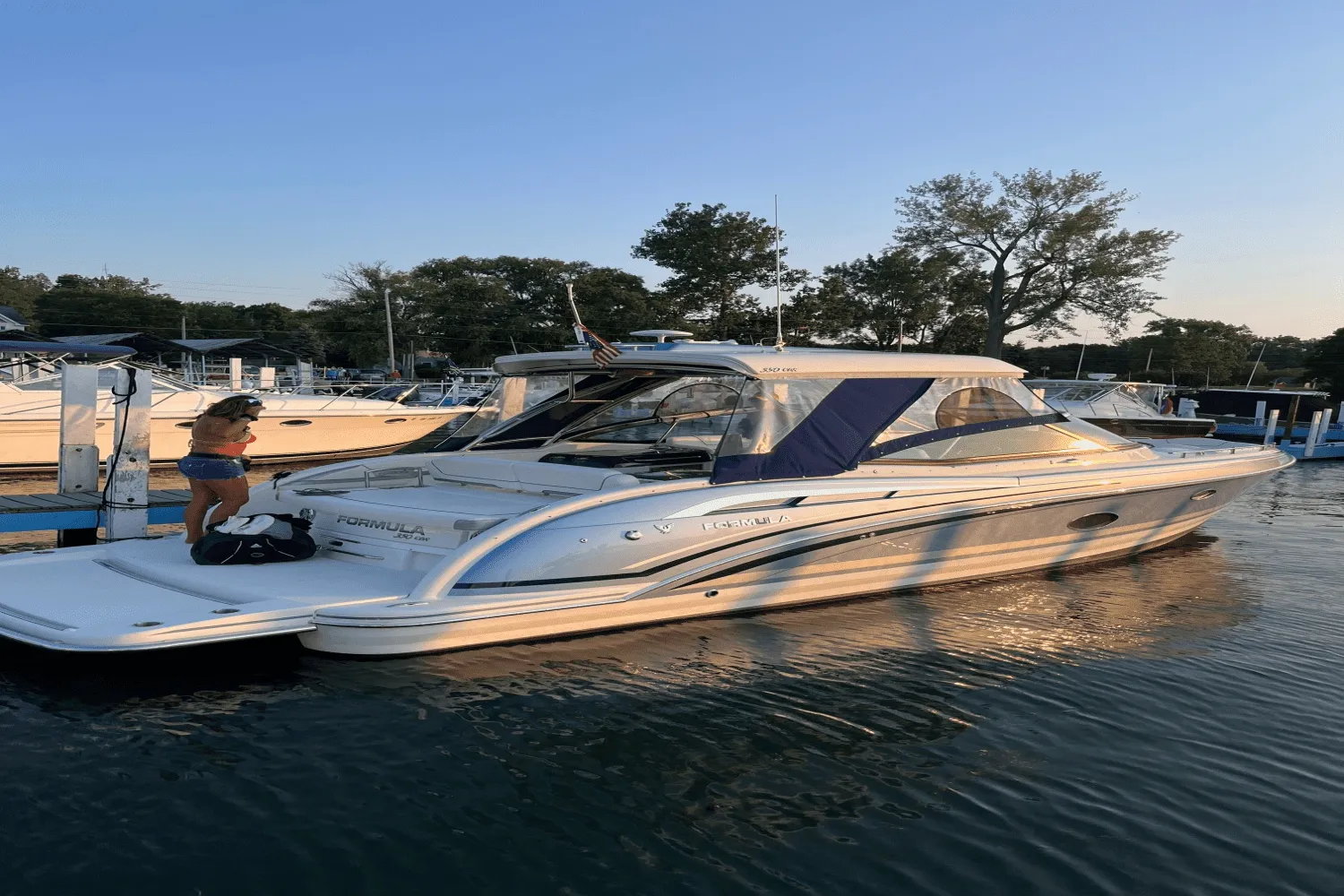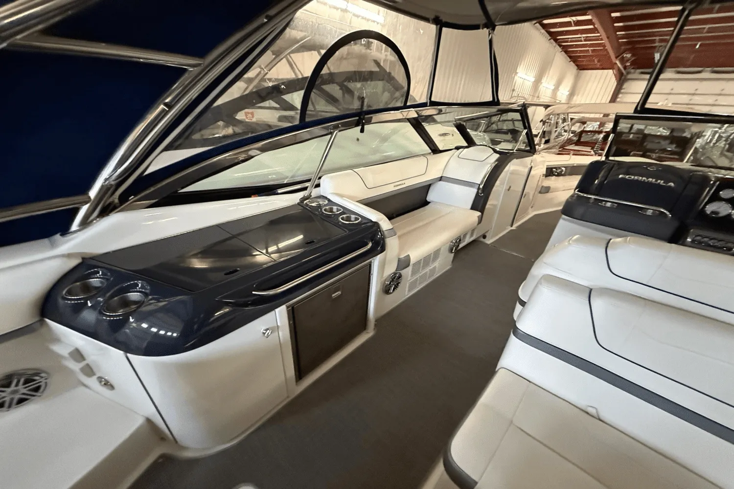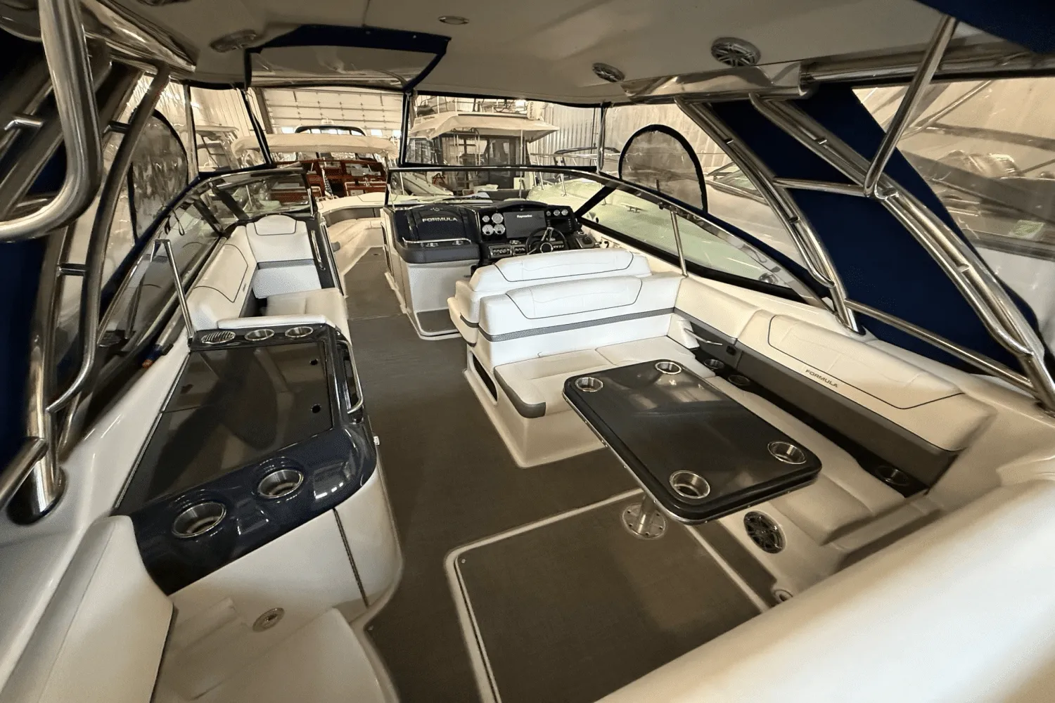 A quality boat with plenty of eye appeal, the formula 350 Crossover bowrider (CBR) bridges the gap between a high-performance sportboat and luxury express cruiser. The 350 is an impressive product, she combines the overnight accommodations of a cruiser, the huge seating area forward of a deckboat, and the cabin accommodations of an express boat. it's a clever combination and the sheer size of this giant bowrider makes her the ultimate day boat. With the bow walk-thru offset to port, the cabin is entered from the helm area. Stepping below, immediately to starboard is a posh double-wide lounge with storage above. An enclosed head with Corian counter and VacuFlush head is forward of the lounge, and a centerline galley with microwave, concealed sink, and pullout refrigerator is all the way forward. The double-size aft berth has sitting headroom. In the cockpit, the U-shaped lounge seats six and its aft section converts to a recliner for two. The aft-facing transom lounge converts to a full-length sun pad. Call today to schedule a showing.