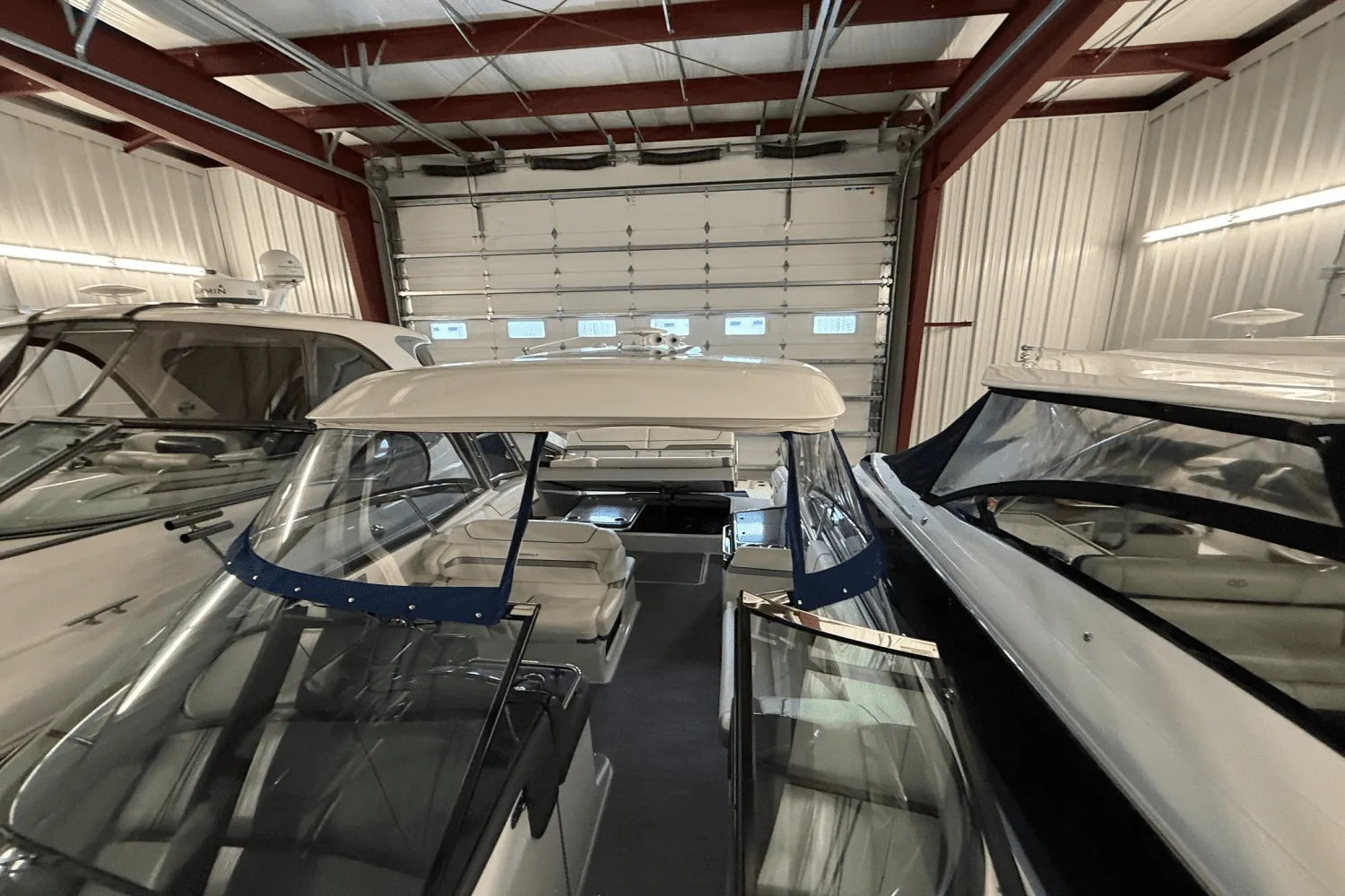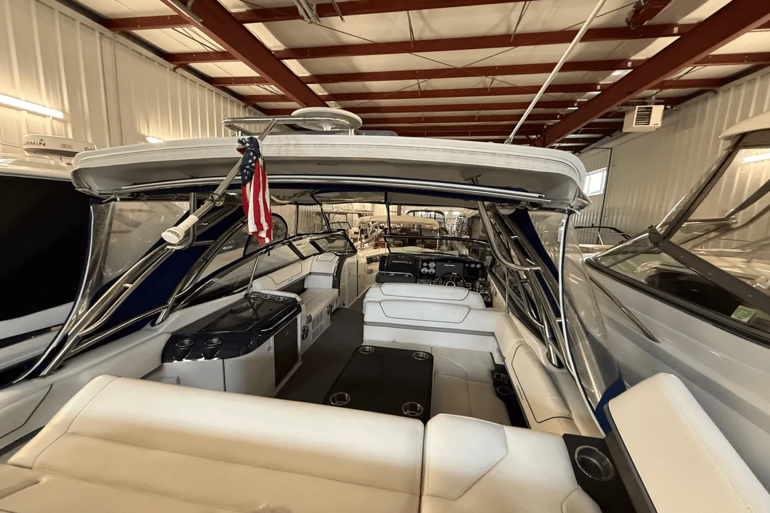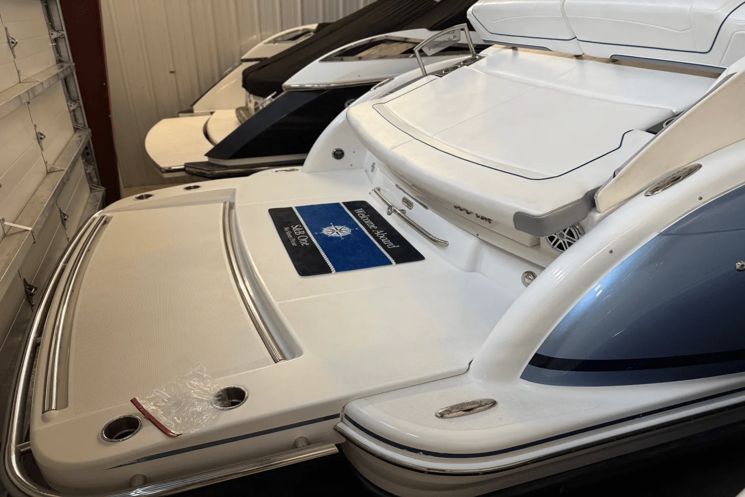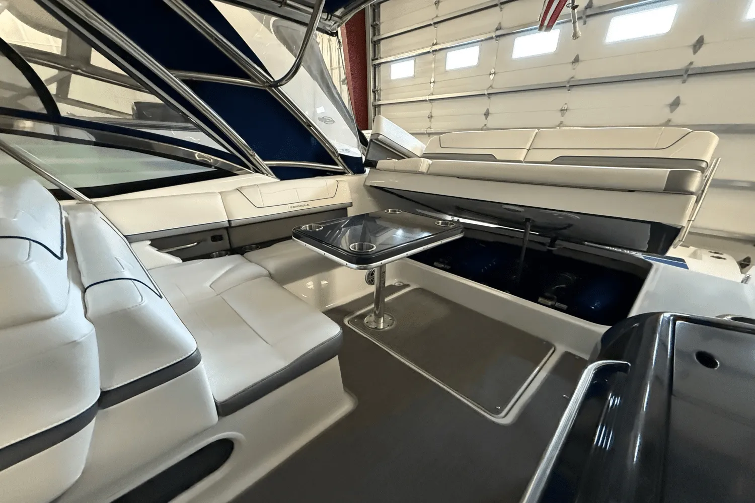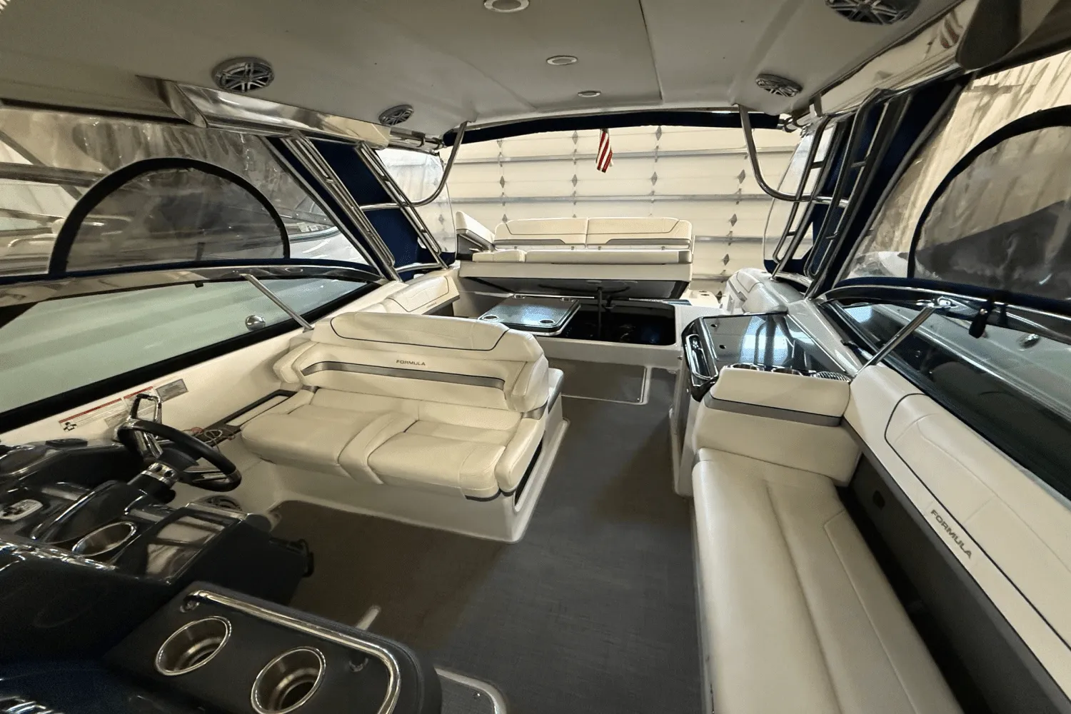 A quality boat with plenty of eye appeal, the formula 350 Crossover bowrider (CBR) bridges the gap between a high-performance sportboat and luxury express cruiser. The 350 is an impressive product, she combines the overnight accommodations of a cruiser, the huge seating area forward of a deckboat, and the cabin accommodations of an express boat. it's a clever combination and the sheer size of this giant bowrider makes her the ultimate day boat. With the bow walk-thru offset to port, the cabin is entered from the helm area. Stepping below, immediately to starboard is a posh double-wide lounge with storage above. An enclosed head with Corian counter and VacuFlush head is forward of the lounge, and a centerline galley with microwave, concealed sink, and pullout refrigerator is all the way forward. The double-size aft berth has sitting headroom. In the cockpit, the U-shaped lounge seats six and its aft section converts to a recliner for two. The aft-facing transom lounge converts to a full-length sun pad. Call today to schedule a showing.