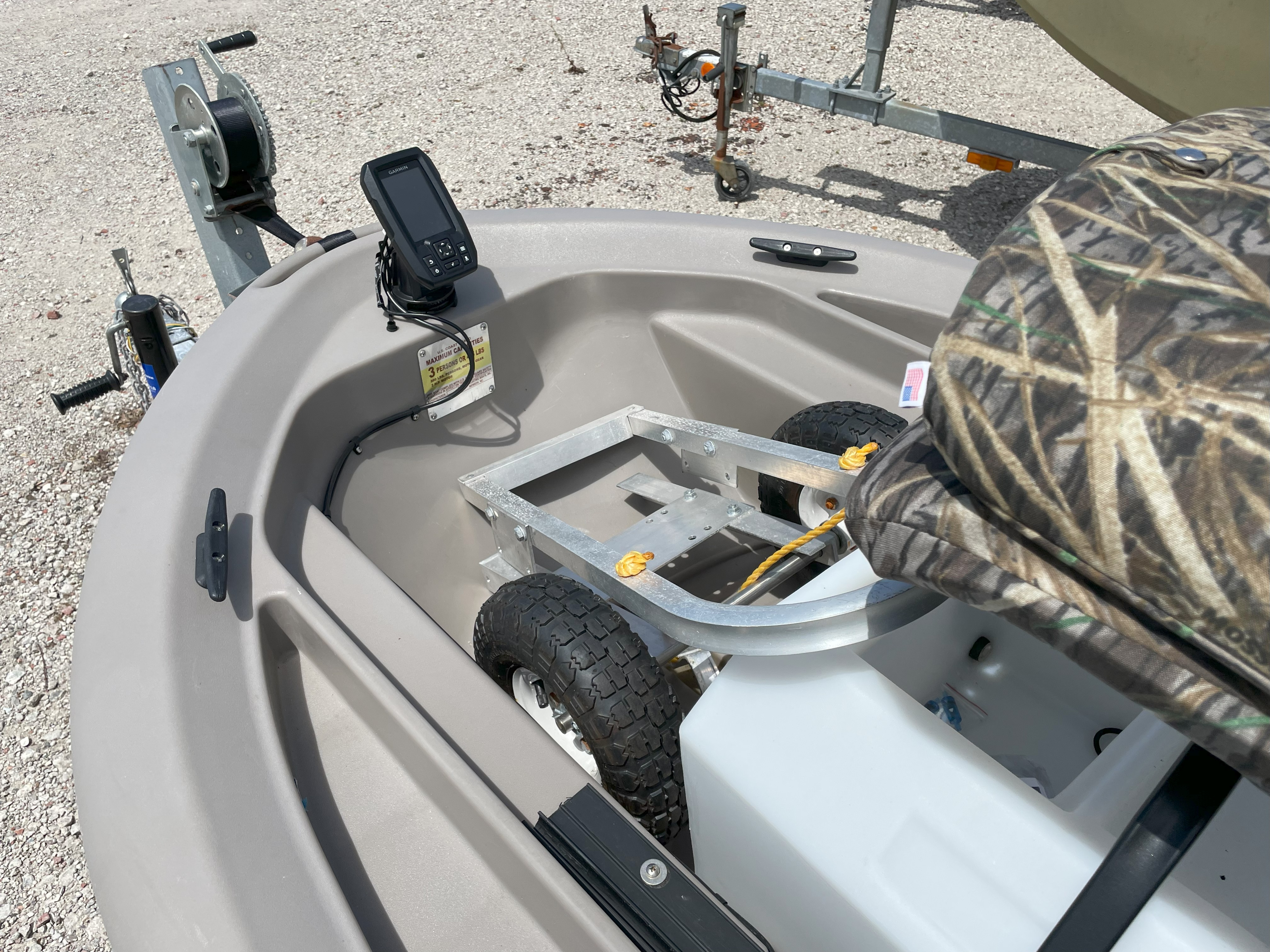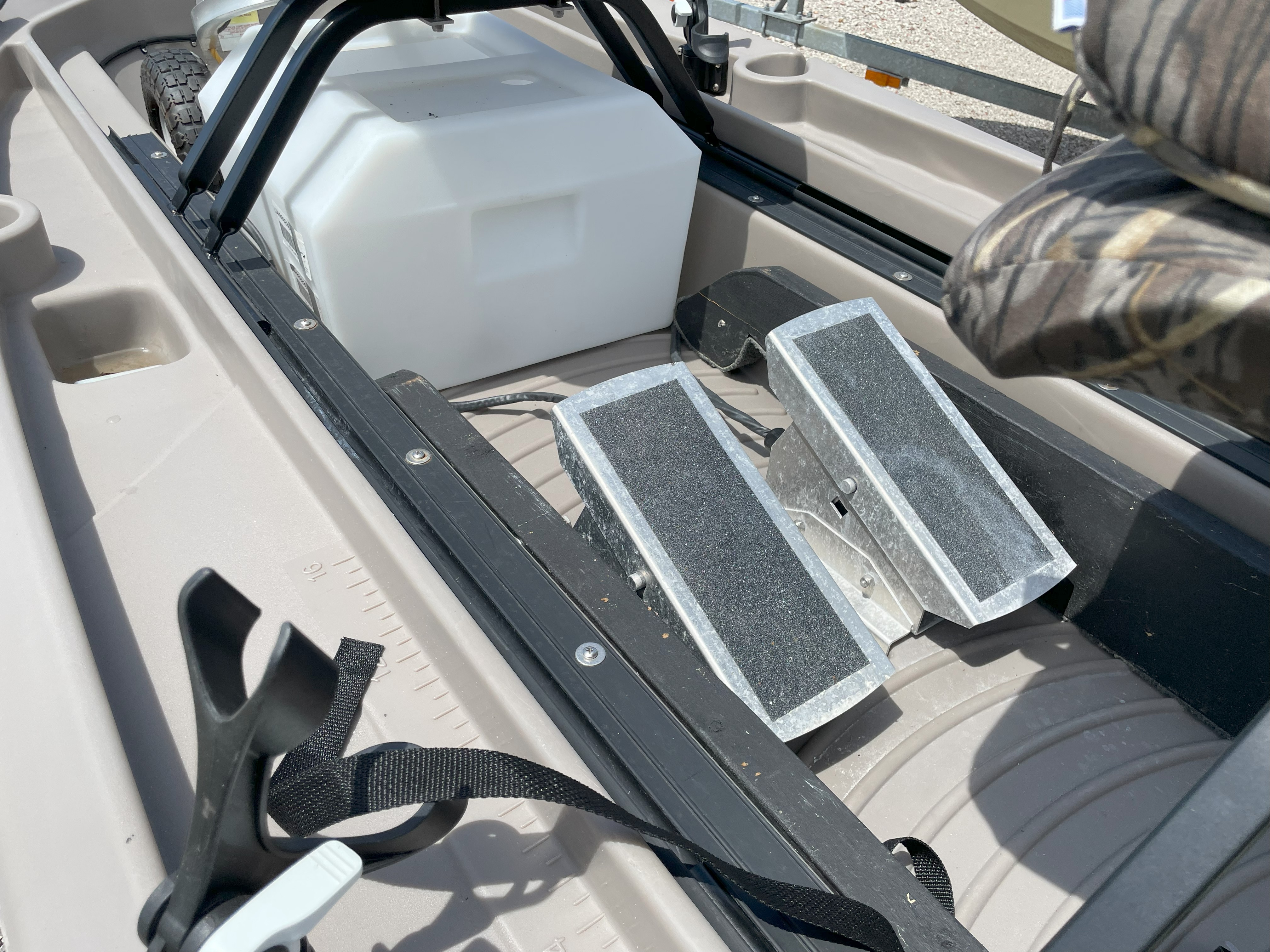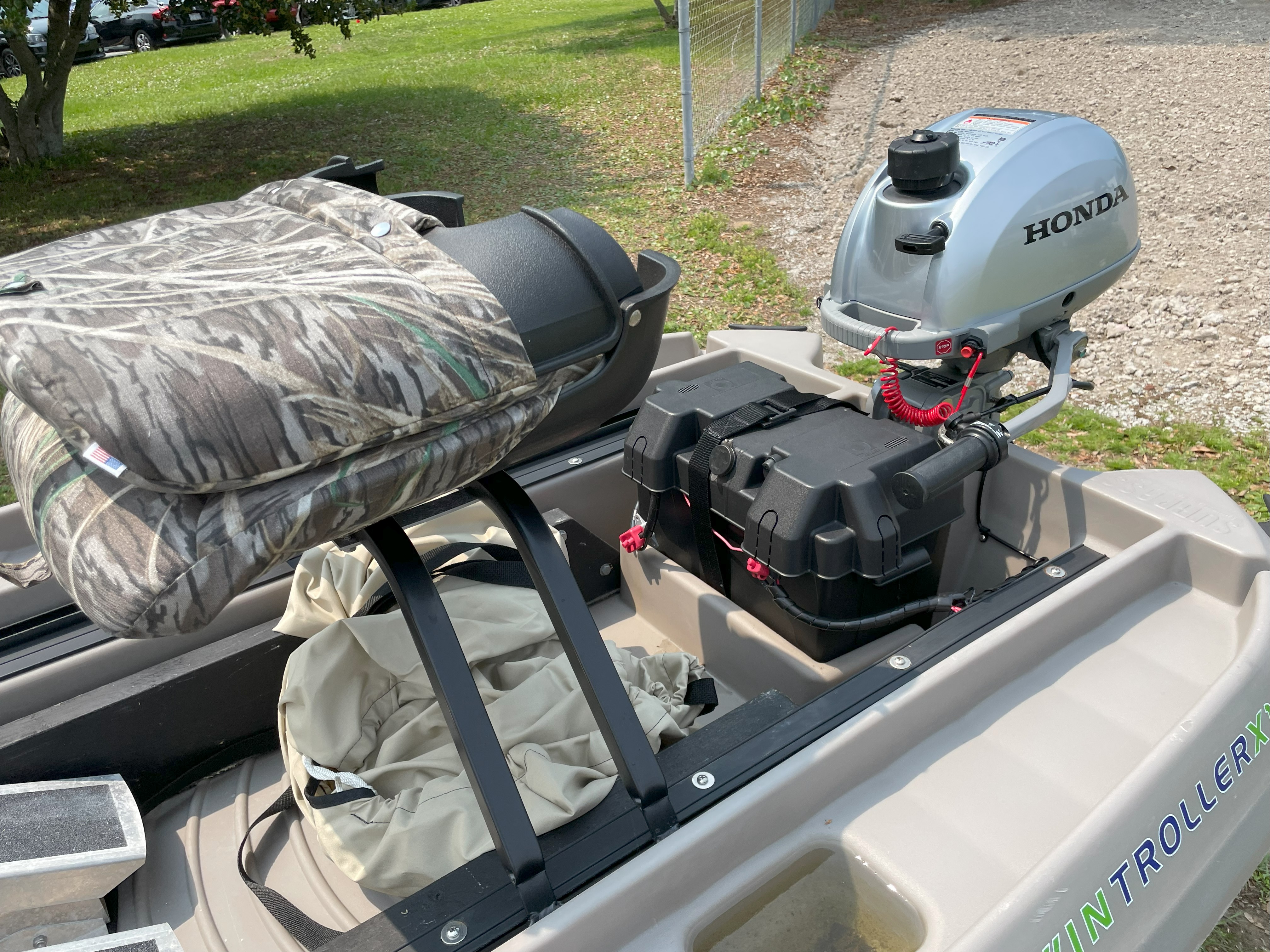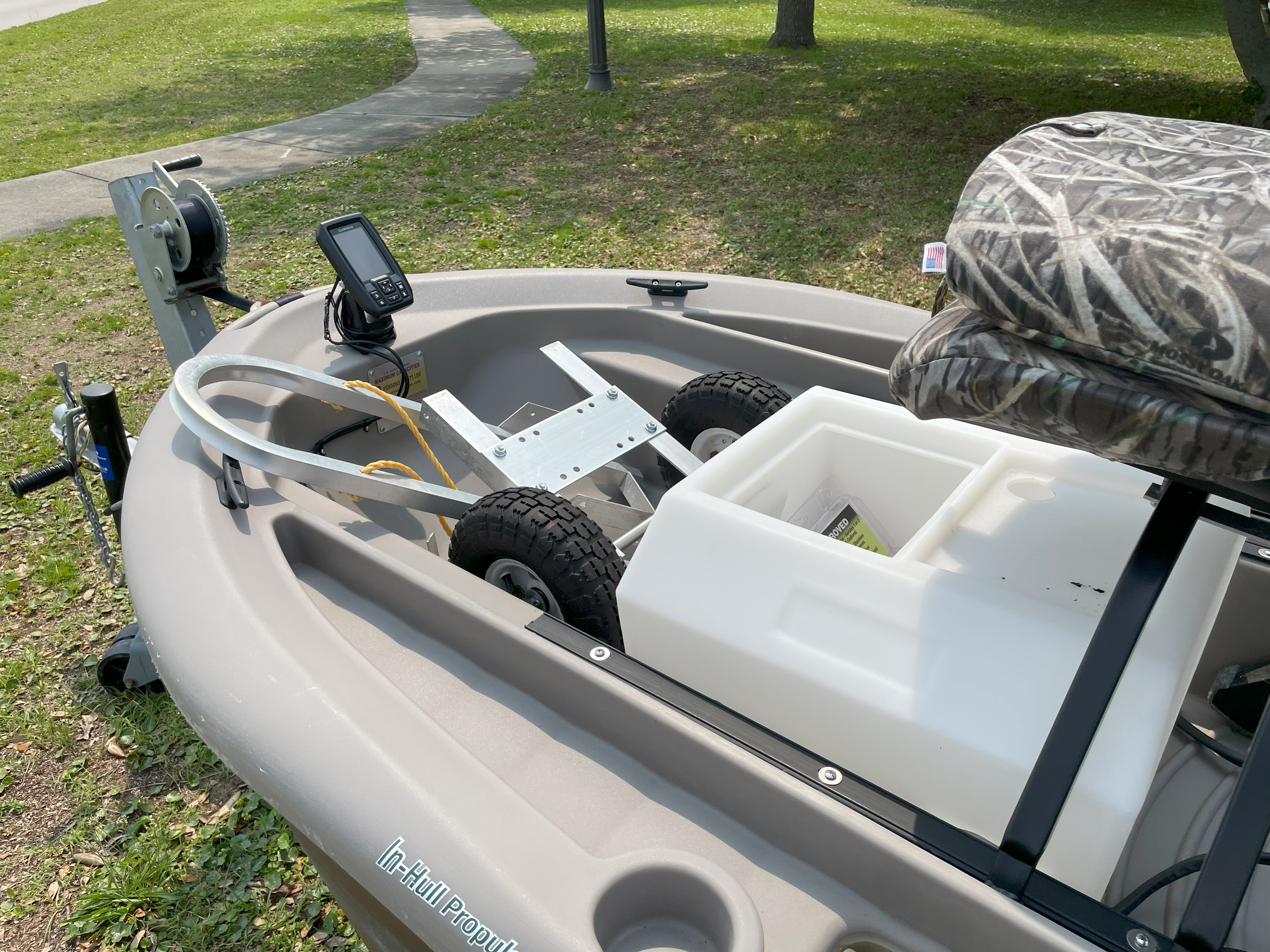 Two seats with cushions, dolly, Boat cover, battery, livewell