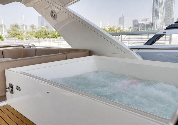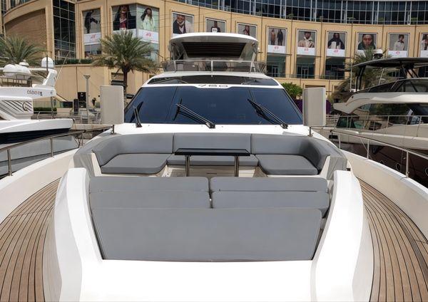 Expansive flybridge with helm station, wet bar, and panoramic lounge space