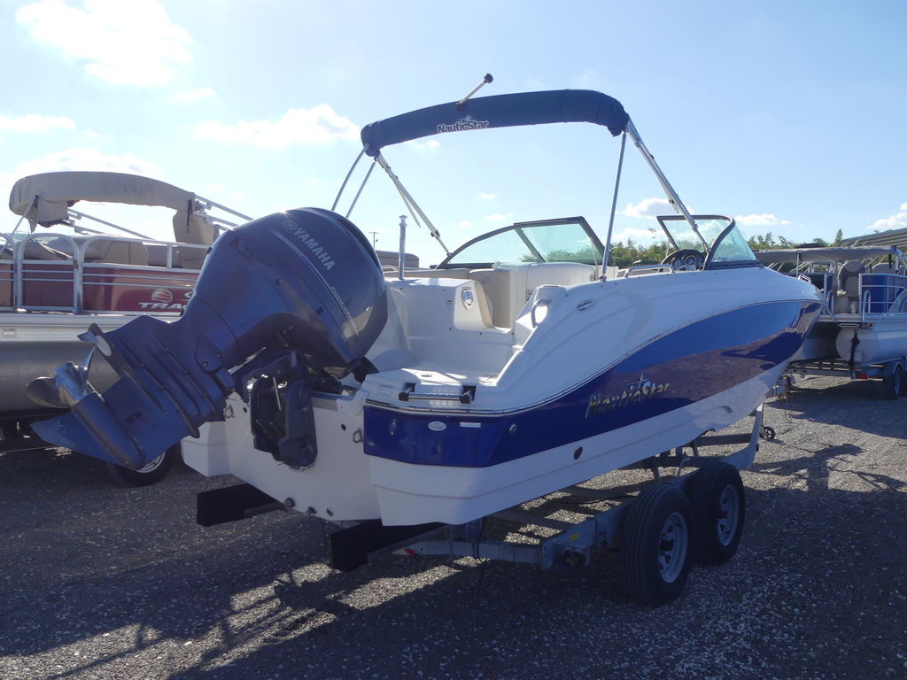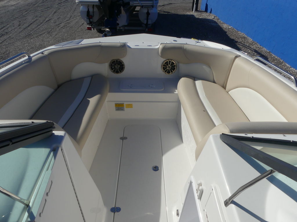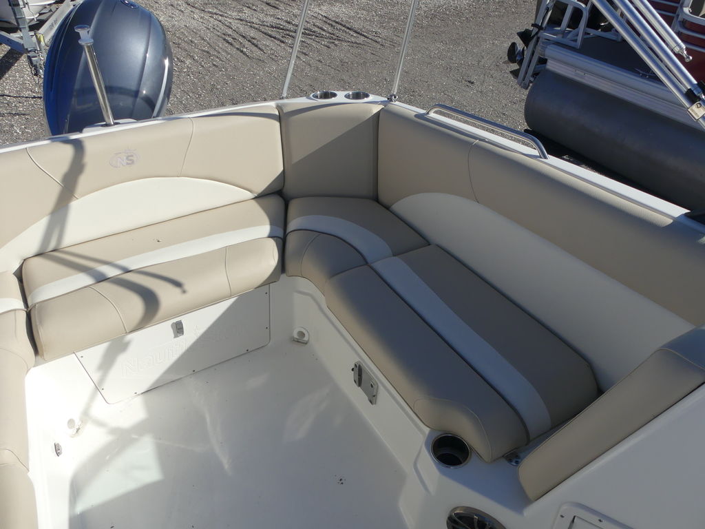 Enjoy the drive and ride of a V-Hull and beach party capacity of a deck style boat with the new generation design of the 223 DC. Runabout styling-deck boat efficient, the 223 DC has it all. Convenience and comfort features include a panoramic wraparound walk-thru windshield, portside mid-ship enclosed dressing room, “leather touch upholstery”, and NauticStar’s STAR Performance System. Some of the construction and design features include 11 drink holders, 7 storage compartments and 100% wood free construction. Top that off with the Infinity® stereo system with 4-waterproof speakers and you will show up to the beach party in comfort and style in the 223 DC.