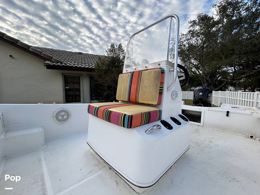 It has a deep-V hull design for stability in rough waters. It has a self-bailing cockpit and large casting decks fore and aft. There is a nice-sized insulated in-deck fish box, a deluxe console with rod holders, and a windscreen. The cooler seat has a stainless steel flip-back backrest. It has a large fold-down bimini top that provides plenty of shade.
