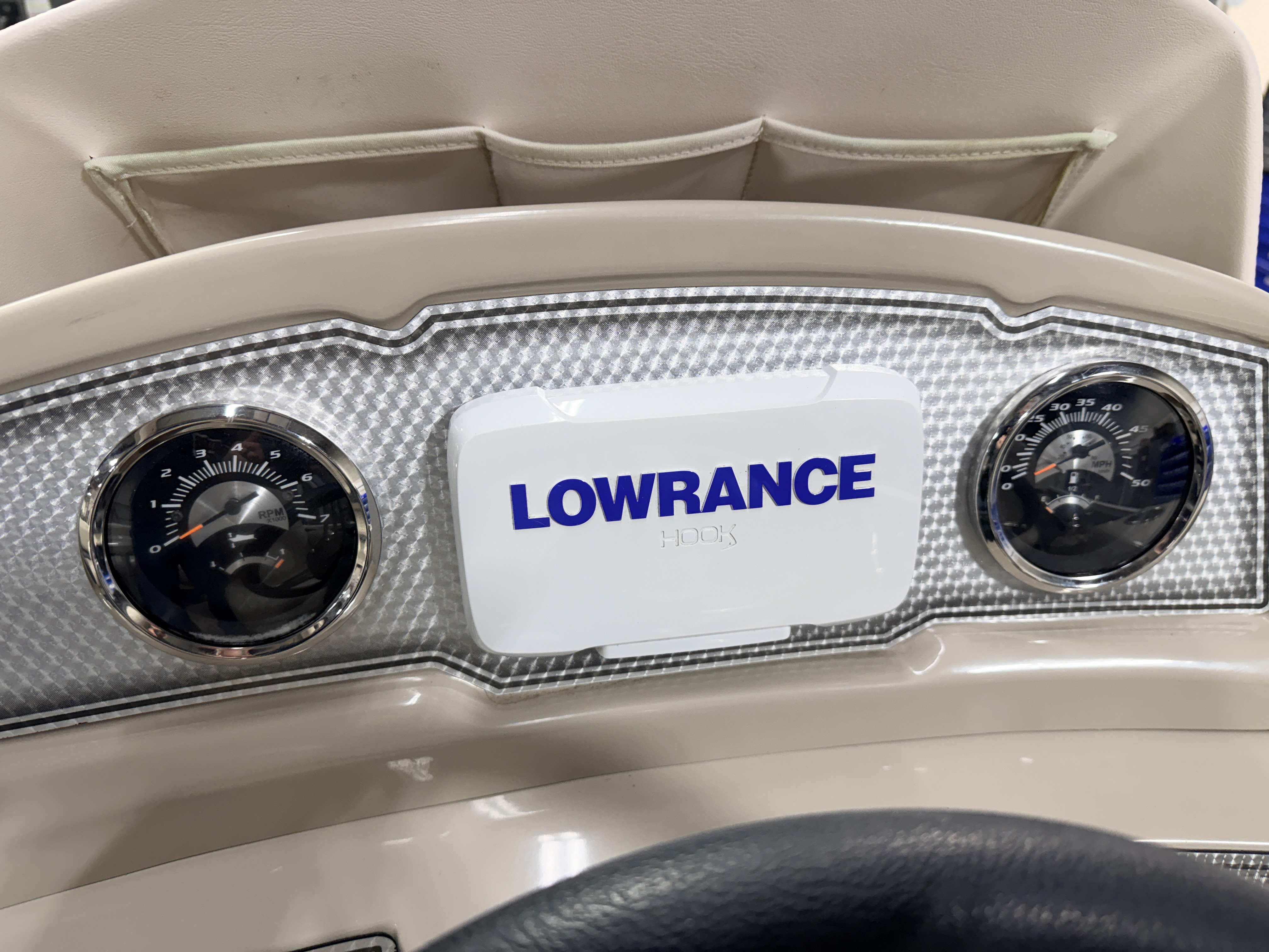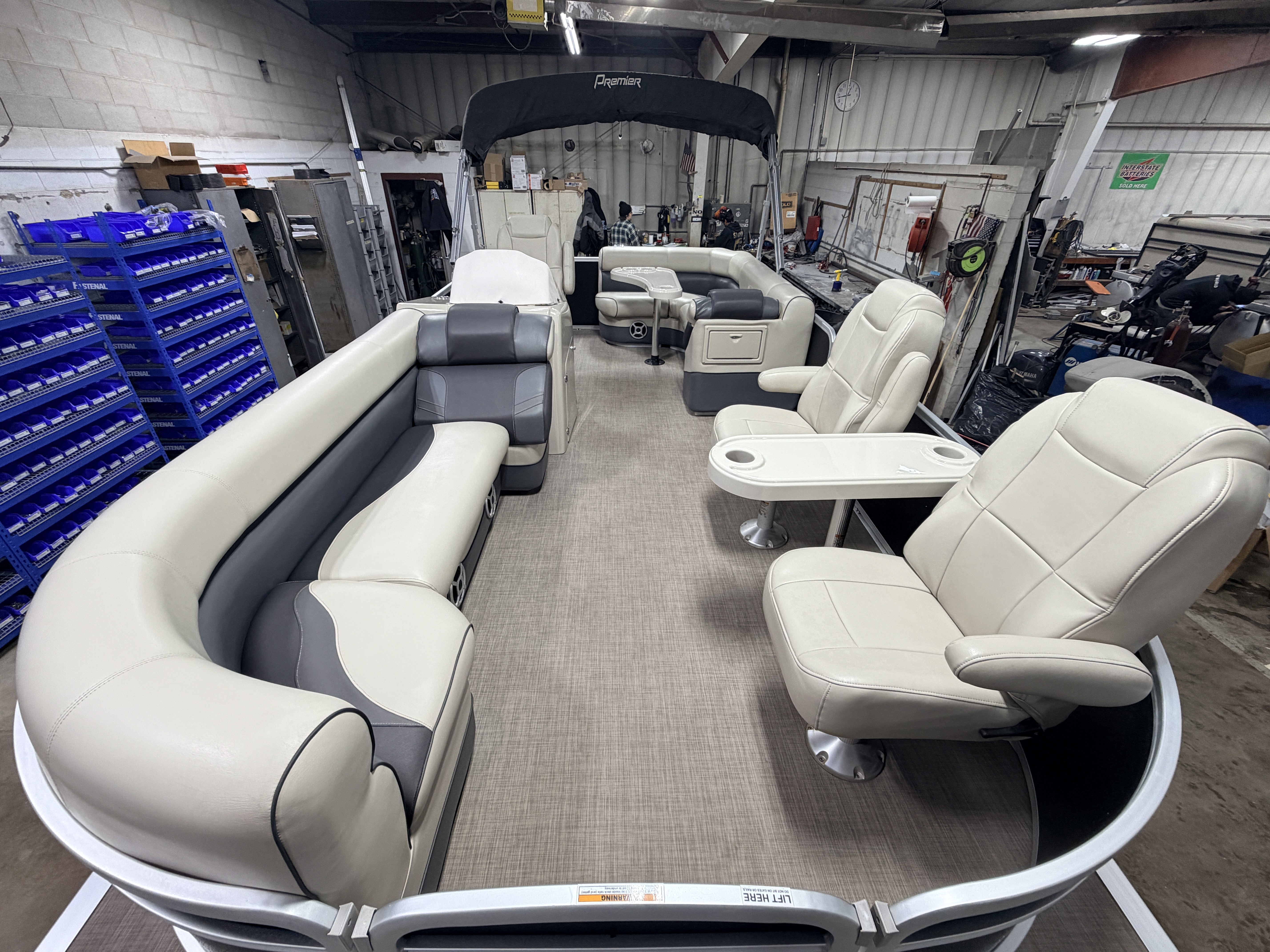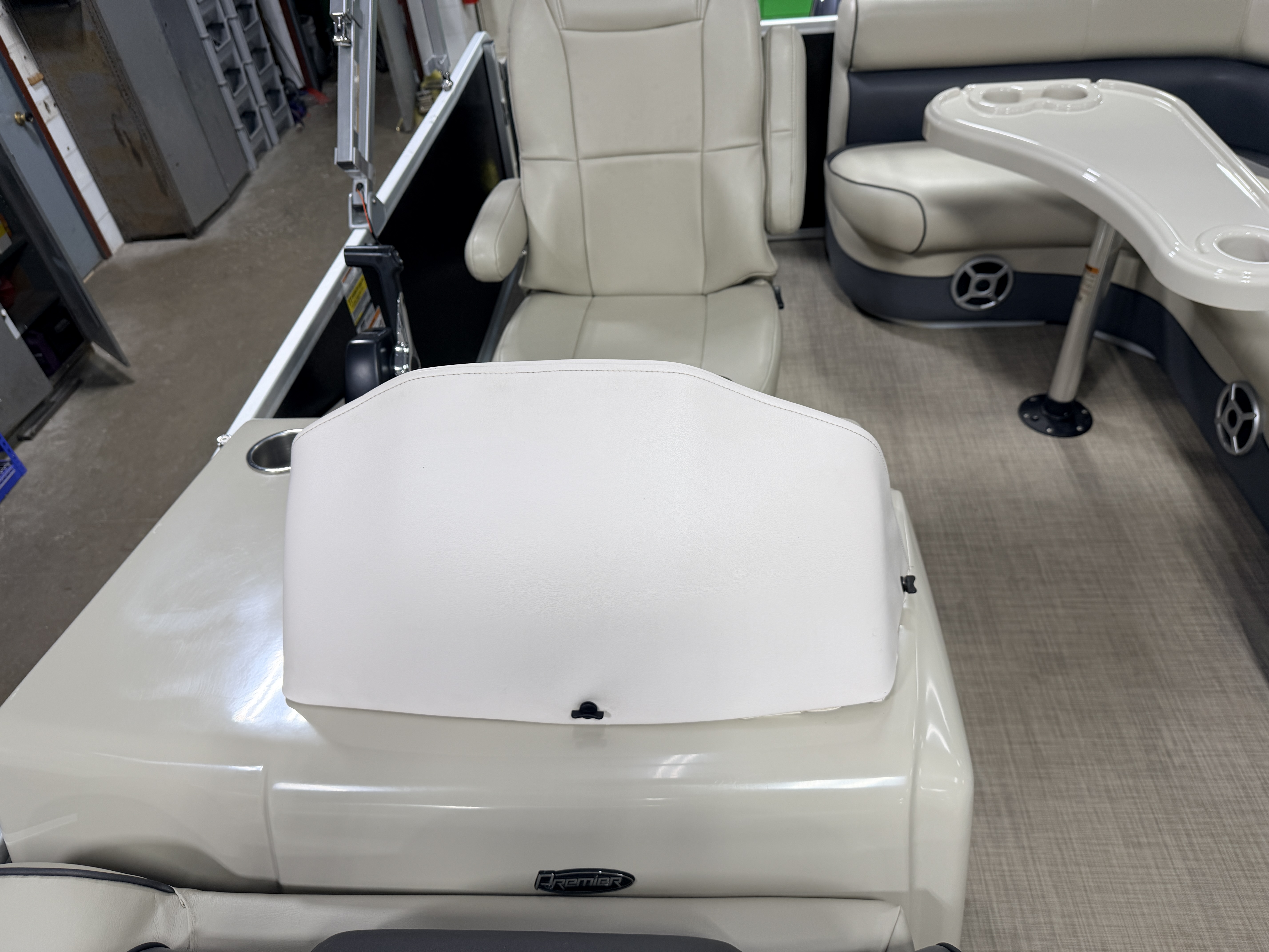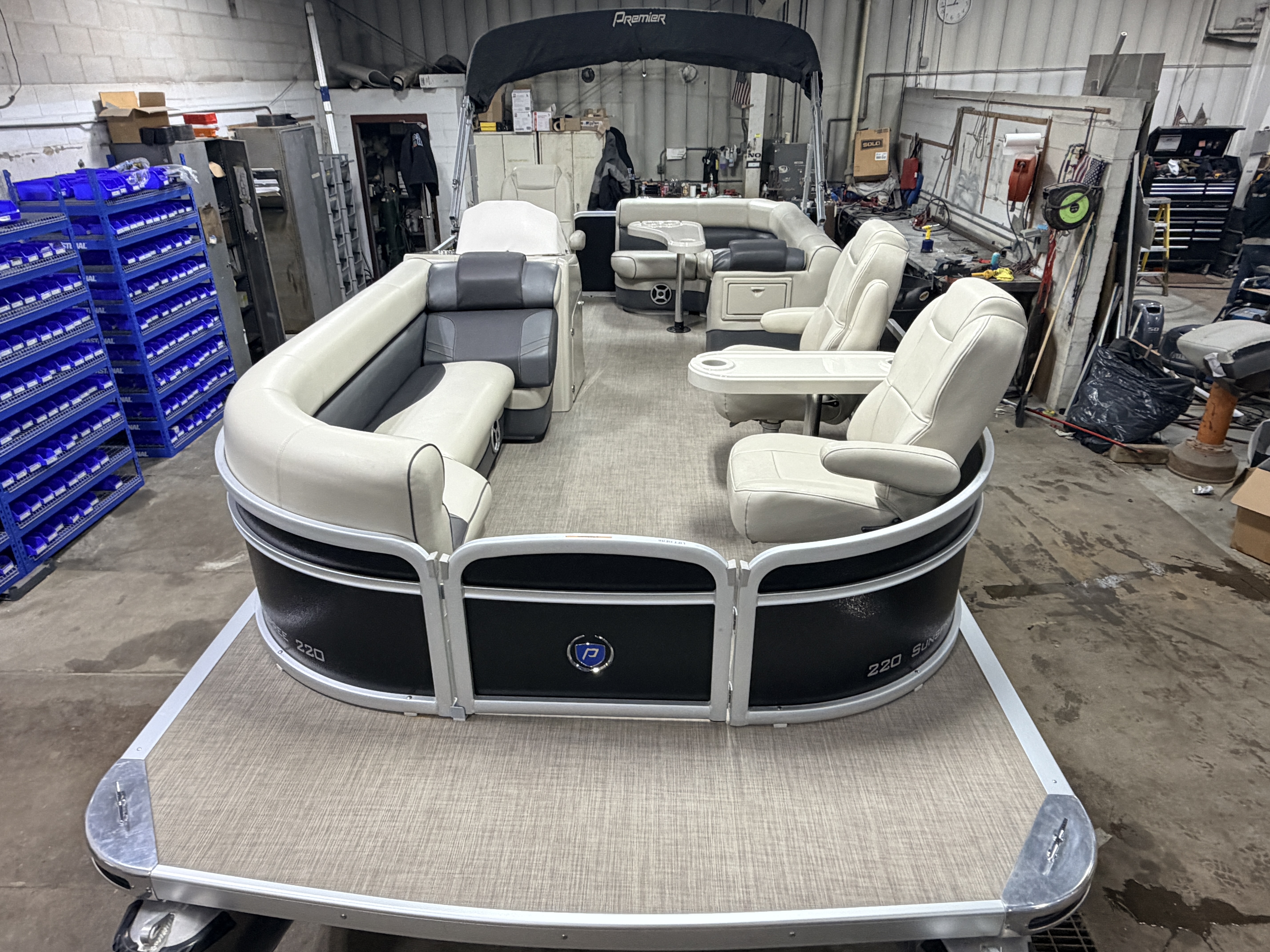 2018 Premier 220 SunSpree Pontoon with 50HP Yamaha Fourstroke EFI Outboard. This cruise model pontoon also features a DL group. This is a Dual Lounge chair option which turns a couch into 2 captain's chairs with a table between them. The Starboard side has a lounge style couch with storage under the lounge backrest. This is up against the helm which features a Speedometer, Tachometer, Fuel and Trim gauge. There is a Lowrance Hook 4x GPS depth/fish finder. There is a Marine Audio Bluetooth audio stereo system. This unit features a vinyl sleeve over the windshield with pockets for small item storage. There is a courtesy light on the side of the helm. Back on the port side, there is a L-shaped couch with a trash can in the lounge backrest and a (re)movable table. The rear entry gate on the starboard side leads to a stern swim platform and fold down swim ladder. There is also a swim platform on the front.