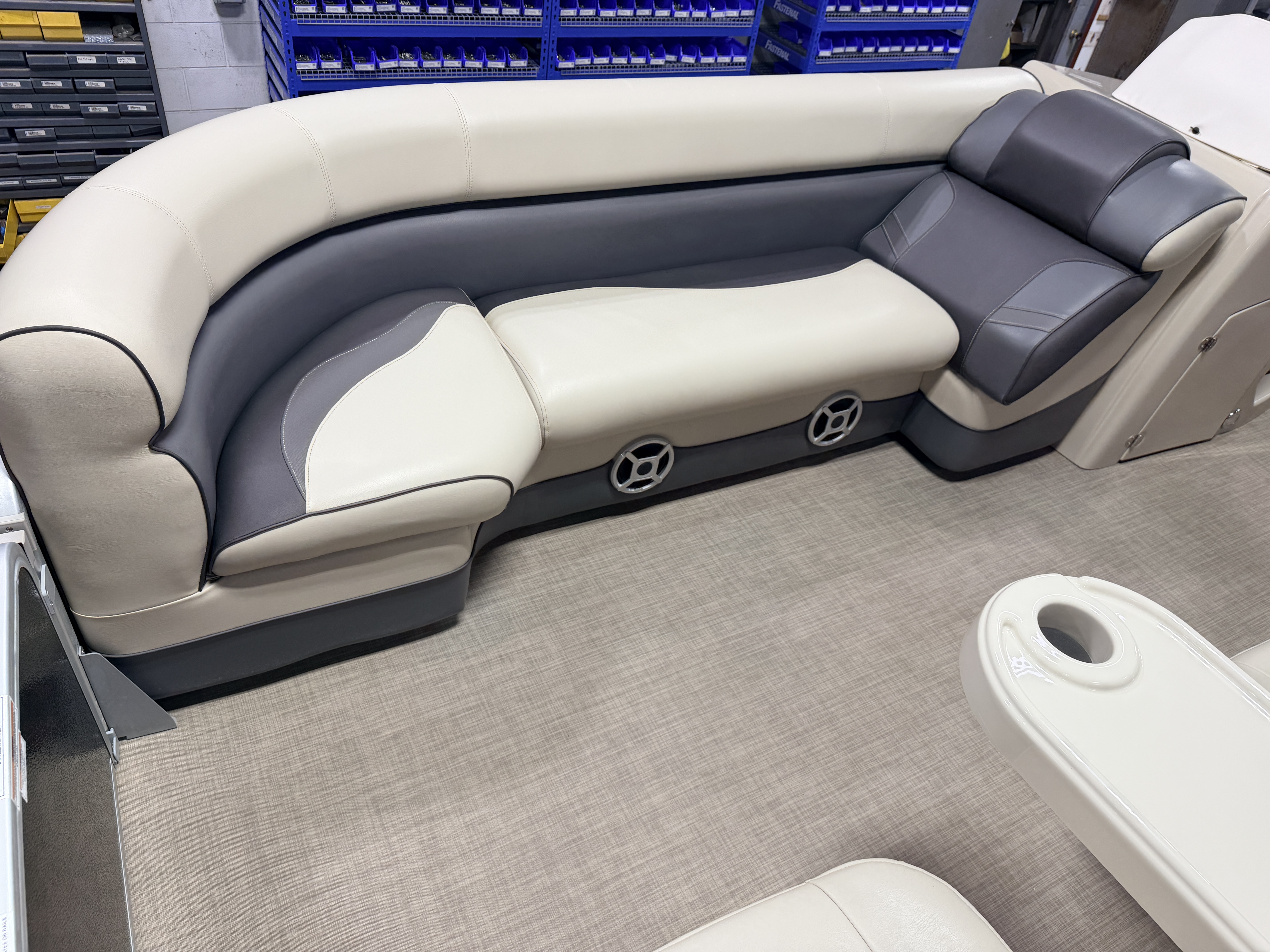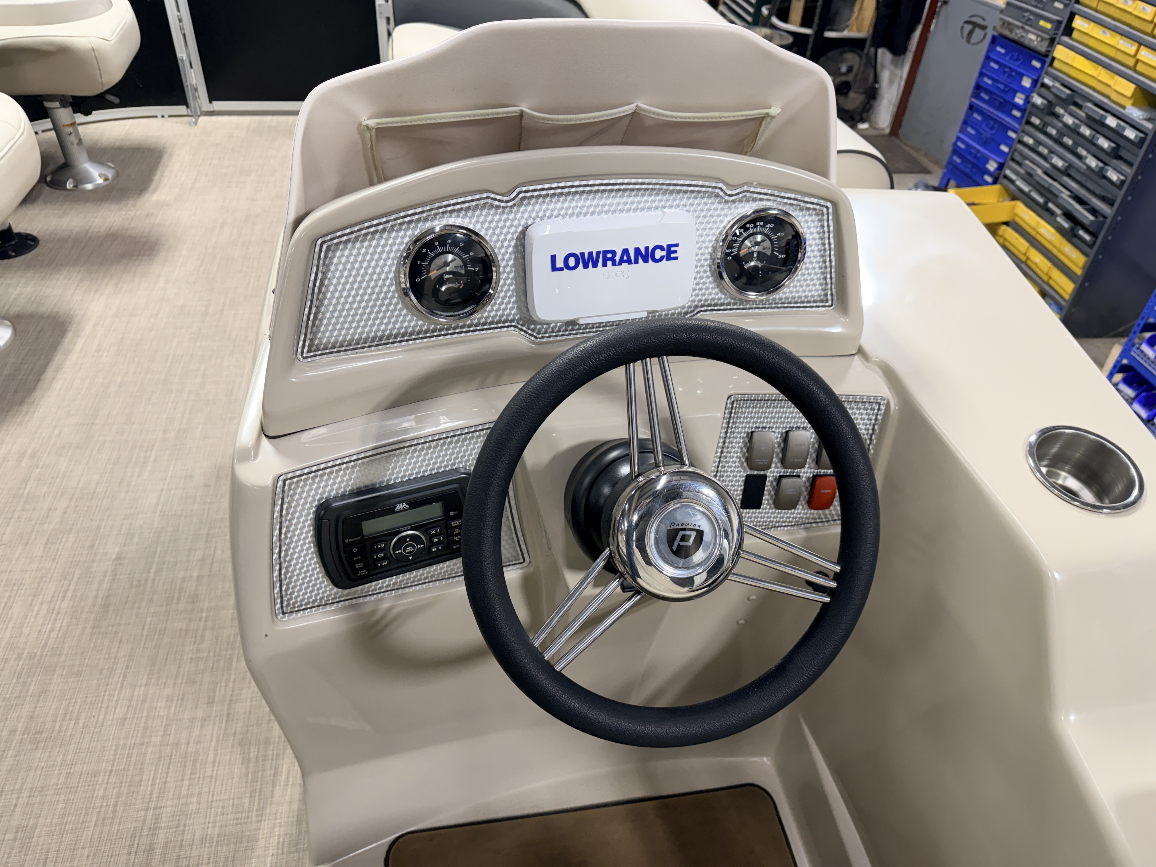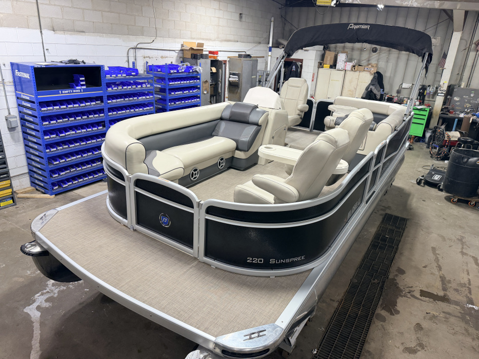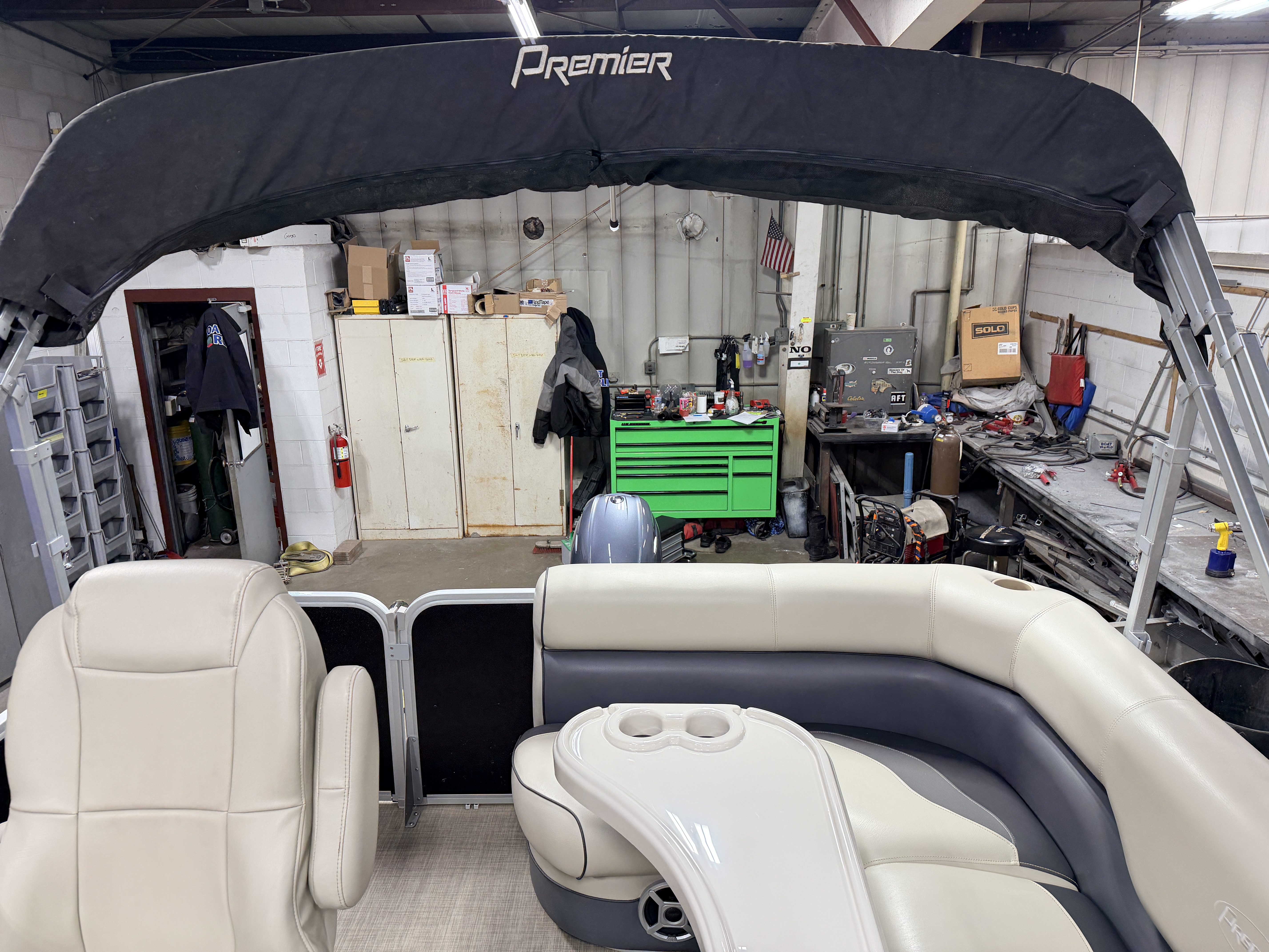 2018 Premier 220 SunSpree Pontoon with 50HP Yamaha Fourstroke EFI Outboard. This cruise model pontoon also features a DL group. This is a Dual Lounge chair option which turns a couch into 2 captain's chairs with a table between them. The Starboard side has a lounge style couch with storage under the lounge backrest. This is up against the helm which features a Speedometer, Tachometer, Fuel and Trim gauge. There is a Lowrance Hook 4x GPS depth/fish finder. There is a Marine Audio Bluetooth audio stereo system. This unit features a vinyl sleeve over the windshield with pockets for small item storage. There is a courtesy light on the side of the helm. Back on the port side, there is a L-shaped couch with a trash can in the lounge backrest and a (re)movable table. The rear entry gate on the starboard side leads to a stern swim platform and fold down swim ladder. There is also a swim platform on the front.