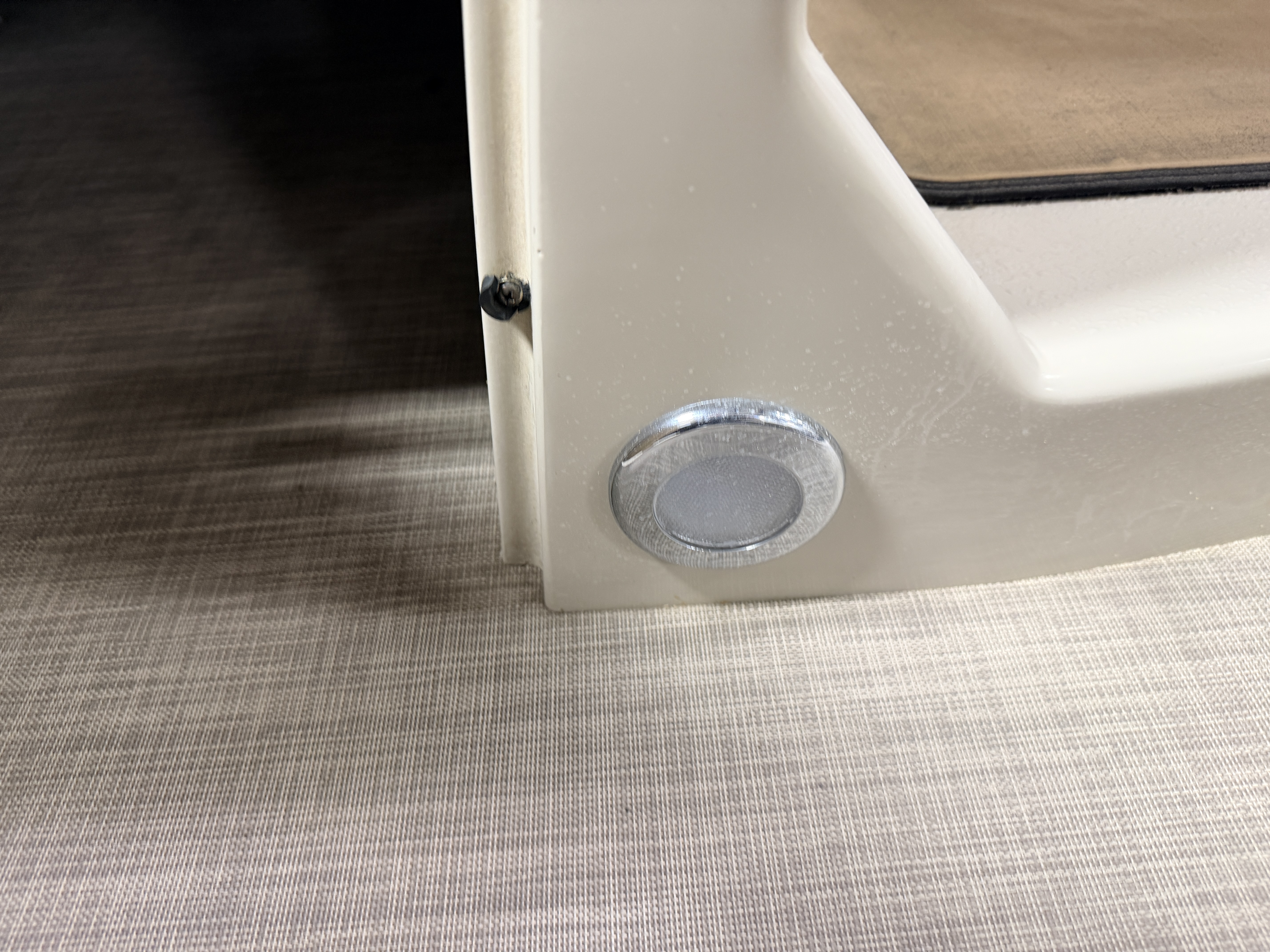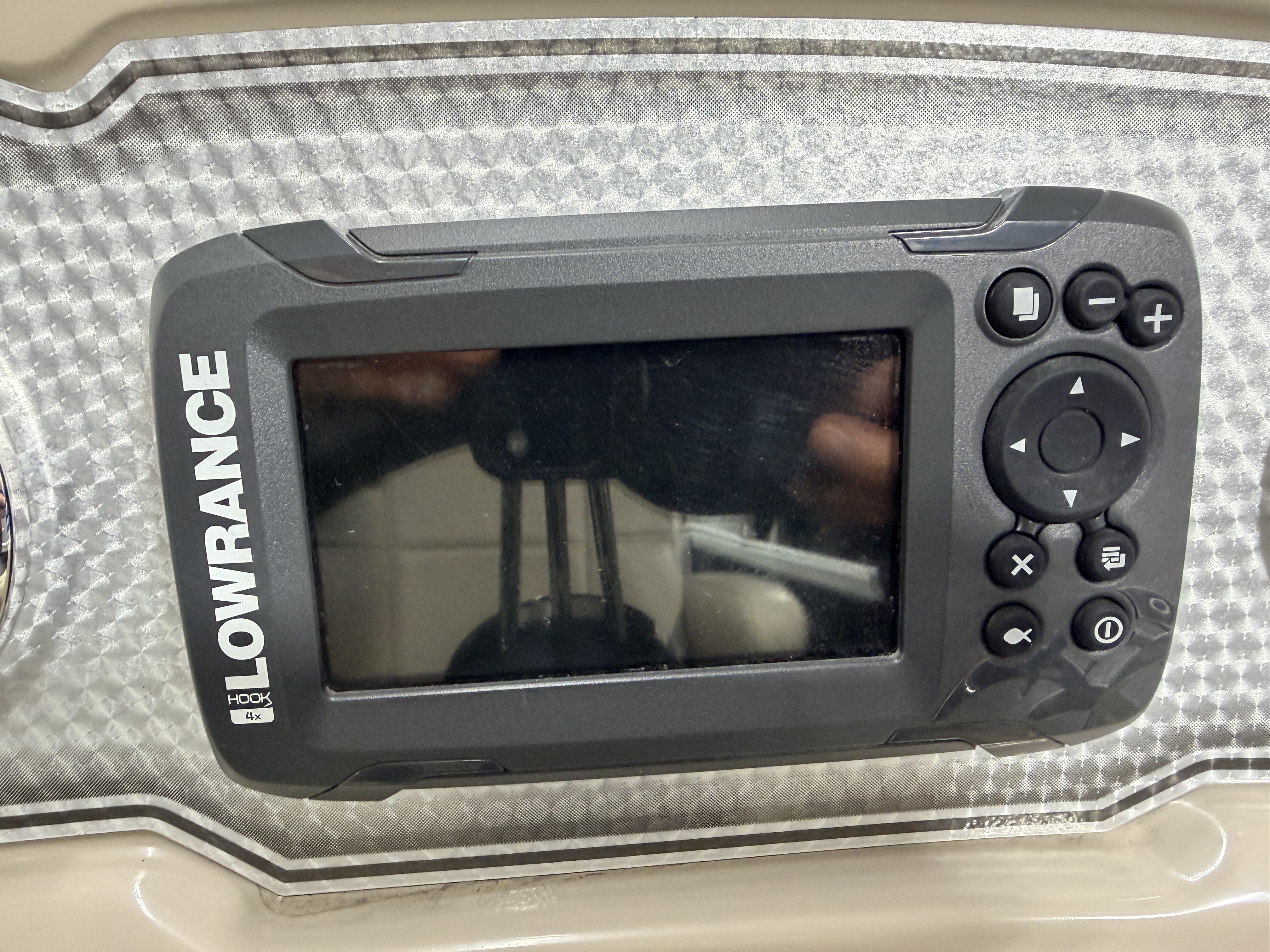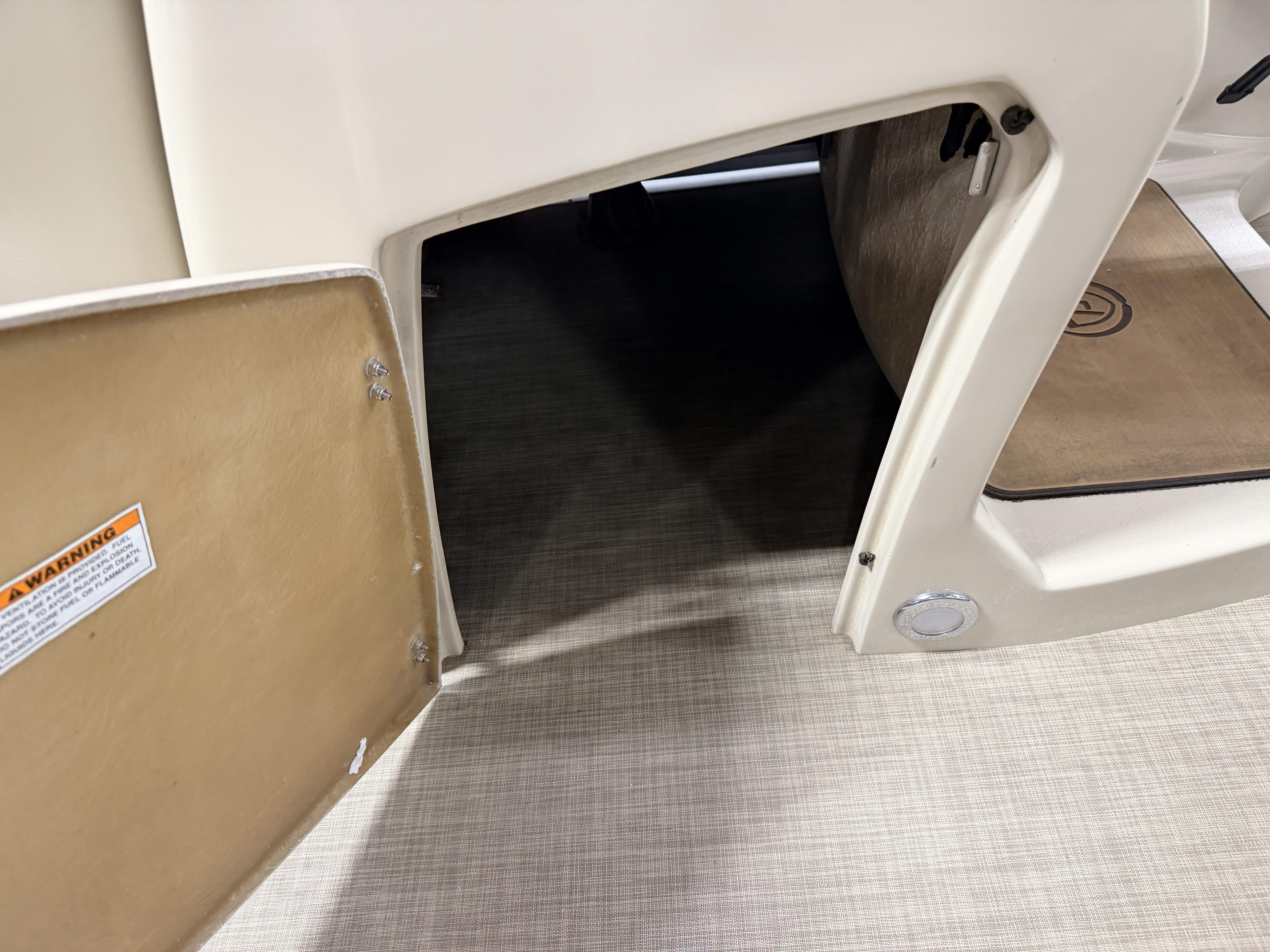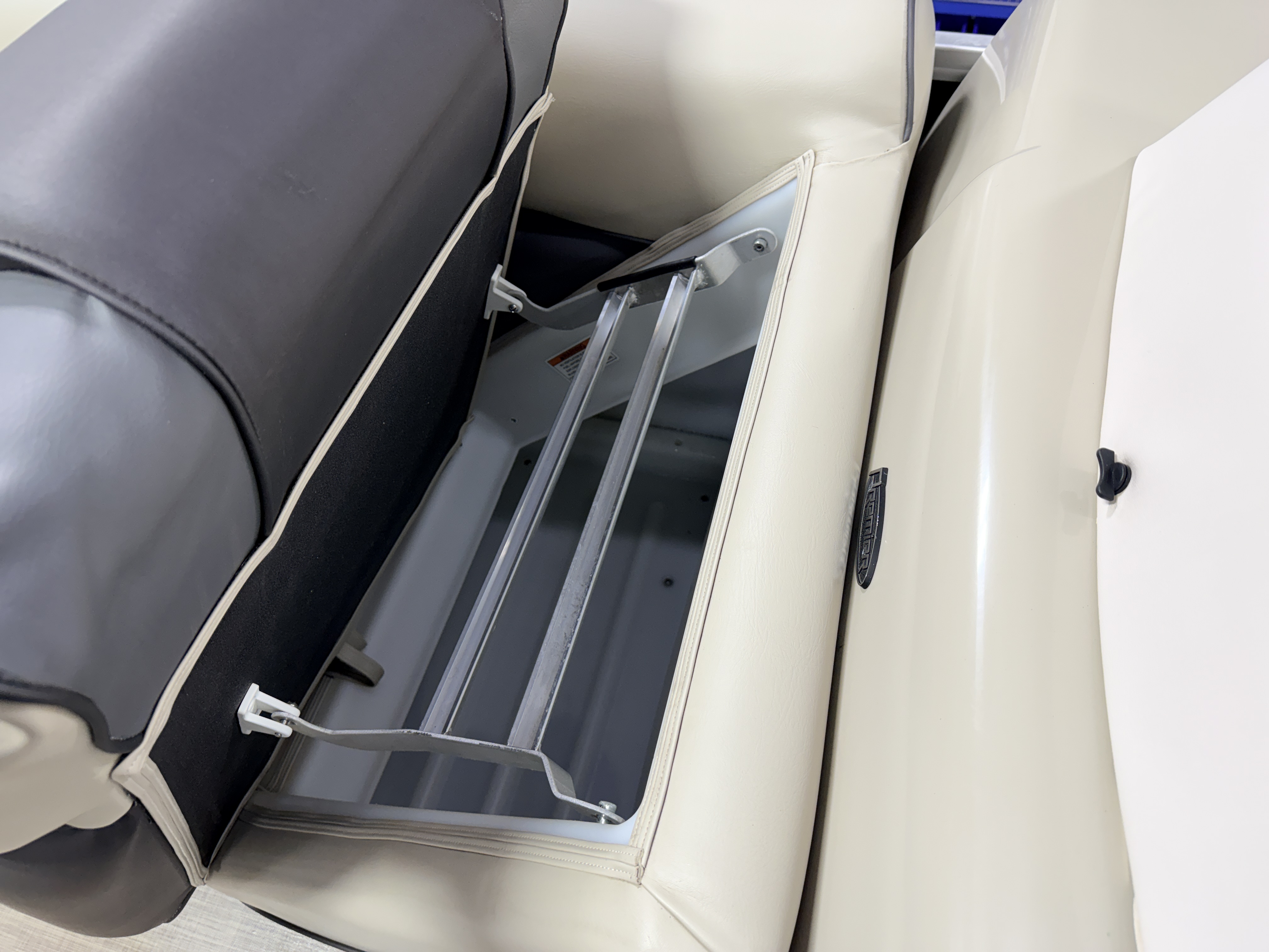 2018 Premier 220 SunSpree Pontoon with 50HP Yamaha Fourstroke EFI Outboard. This cruise model pontoon also features a DL group. This is a Dual Lounge chair option which turns a couch into 2 captain's chairs with a table between them. The Starboard side has a lounge style couch with storage under the lounge backrest. This is up against the helm which features a Speedometer, Tachometer, Fuel and Trim gauge. There is a Lowrance Hook 4x GPS depth/fish finder. There is a Marine Audio Bluetooth audio stereo system. This unit features a vinyl sleeve over the windshield with pockets for small item storage. There is a courtesy light on the side of the helm. Back on the port side, there is a L-shaped couch with a trash can in the lounge backrest and a (re)movable table. The rear entry gate on the starboard side leads to a stern swim platform and fold down swim ladder. There is also a swim platform on the front.