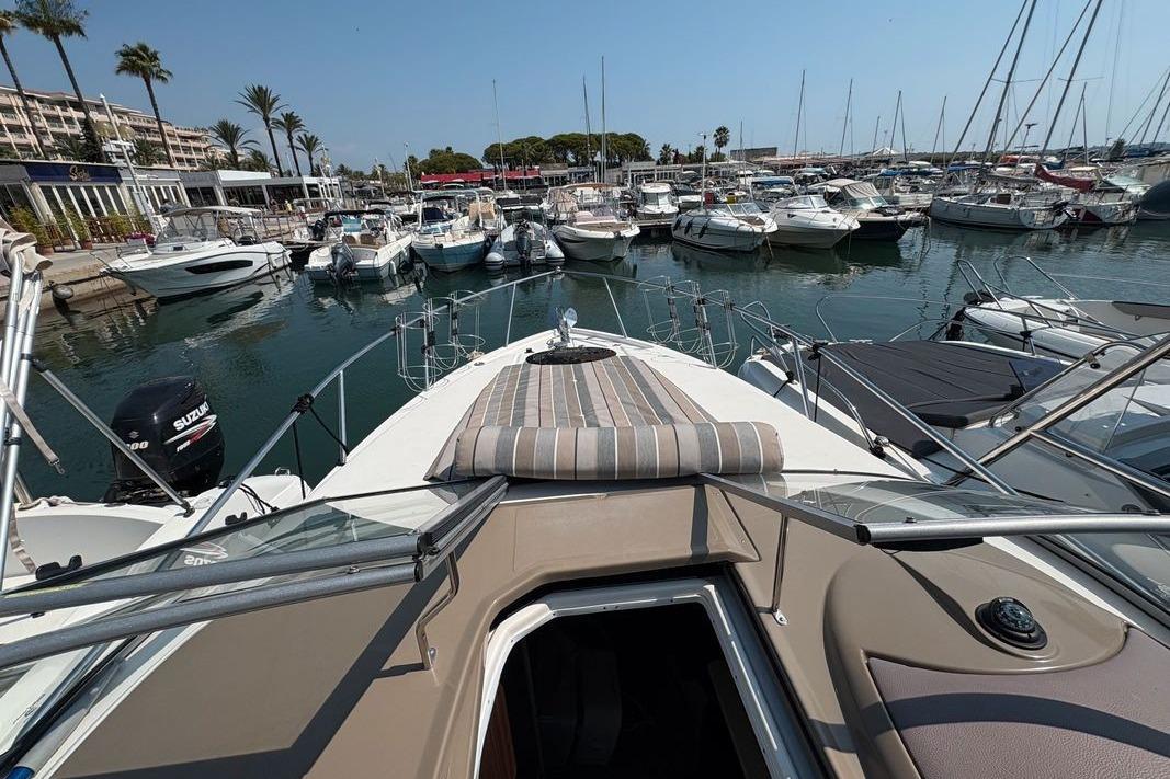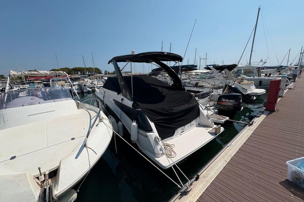 Meticulously maintained, winterized every season · service records/invoices available · primarily freshwater use (brought to sea ~3 weeks/year) · inflatable tender with engine included · portable “motorhome-type” A/C included · currently in Golfe-Juan (seller notes a berth for the year—confirm availability)