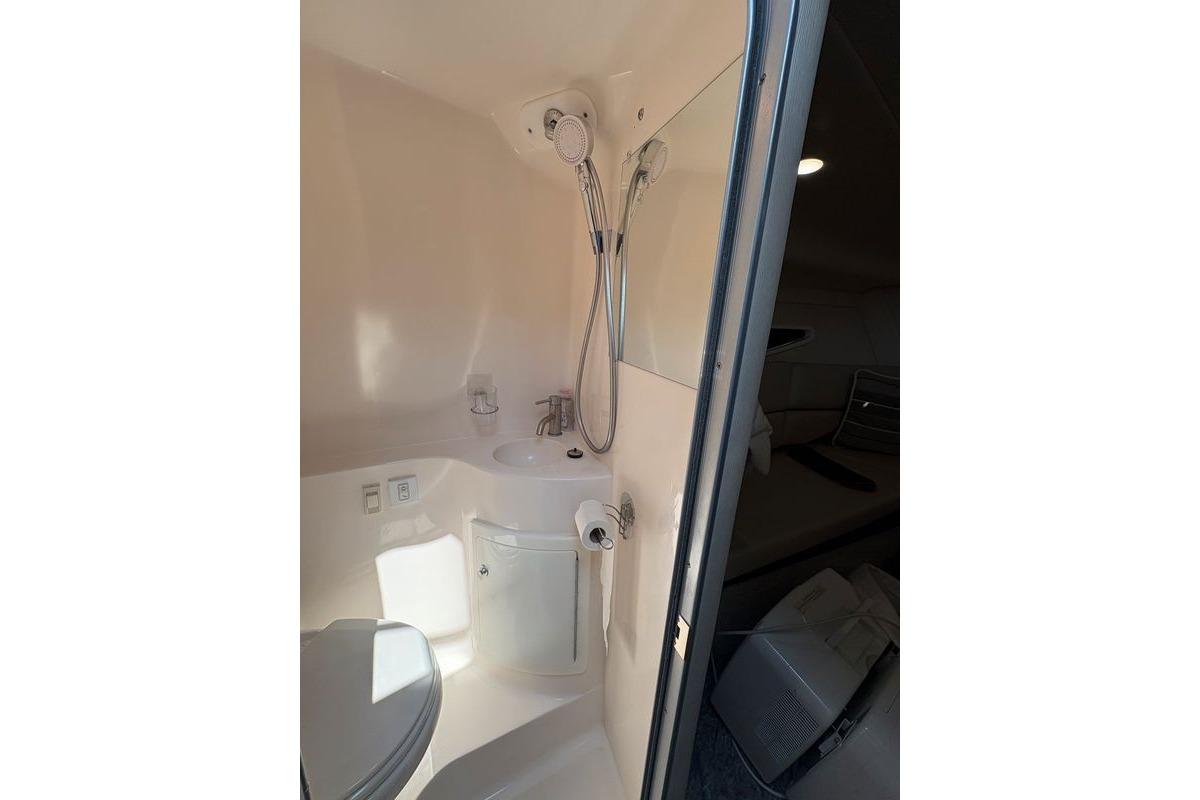 Below, the convertible forward berth turns from lounge to double bed in seconds, and the galley (fridge, microwave, cooktop, sink) supports relaxed overnights. An enclosed head with electric marine toilet and shower adds true weekender utility. With low hours, largely freshwater history, recent seasonal servicing and valuable extras (tender + portable A/C), this 26 Express shows as a turnkey, well-kept cruiser.