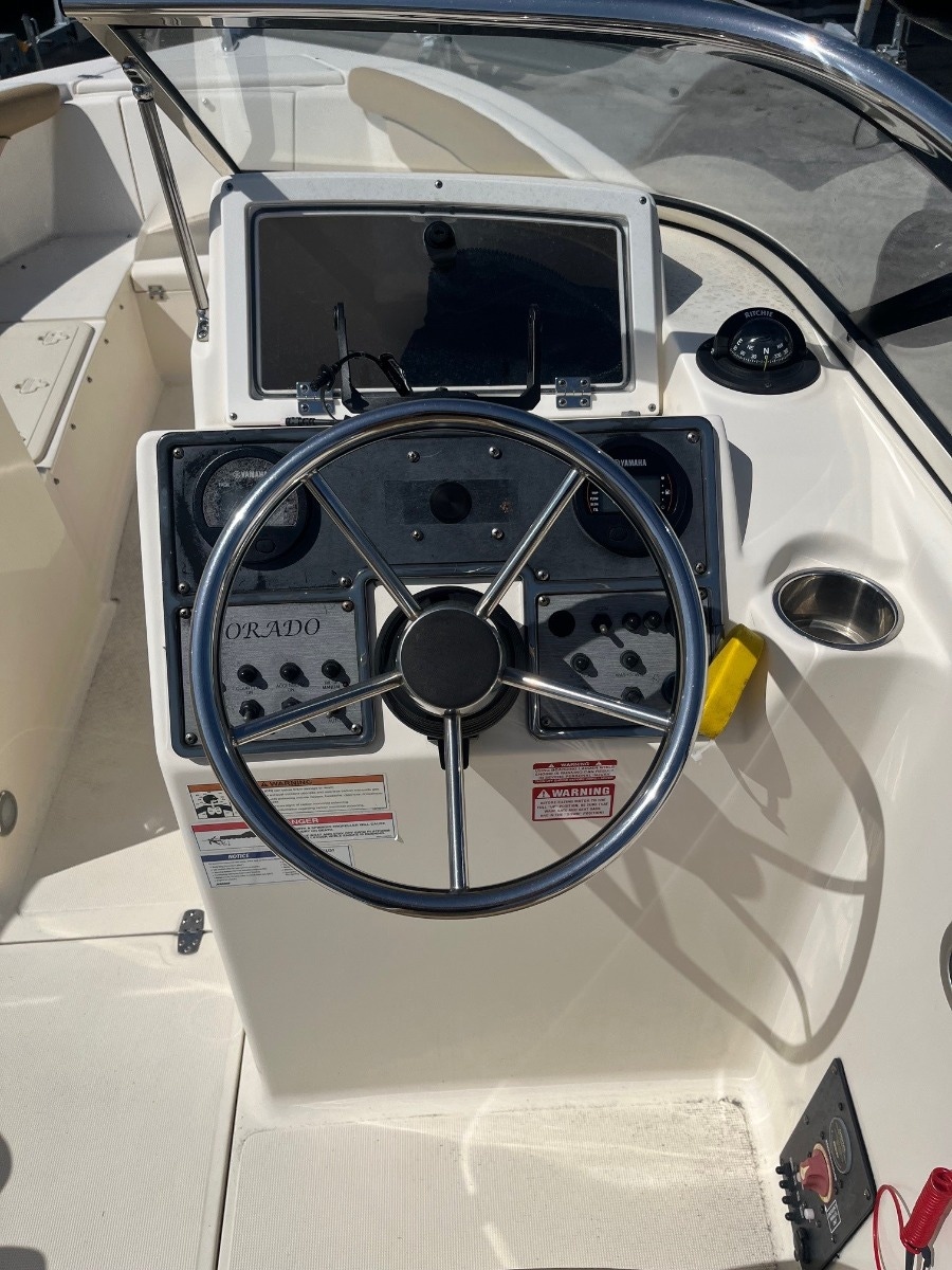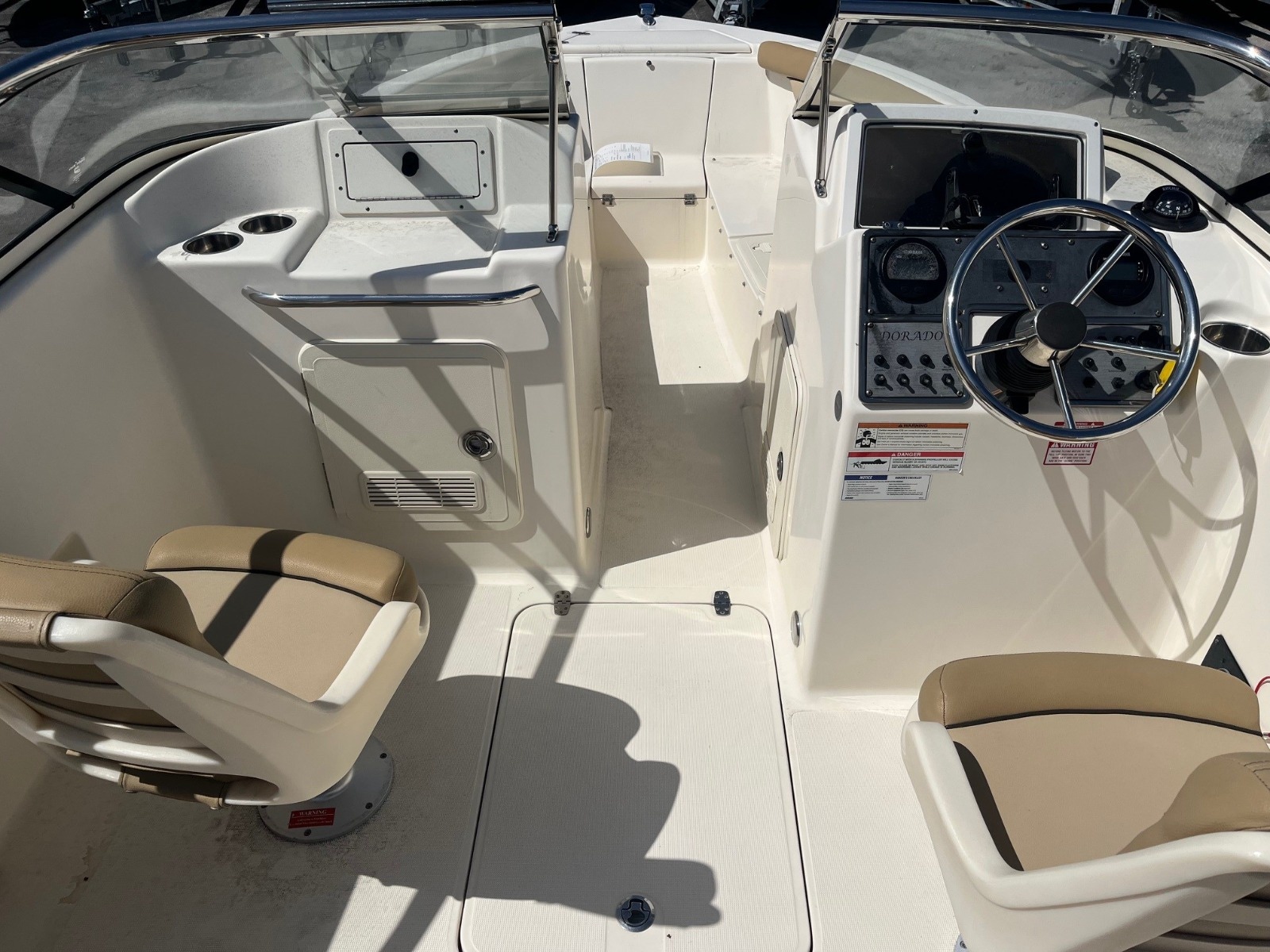 The 210 Dorado is perfectly suited for any activity out on the water and is backed by reliable Yamaha power. Standard features include port and starboard transom swim platforms with boarding ladder, a removable stern seat / wave gate that make it ideal for landing the catch of the day, or just enjoying a day of swimming and diving, a smartly-designed fold-down table with hideaway cooler underneath, captain’s chairs and a stainless steel full bow rail for added safety. Price Includes Trailer.