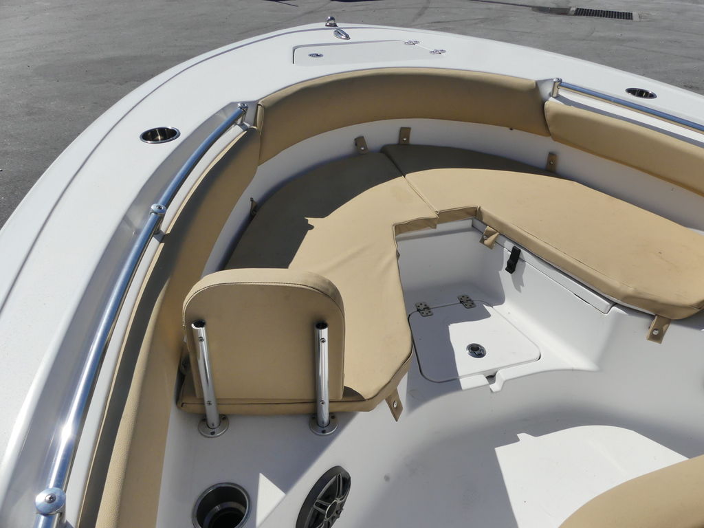 Console Front CoolerFlip the bottom cushion of the console-front seat to reveal an insulated cooler. Conveniently located for those sitting up front. You will also find the freshwater fill hidden under the cushion, if your boat is equipped with the freshwater system.