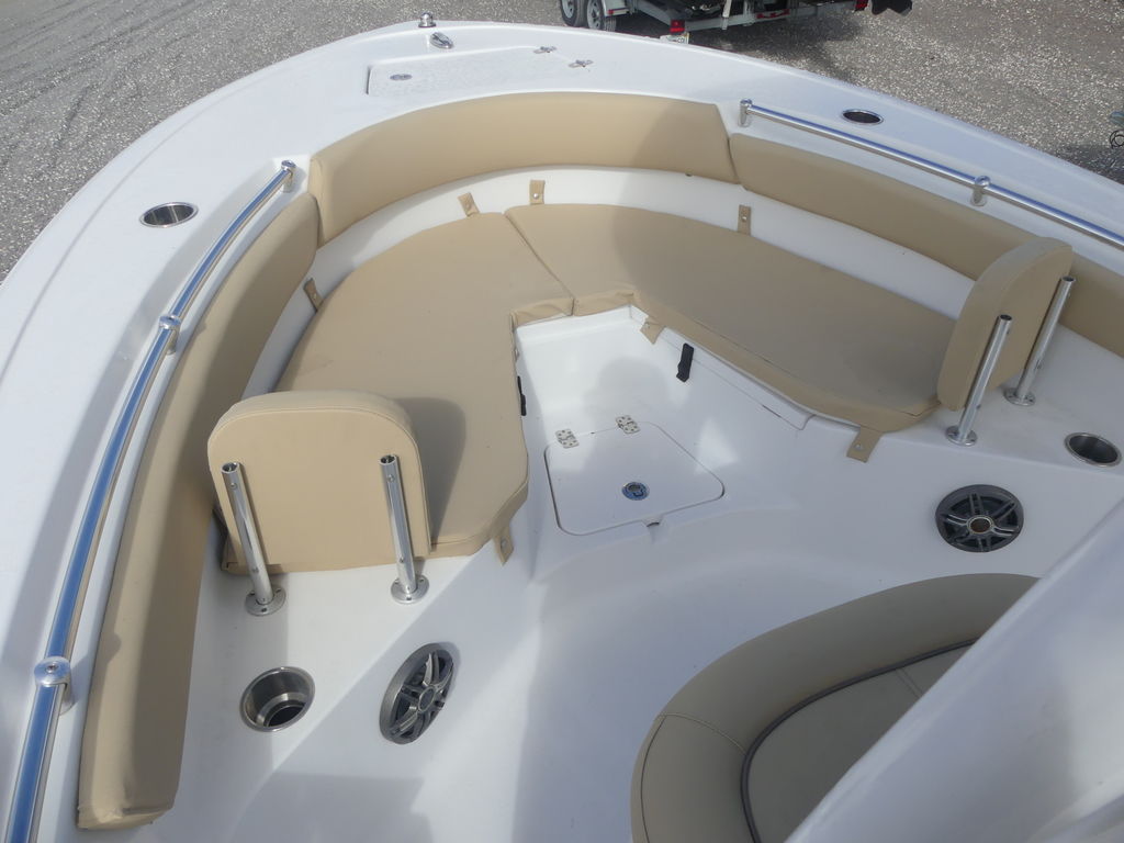 Comfortable Bow LayoutThe bow of this boat is designed with entertainment and versatility in mind. Features wrap around seating with all the cushions, removable backrests, 2 easily accessible large insulated fish boxes, drink holders and speakers to play your favorite tunes.