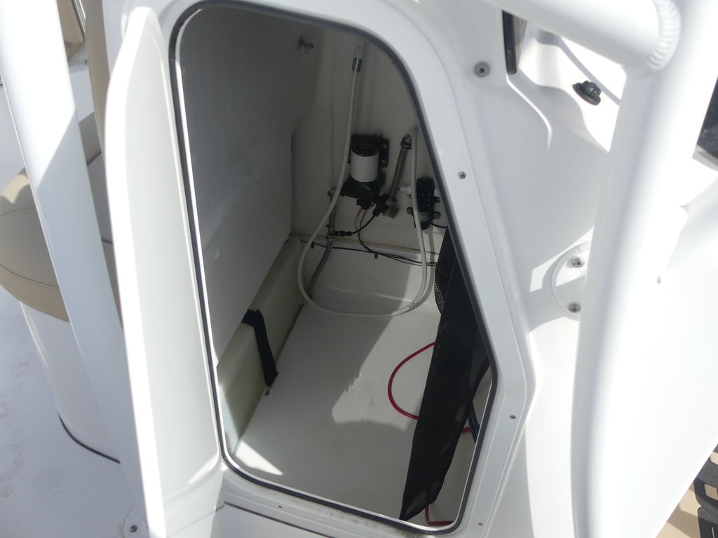 Console Front CoolerFlip the bottom cushion of the console-front seat to reveal an insulated cooler. Conveniently located for those sitting up front. You will also find the freshwater fill hidden under the cushion, if your boat is equipped with the freshwater system.