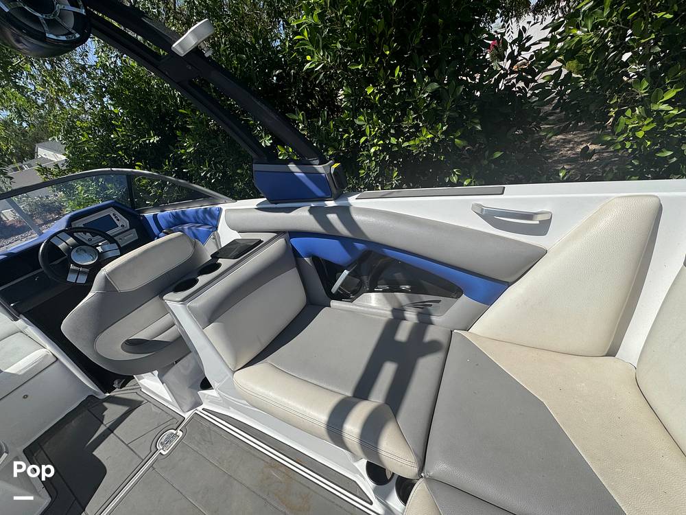 From the helm, the experience is modern and driver-focused. A touchscreen control system replaces the clutter of traditional gauges, letting the driver dial in speed, ballast, and wave shape with just a few taps. Paired with an Indmar Raptor 400 inboard engine, the boat delivers smooth, immediate power strong enough to pull riders effortlessly while maintaining precise control at surf speeds.