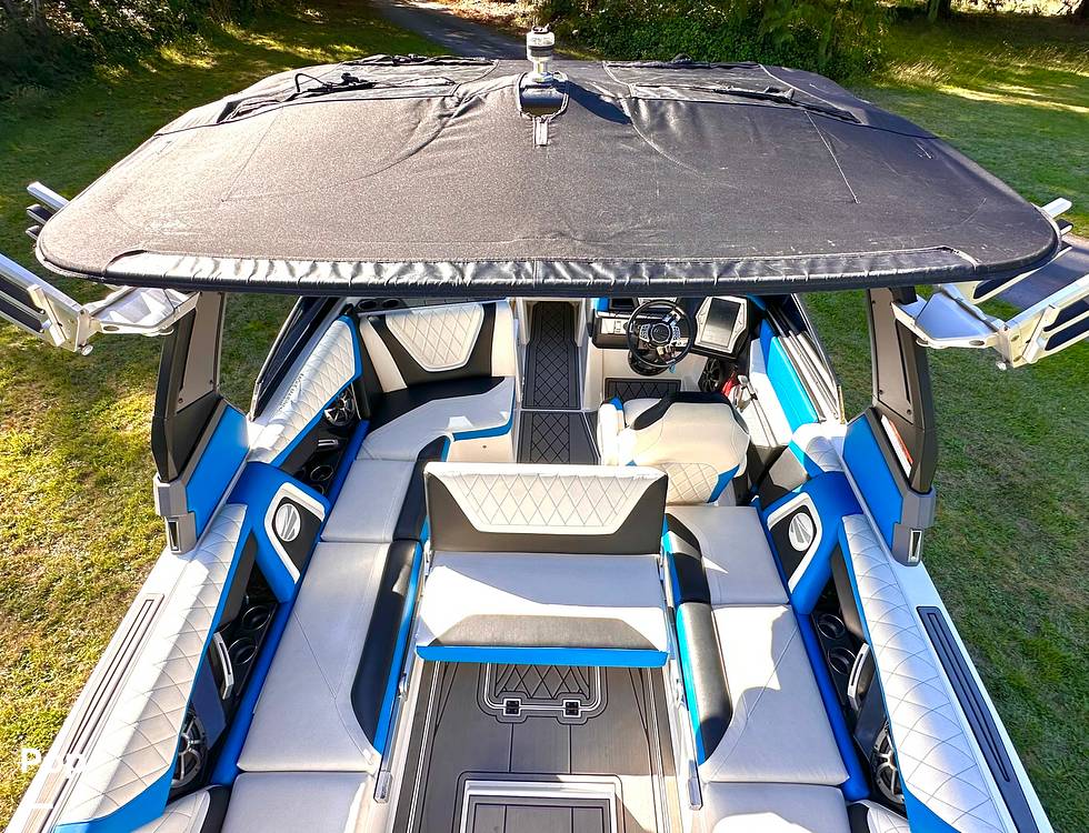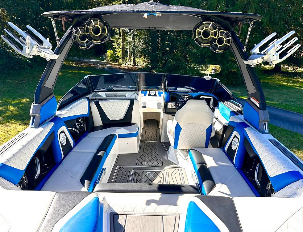 The boat also boasts a premium Wet Sound audio system, so you can enjoy your playlist in every corner of the boat. Create the perfect atmosphere with the touch of a button using the ambient recessed cabin lighting along with underwater lights that will set you apart from the average. The high-quality Alpha E2 Tower electronically lowers for easy storage, making this boat both stylish and practical.