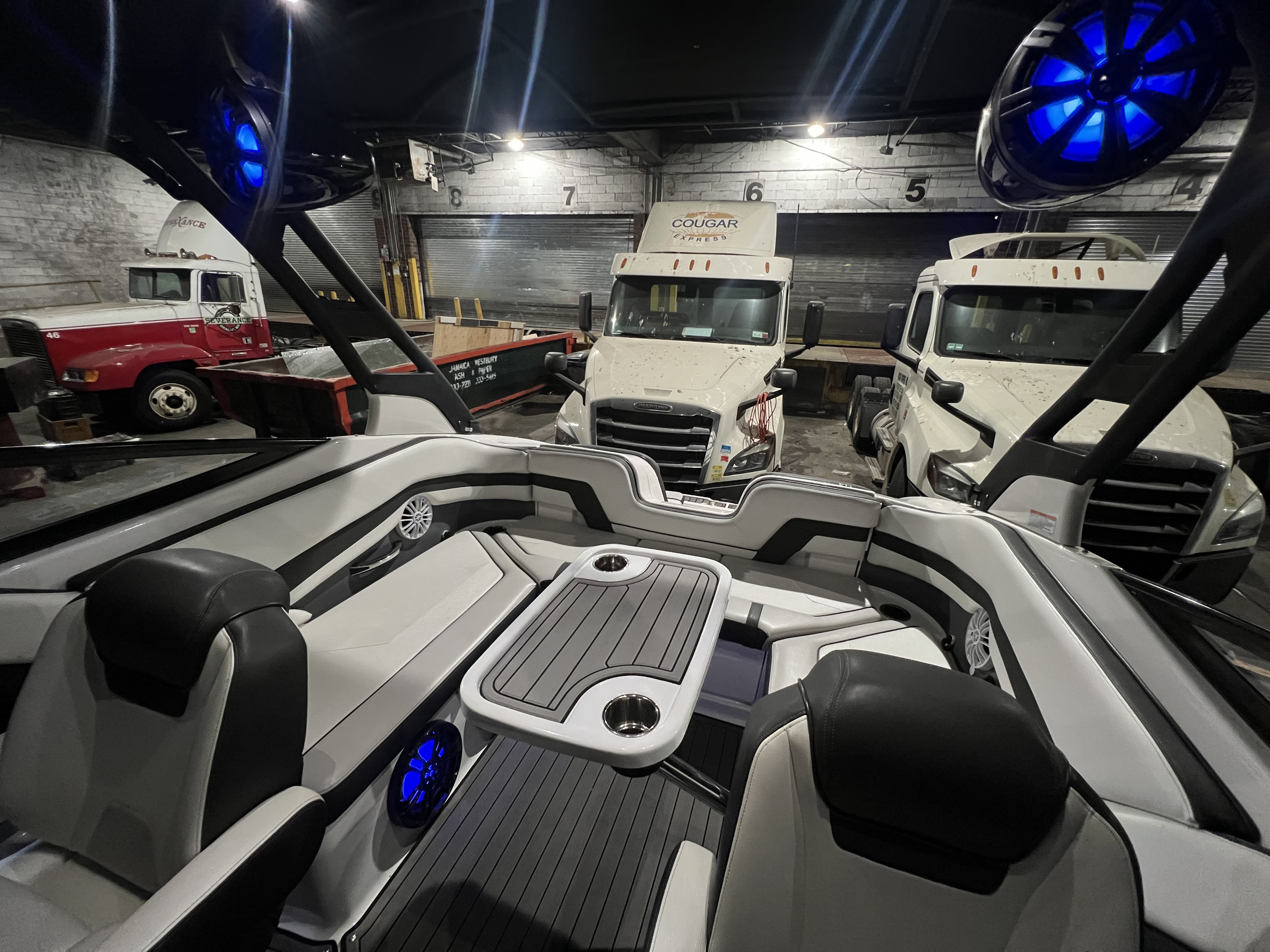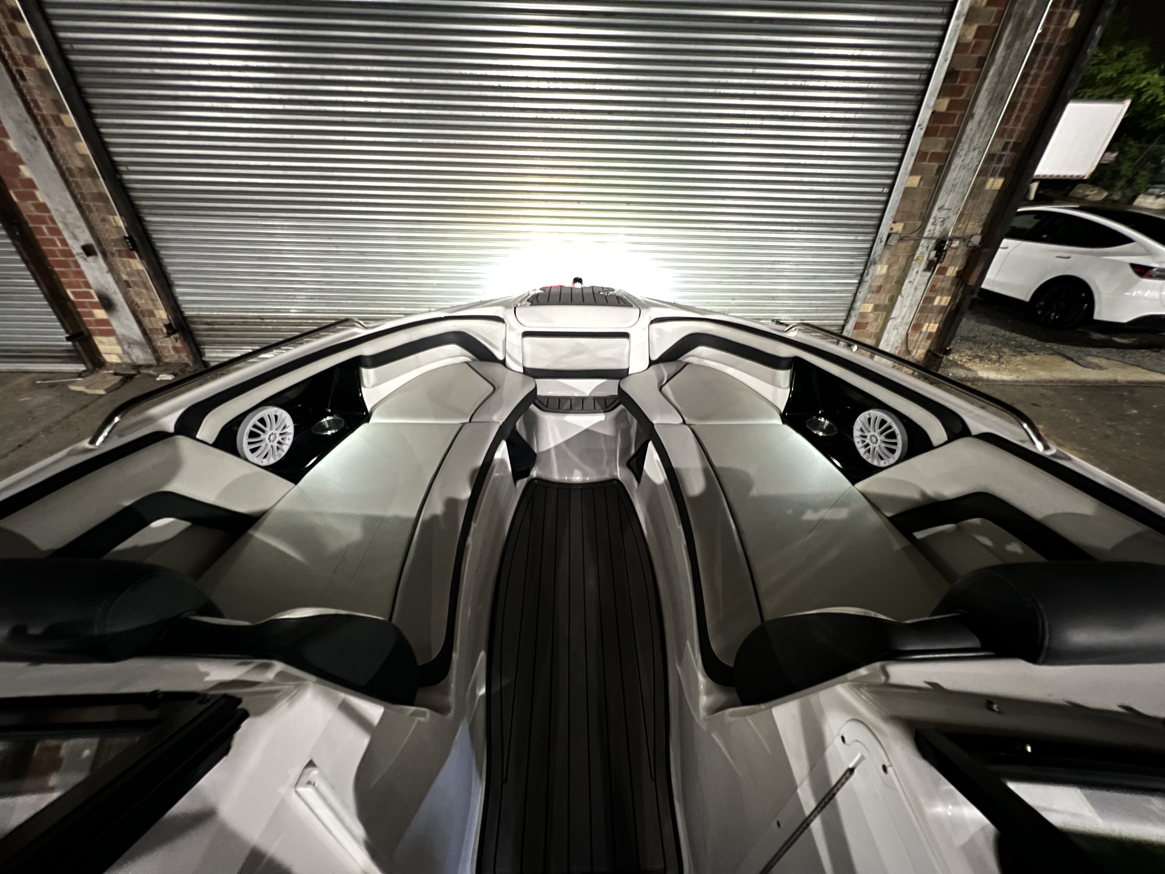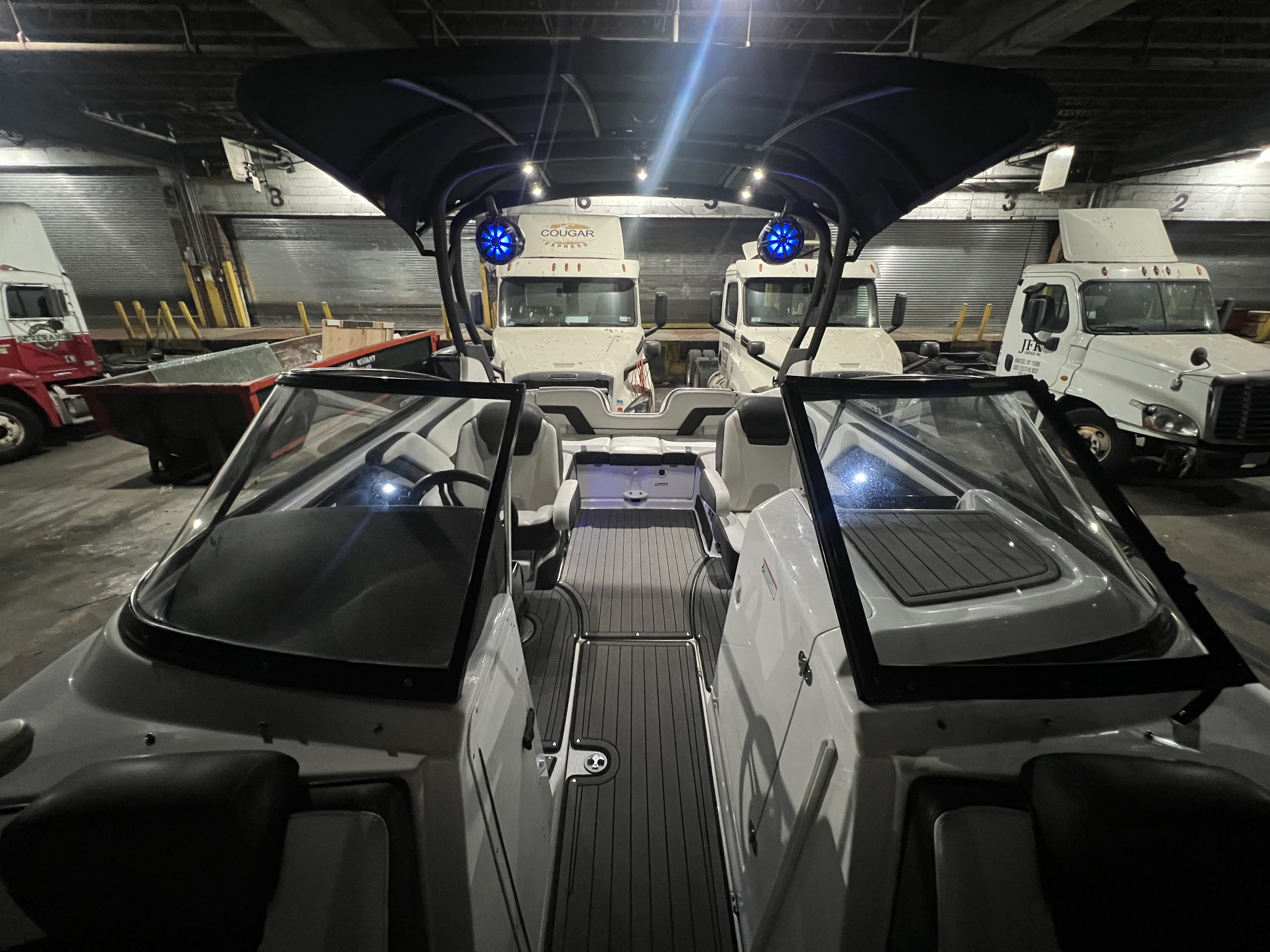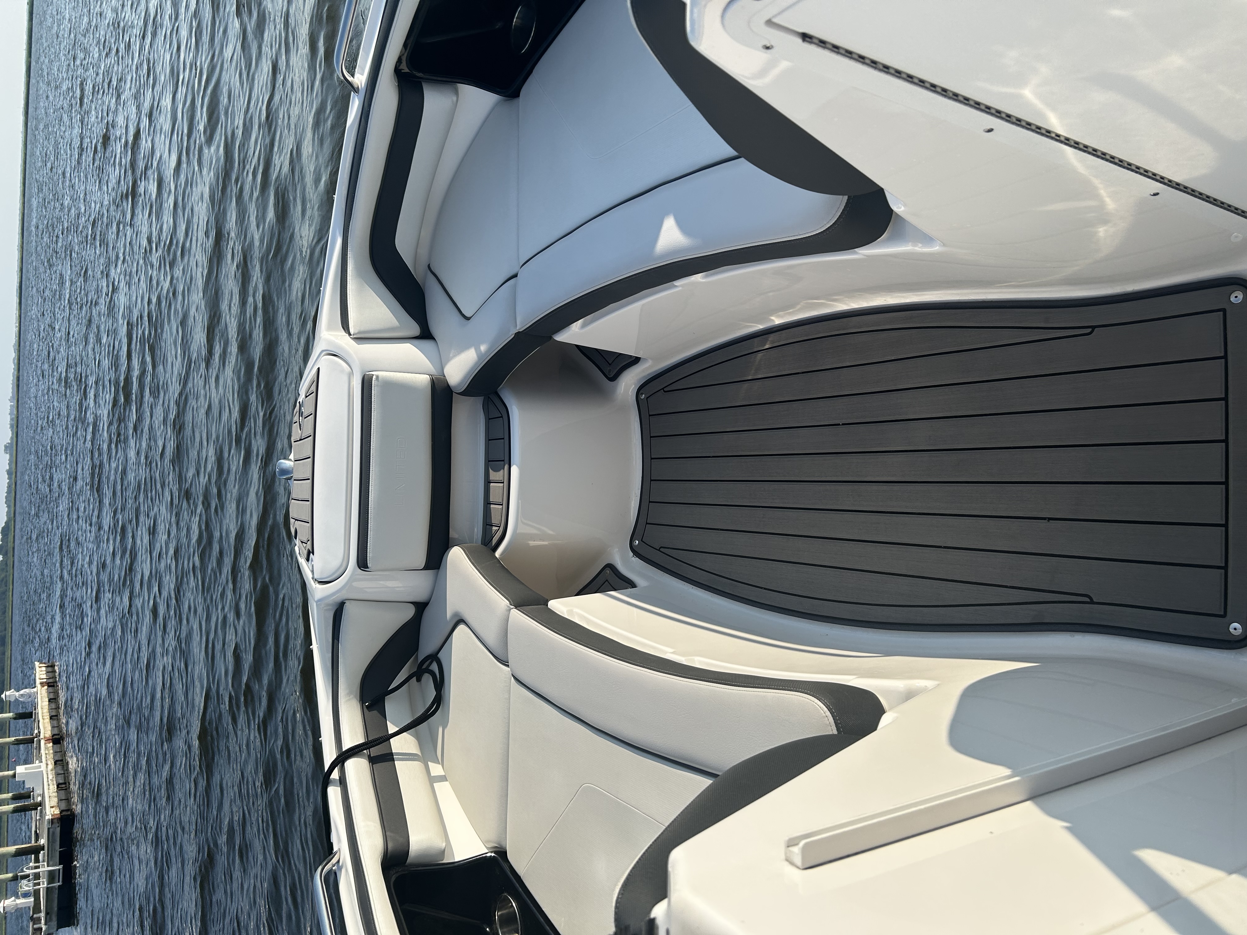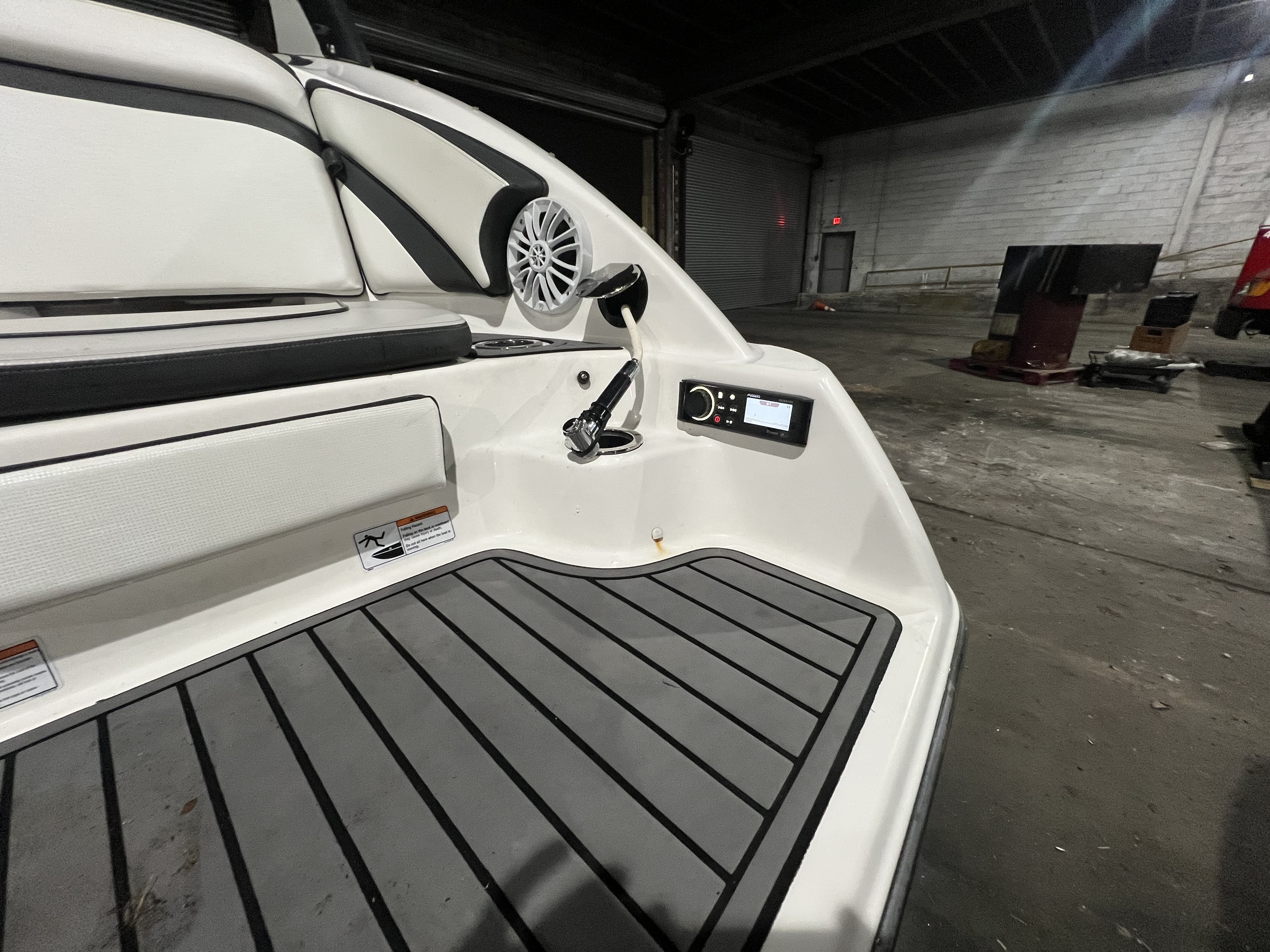 • Convenience: Retractable boarding ladders at bow and stern, fresh water shower on swim platform, dual 12V plugs (helm and swim platform), and snap-in marine-grade non-slip mats for easy cleaning