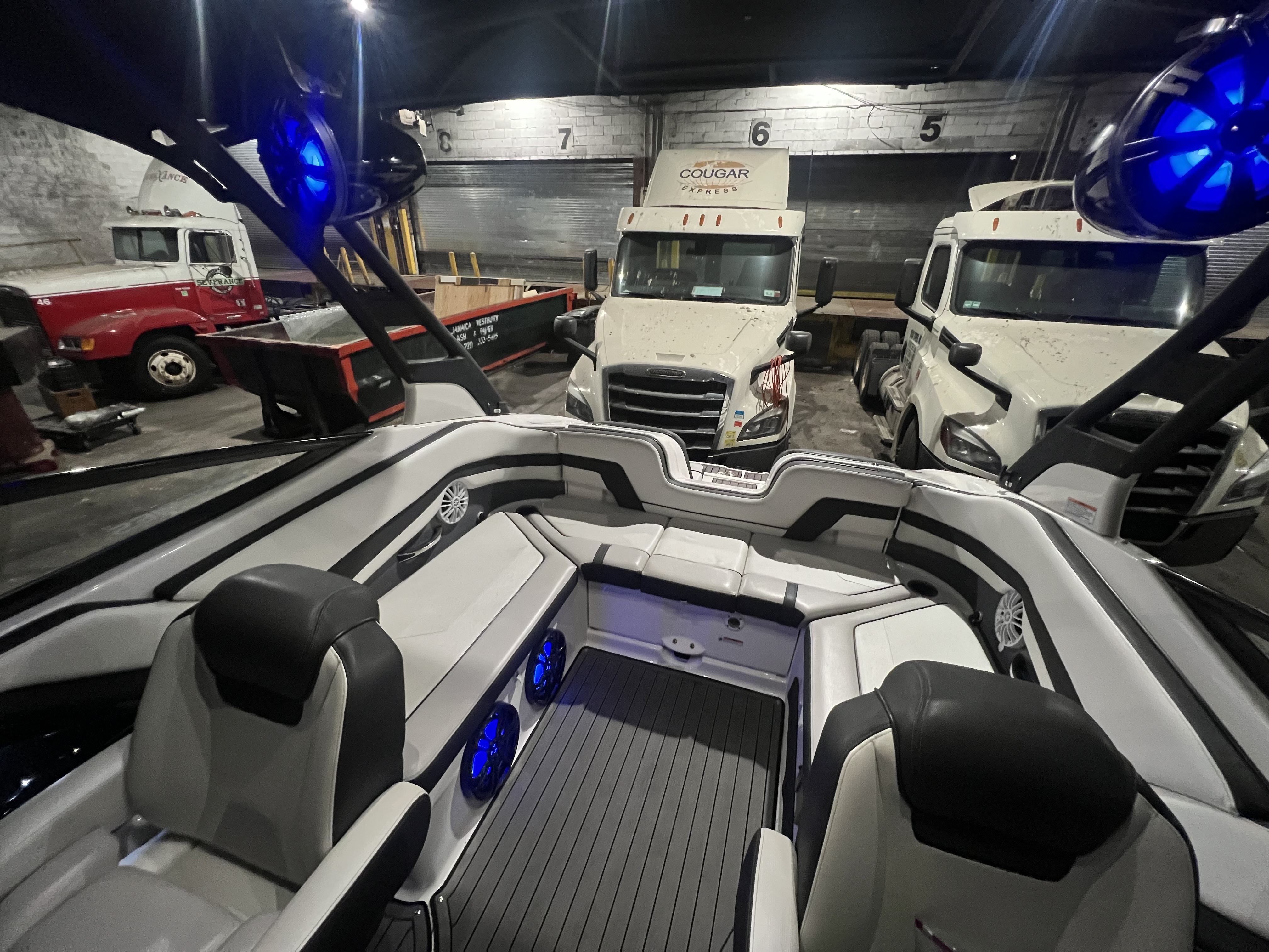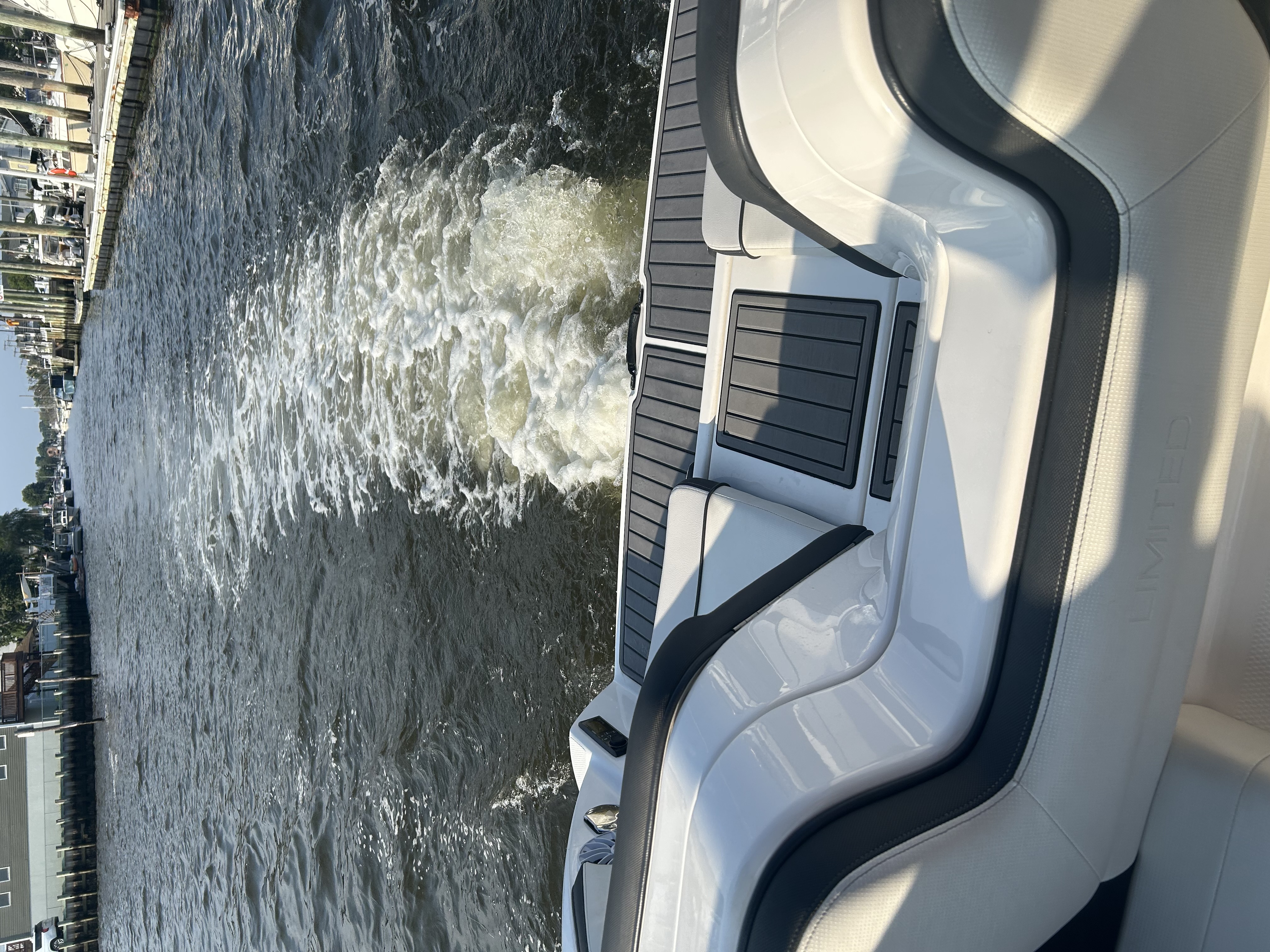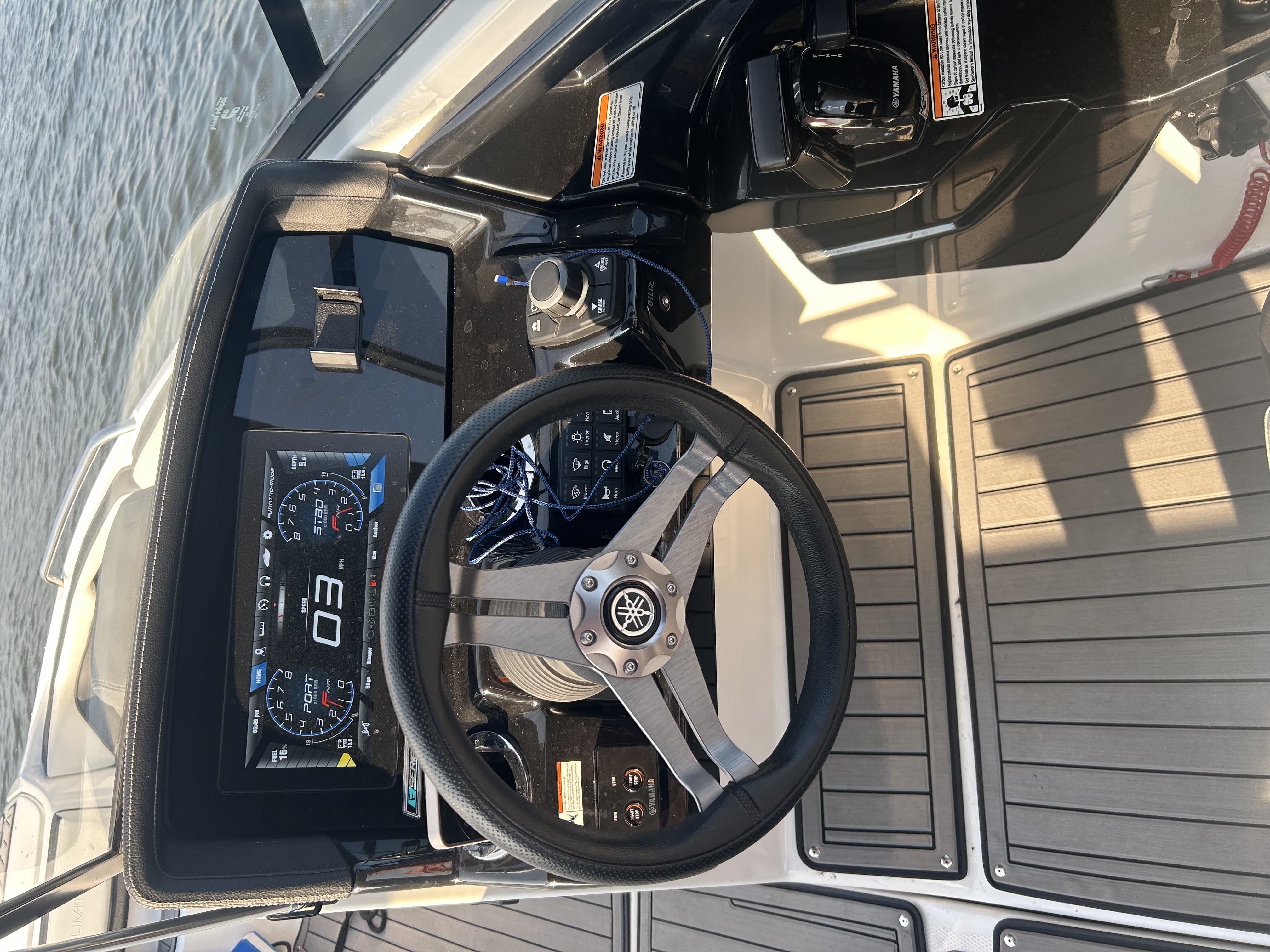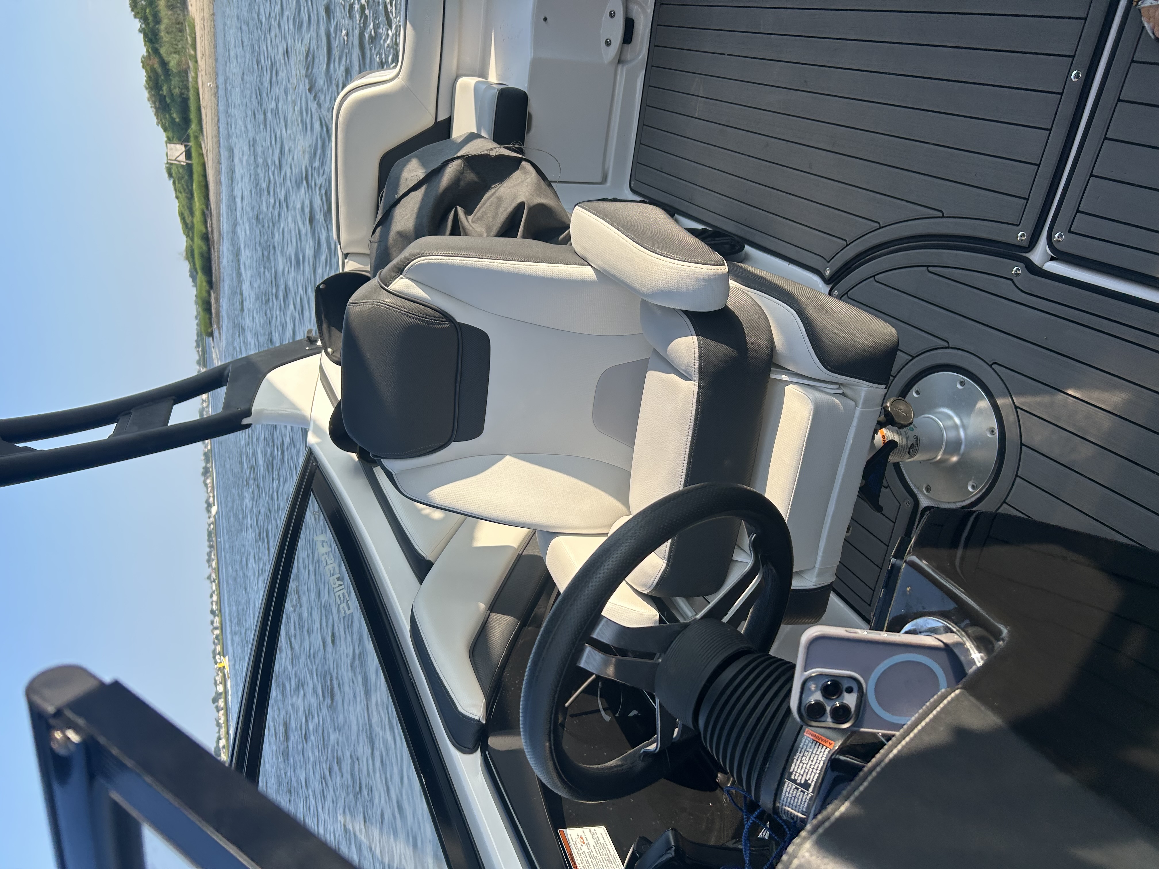 • Convenience: Retractable boarding ladders at bow and stern, fresh water shower on swim platform, dual 12V plugs (helm and swim platform), and snap-in marine-grade non-slip mats for easy cleaning